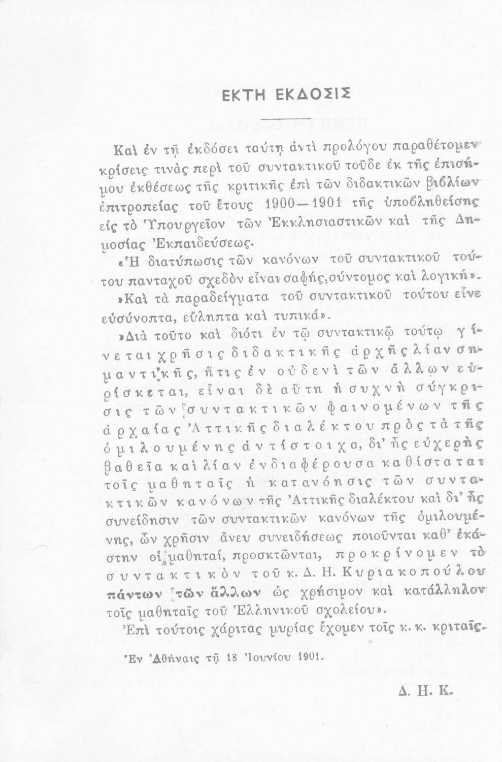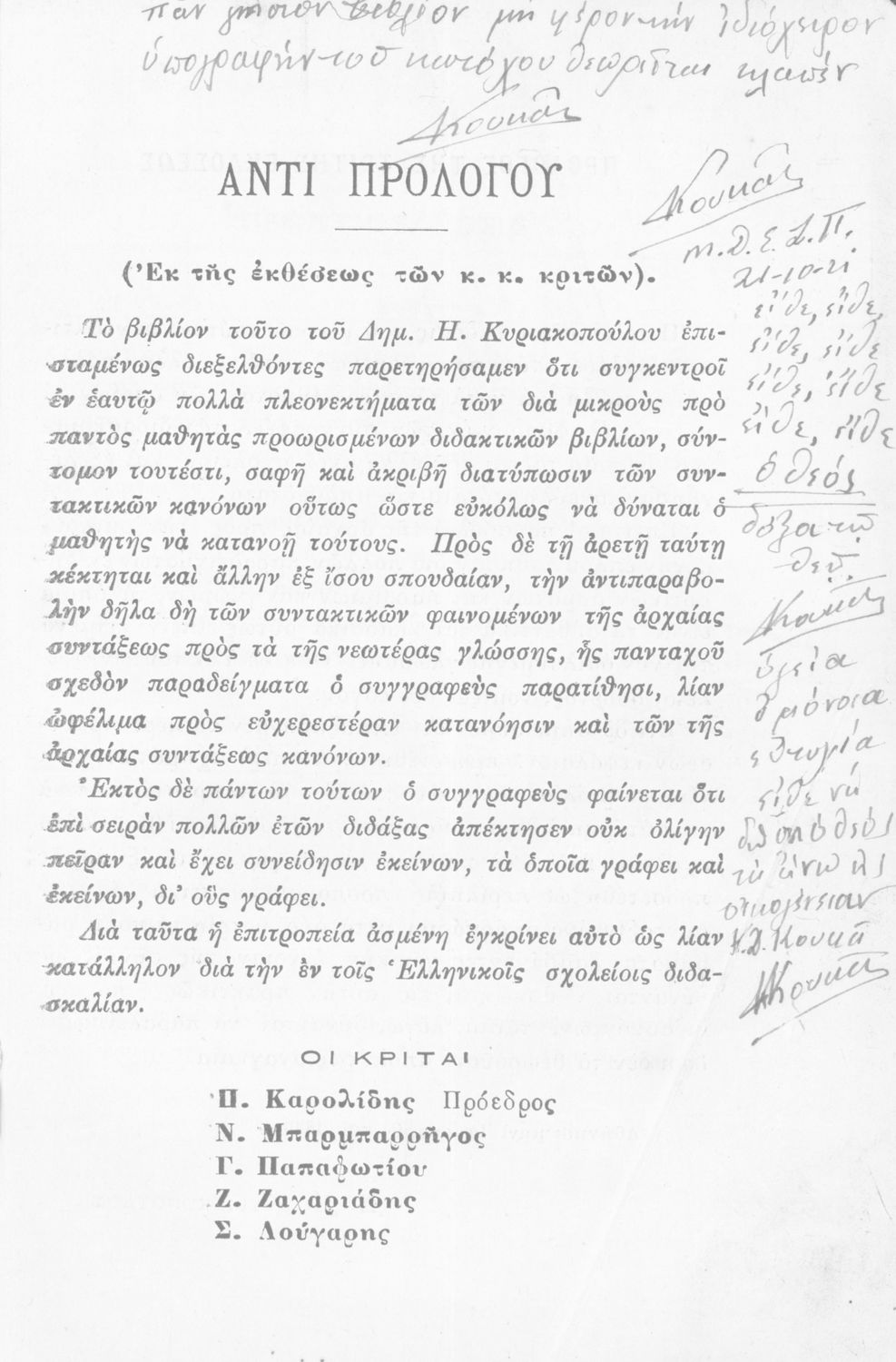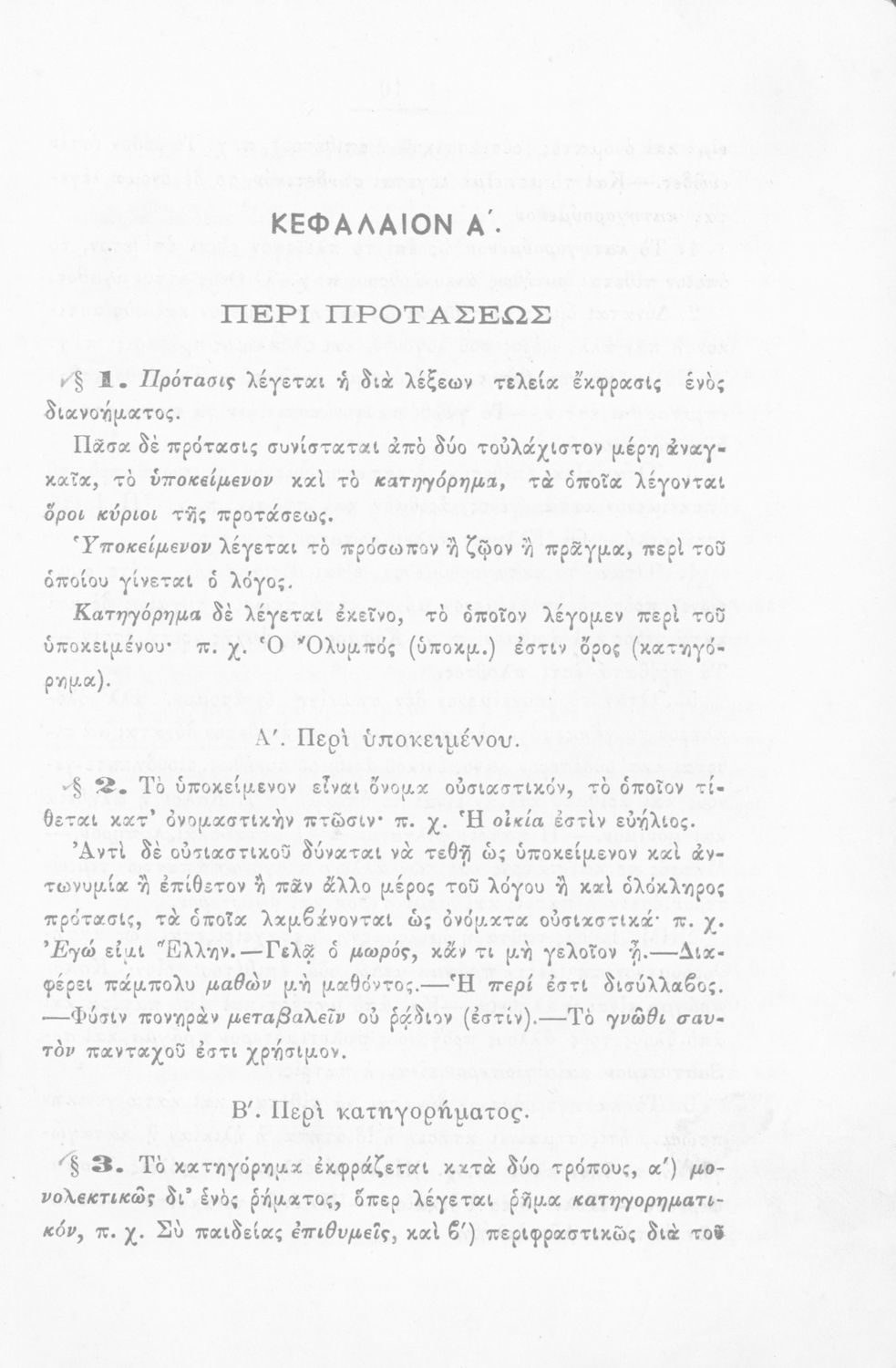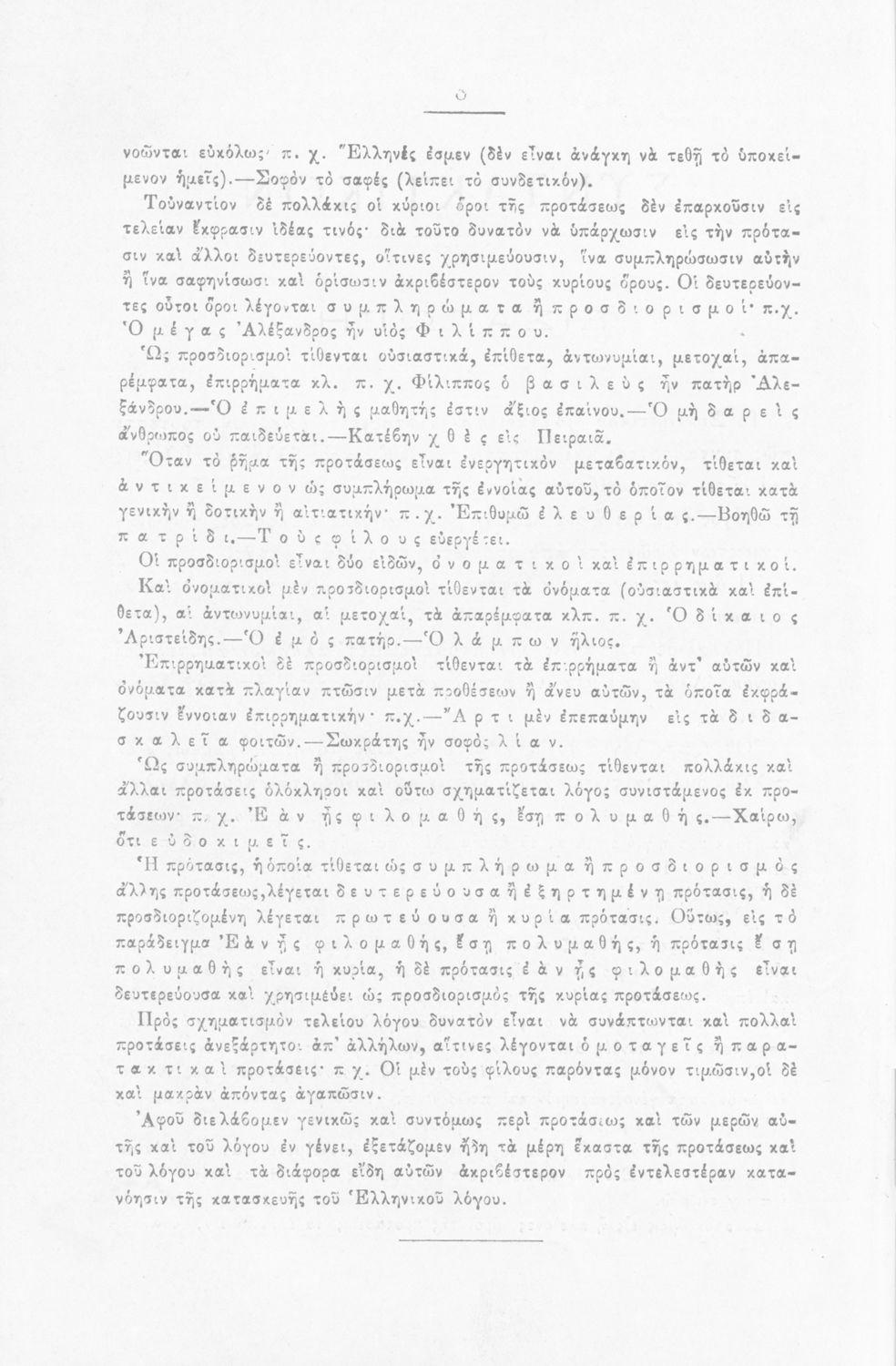 Σχολικό εγχειρίδιο Αρχαίων Ελληνικών για τους μαθητές των Ελληνικών Σχολείων και Παρθεναγωγείων που εξετάζει τα μέρη του λόγου και την σύνταξή τους.