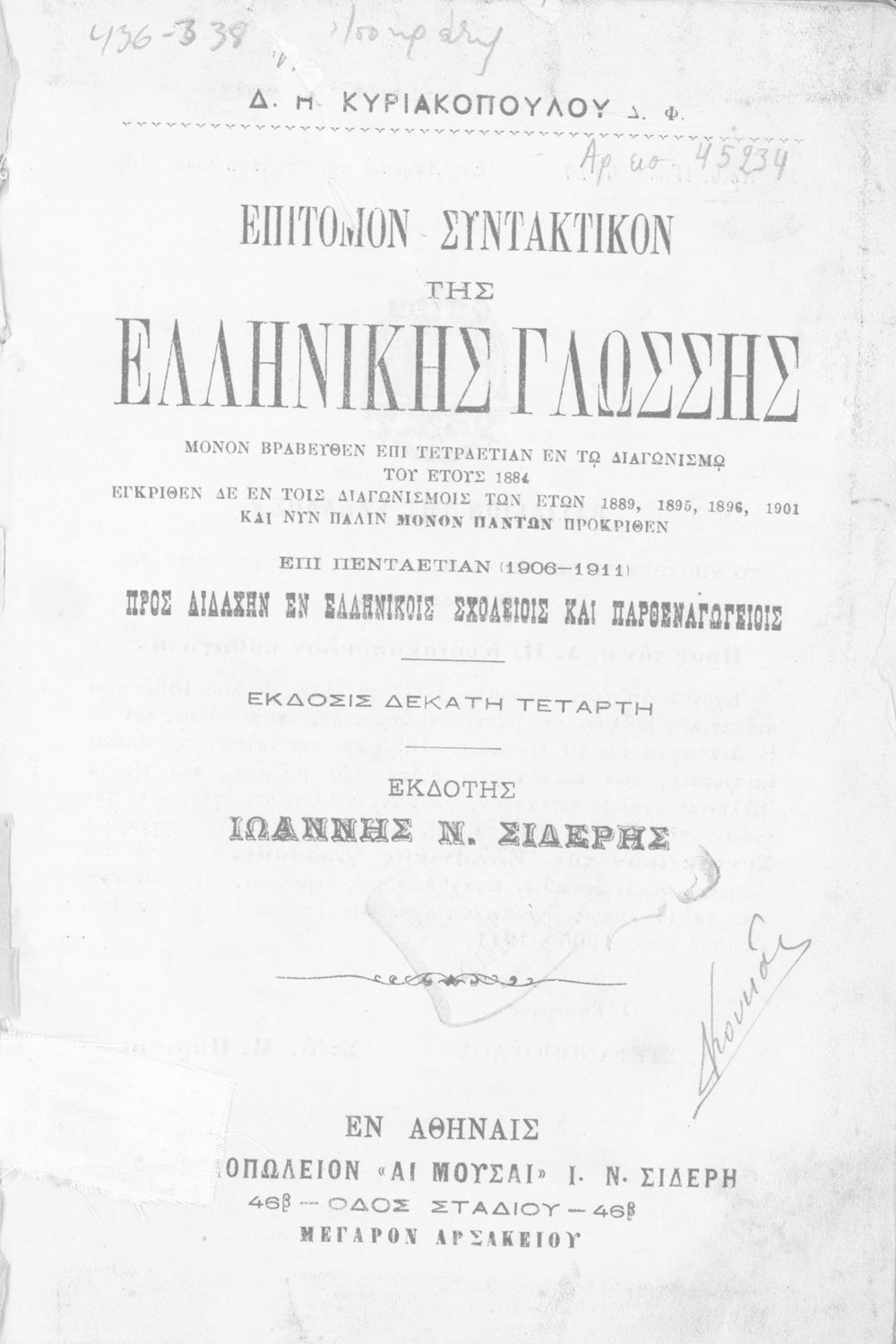 Κωδικός αναγνώρισης: 01-45234 Τίτλος: Επίτομον Συντακτικόν της ελληνικής γλώσσης προς διδαχήν εν Ελληνικοίς σχολείοις και Παρθεναγωγείοις Συγγραφέας: Δ. Η. Κυριακόπουλος Μέγεθος και υπόστρωμα: Σχολικό εγχειρίδιο, 20εκ., σκληρό εξώφυλλο, 96 σελίδες. |