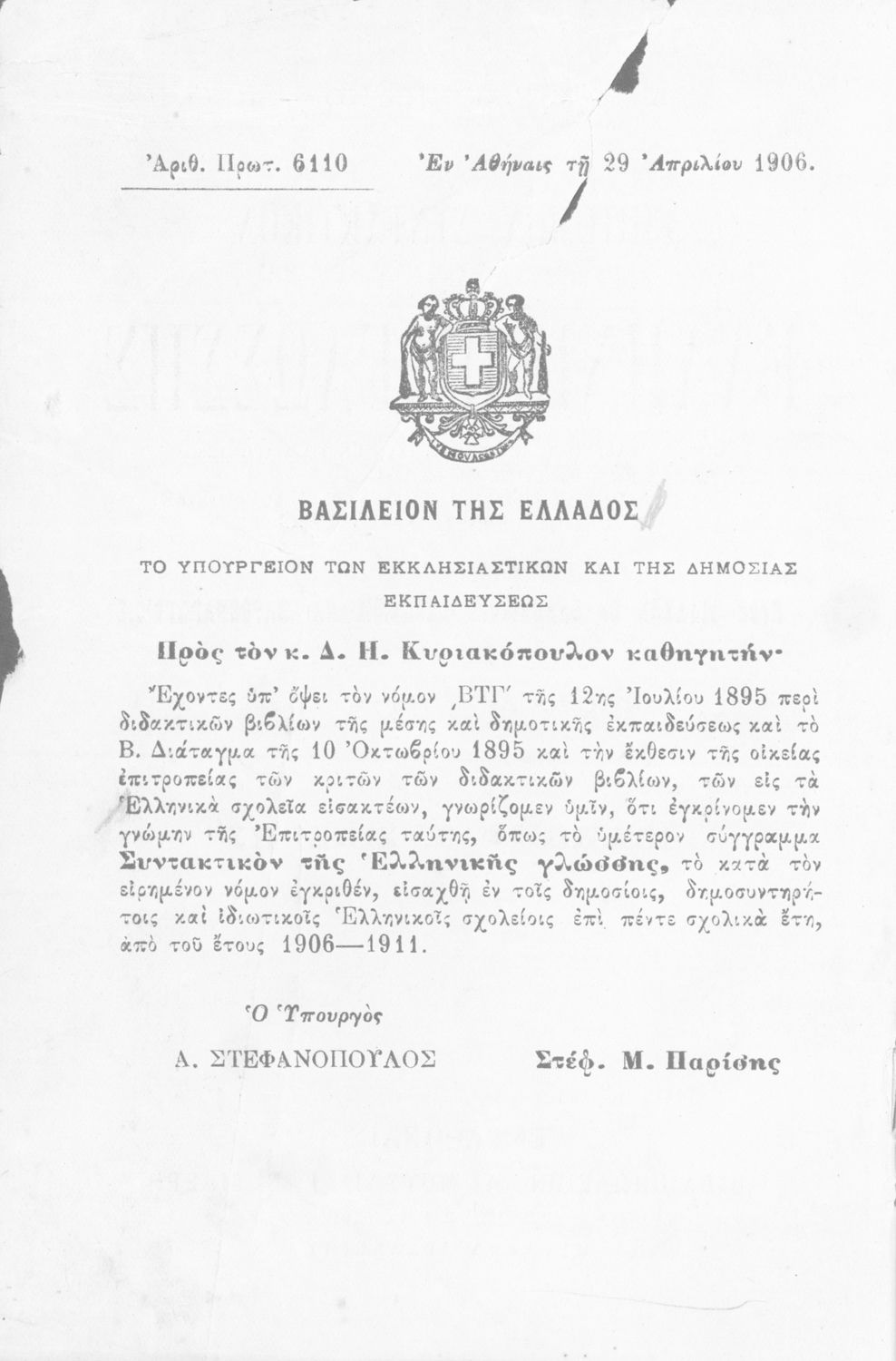 Εκδότης: Βιβλιοπωλείο ΑΙ "Μούσαι" Ιωάννη Ν.Σιδέρη Τόπος έκδοσης: Αθήνα Έκδοση: 14η Υπουργική απόφαση / Σύμβαση: 6110/29-4-1906 Έτος έγκρισης: 1906 |