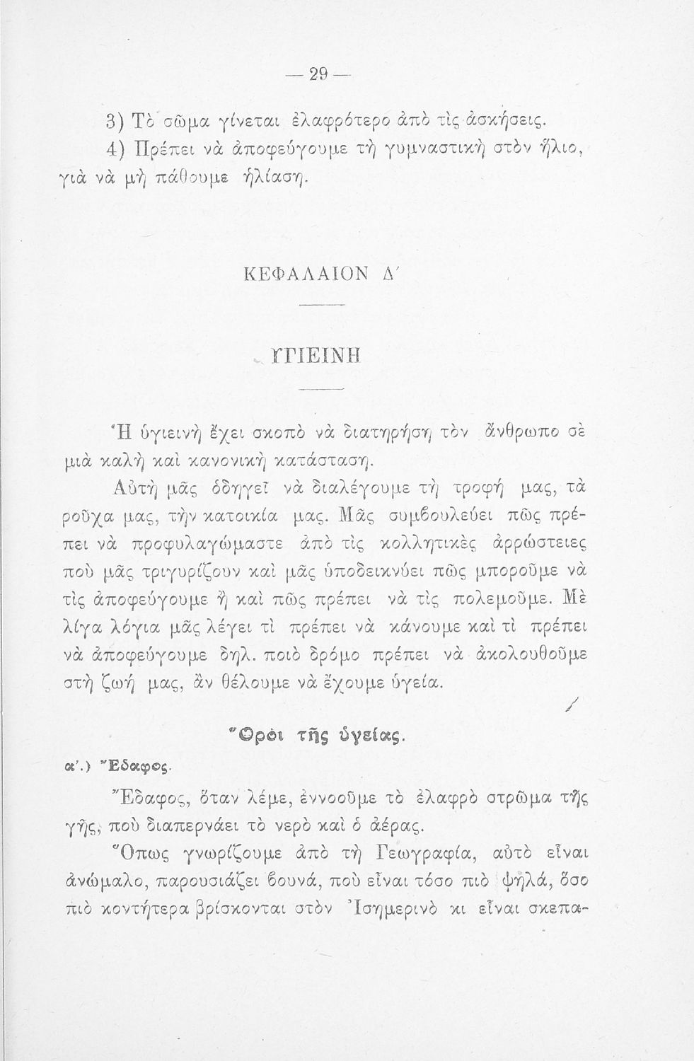 Σχολικό εγχειρίδιο για τις τάξεις του Δημοτικού και Ελληνικού σχολείου για το μάθημα της Υγιεινής. Το εγχειρίδιο περιλαμβάνει εισαγωγικά γενικές έννοιες και το αντικείμενο μελέτης της υγιεινής και της ...