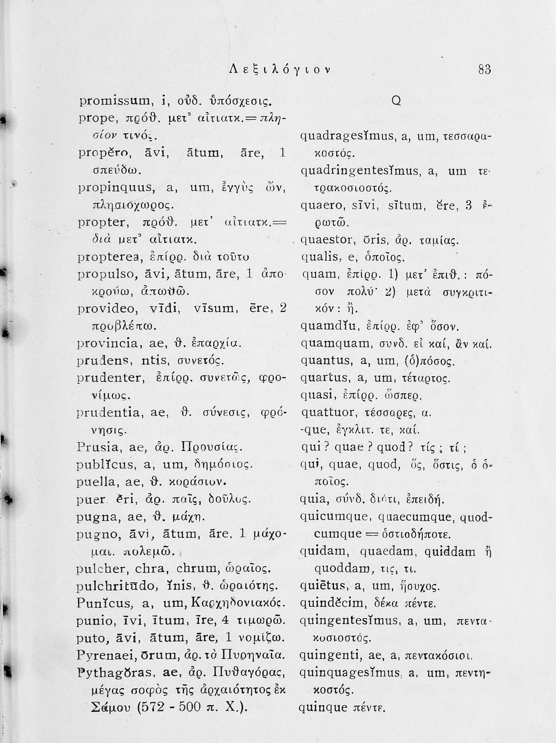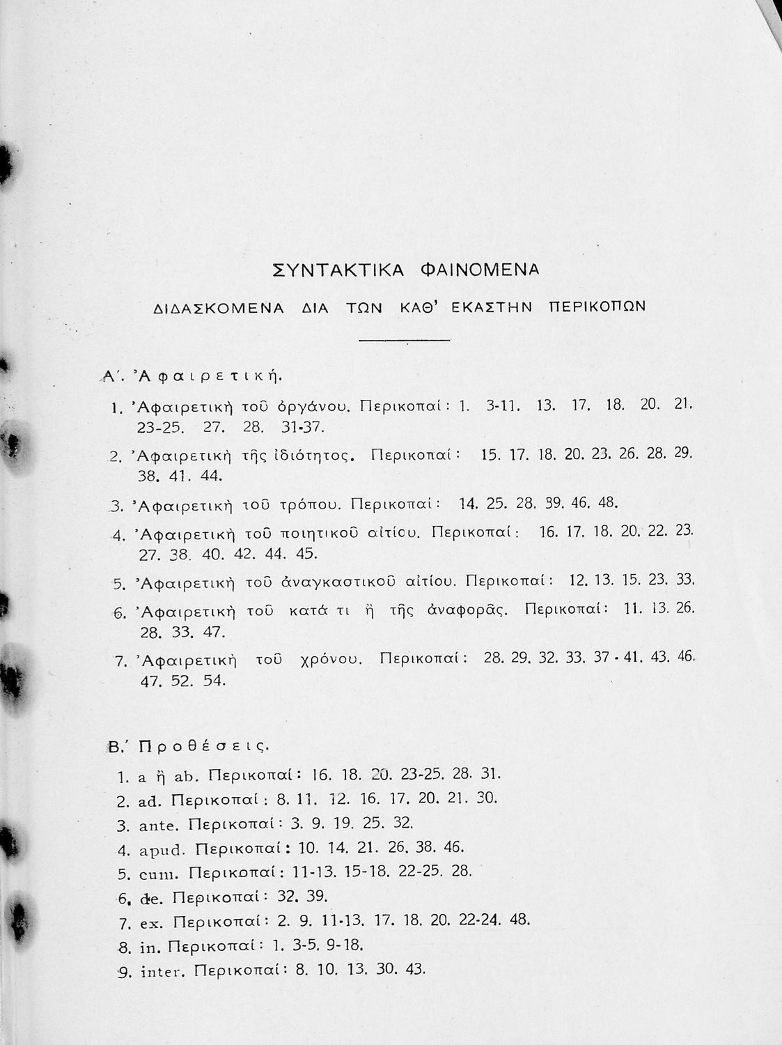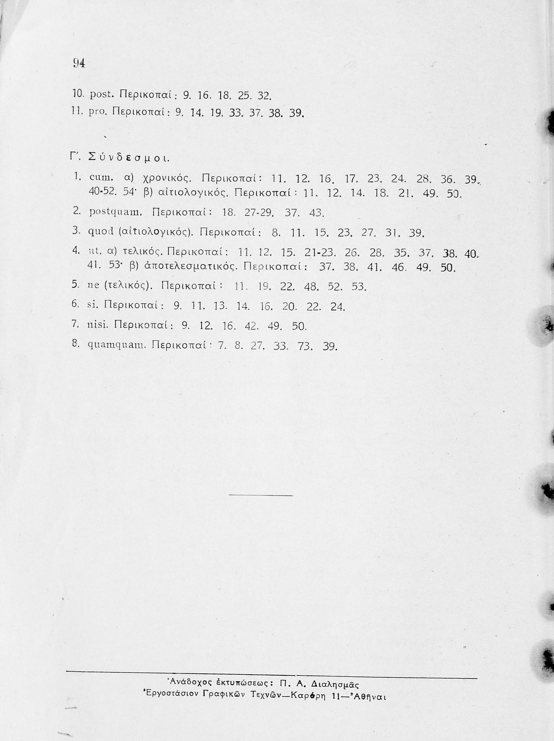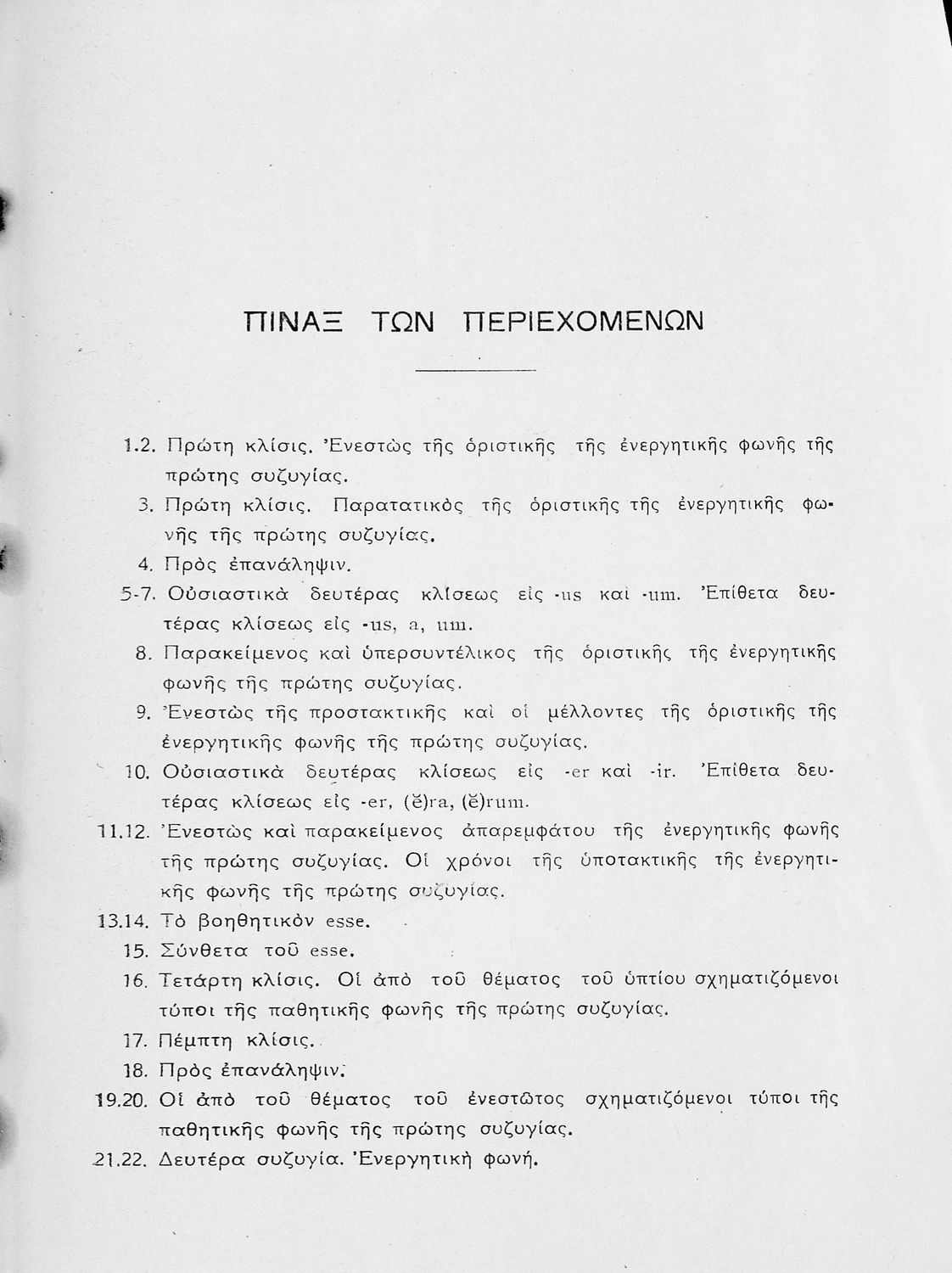 Σχολικό εγχειρίδιο Λατινικών Δ΄ Γυμνασίου που περιέχει 54 κείμενα/περικοπές για τη διδασκαλία της γραμματικής, ερμηνευτικά υπομνήματα, λεξιλόγιο και κατάλογο με τα συντακτικά φαινόμενα (αφαιρετική, προθέσεις, σύνδεσμοι) που διδάσκονται με βάση τις περικοπές.