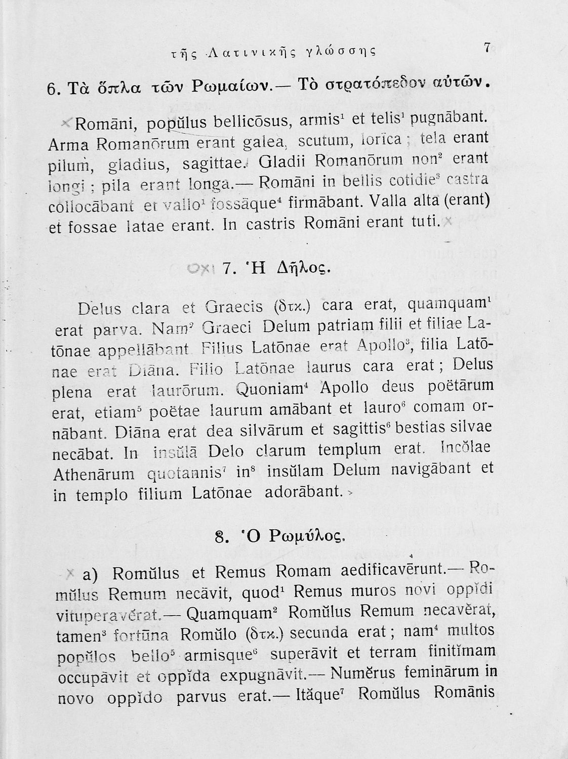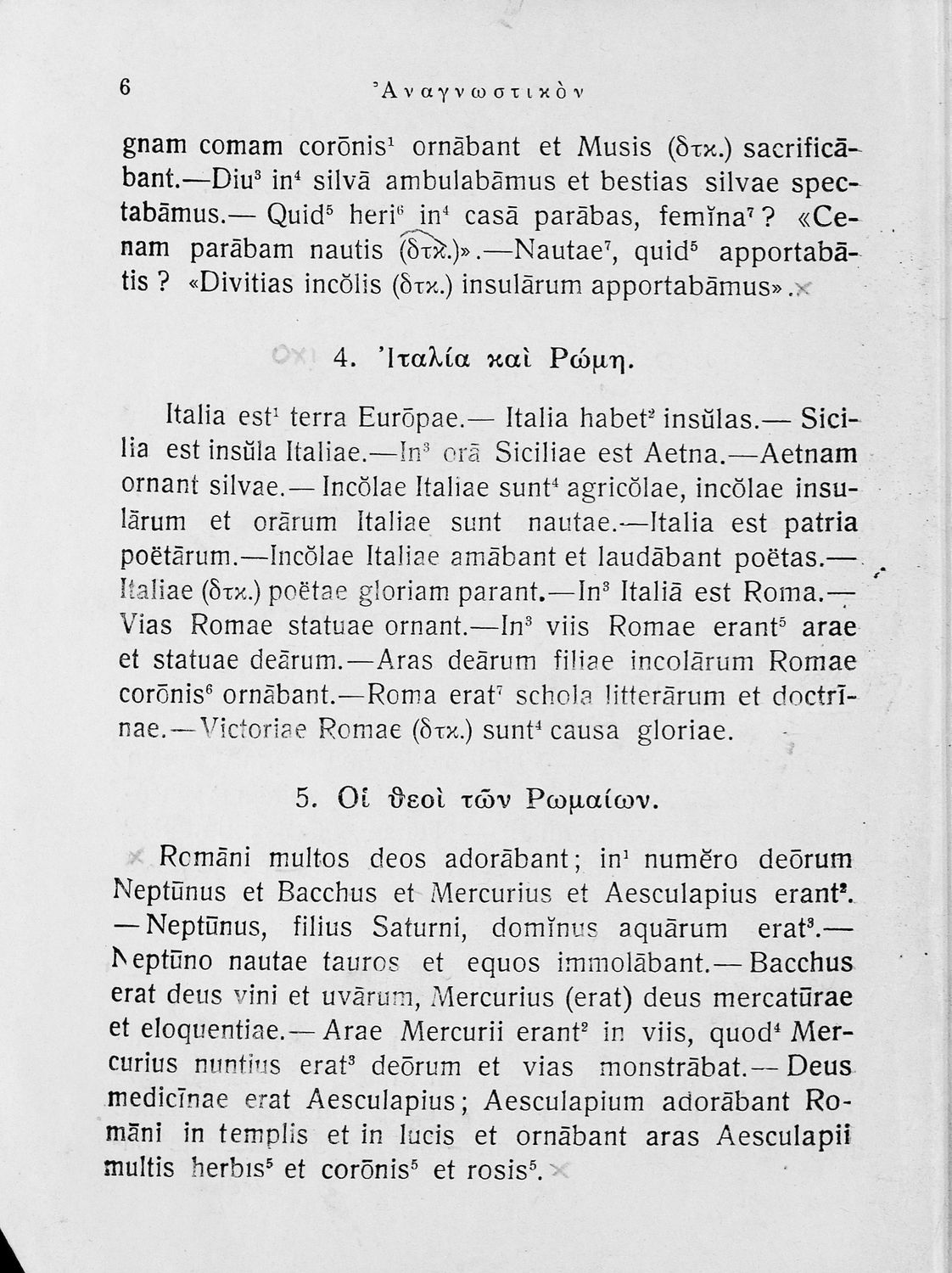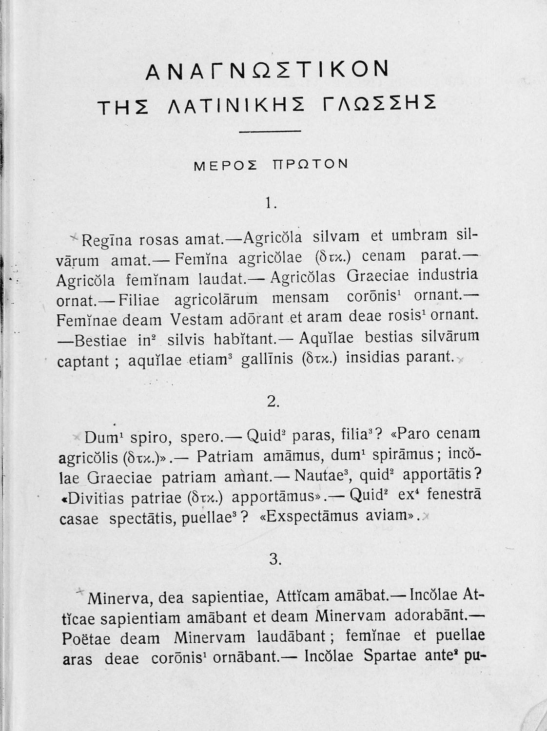 Σχολικό εγχειρίδιο Λατινικών Δ΄ Γυμνασίου που περιέχει 54 κείμενα/περικοπές για τη διδασκαλία της γραμματικής, ερμηνευτικά υπομνήματα, λεξιλόγιο και κατάλογο με τα συντακτικά φαινόμενα (αφαιρετική, προθέσεις, σύνδεσμοι) που διδάσκονται με βάση τις περικοπές.