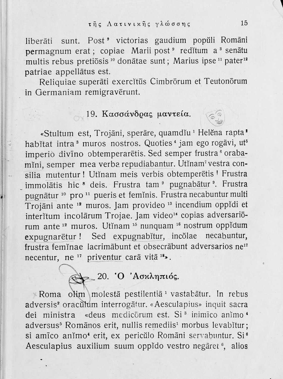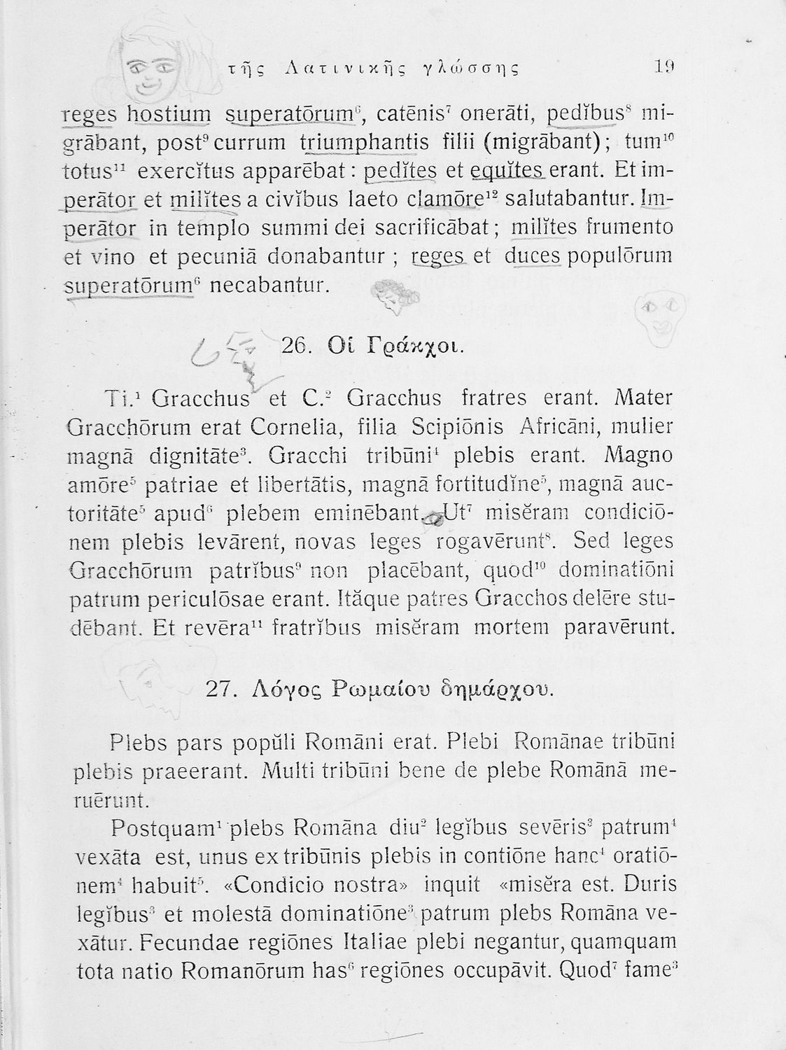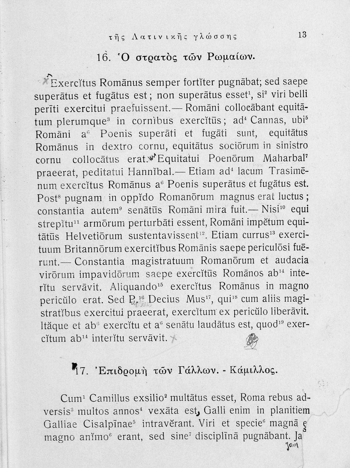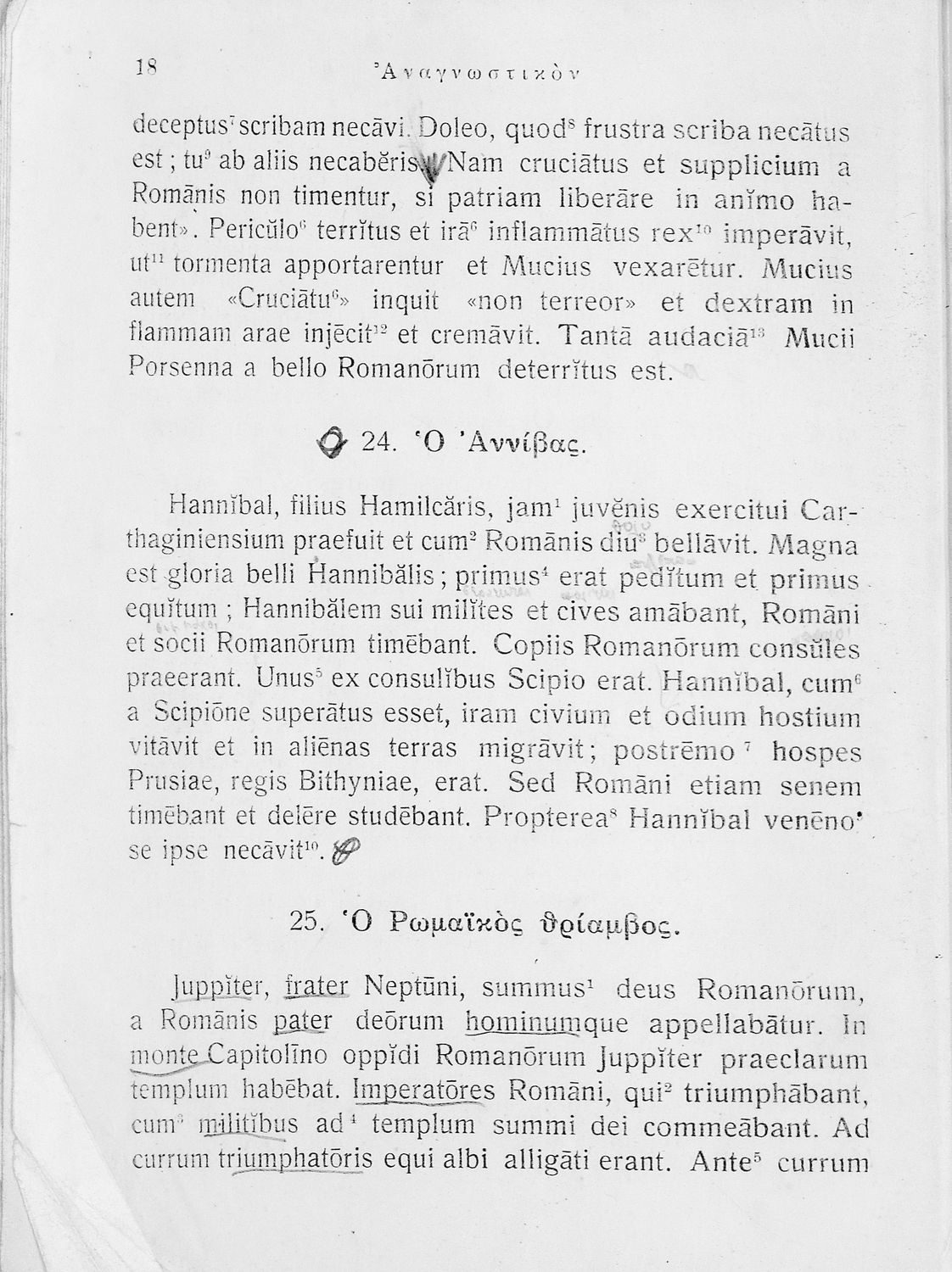 Σχολικό εγχειρίδιο Λατινικών Δ΄ Γυμνασίου που περιέχει 54 κείμενα/περικοπές για τη διδασκαλία της γραμματικής, ερμηνευτικά υπομνήματα, λεξιλόγιο και κατάλογο με τα συντακτικά φαινόμενα (αφαιρετική, προθέσεις, σύνδεσμοι) που διδάσκονται με βάση τις περικοπές.