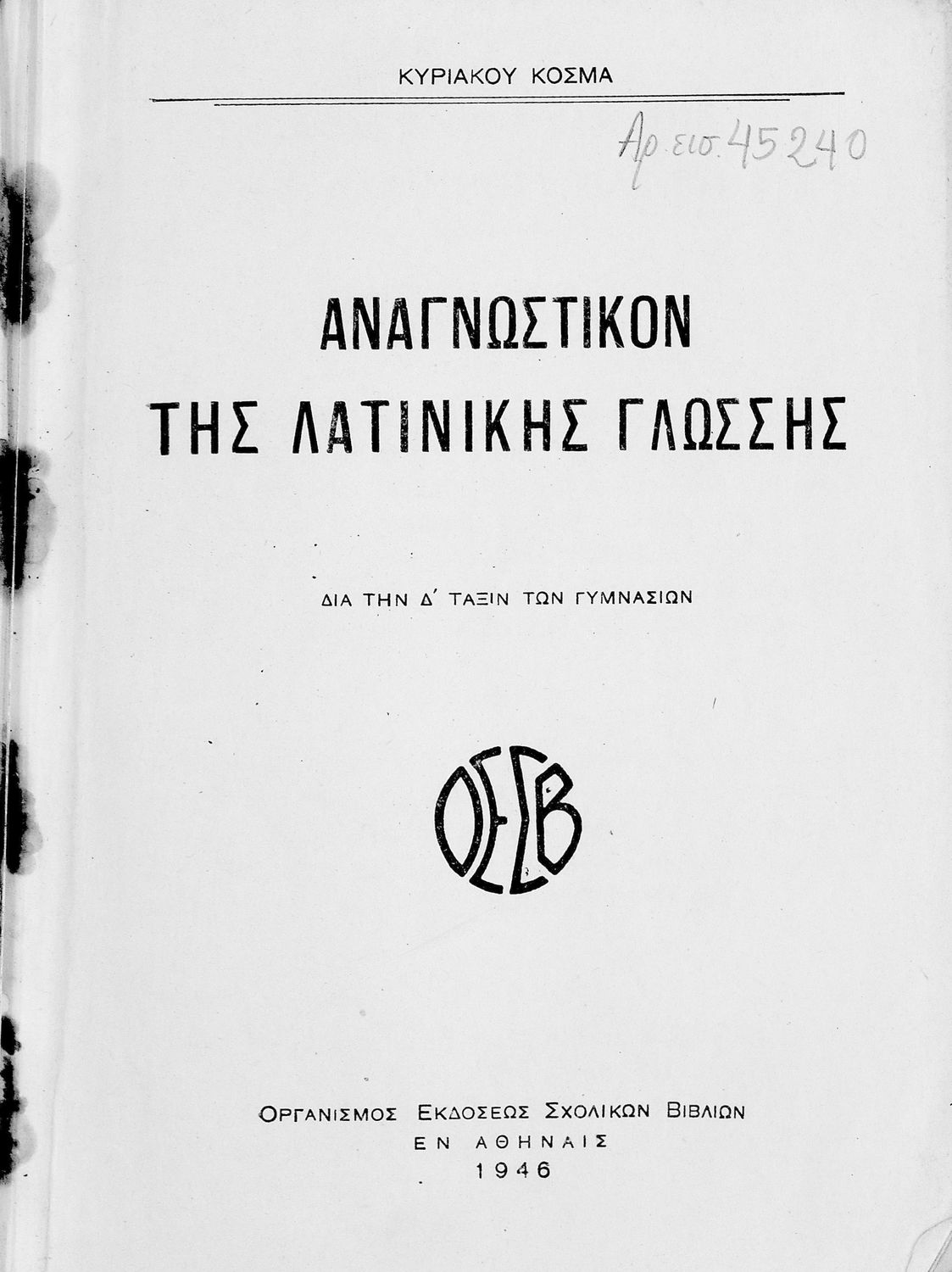 Εκδότης: Οργανισμός Εκδόσεως Σχολικών Βιβλίων Έτος έκδοσης: 1946 Τόπος έκδοσης: Αθήνα |