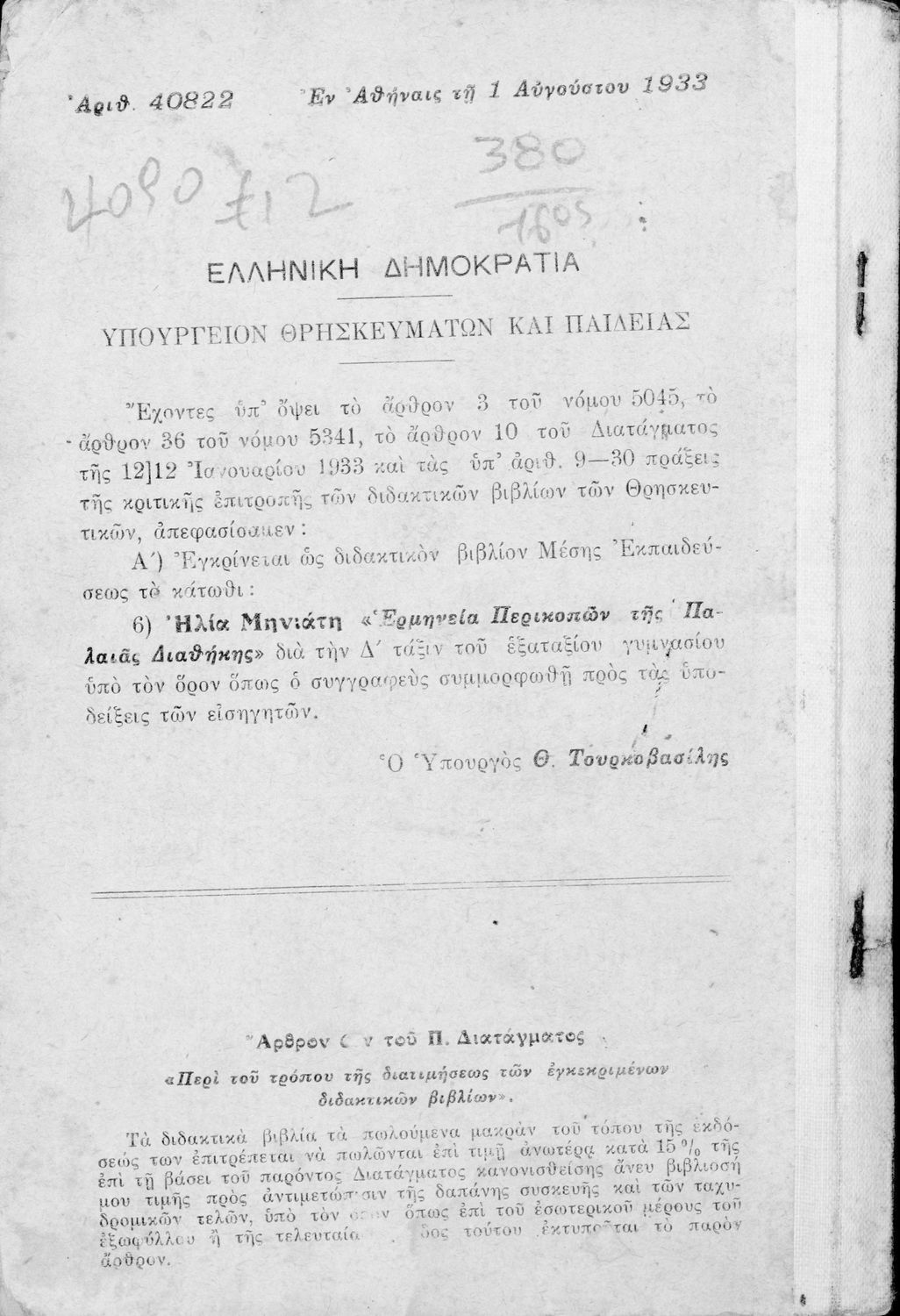 Υπουργική απόφαση / Σύμβαση: 40822/1-8-1933