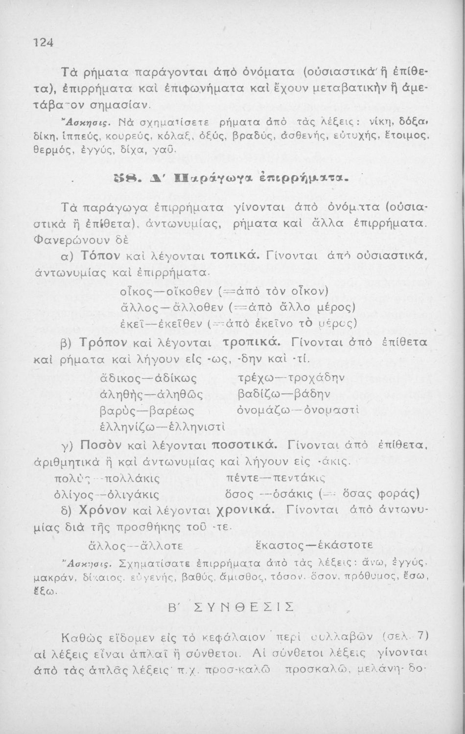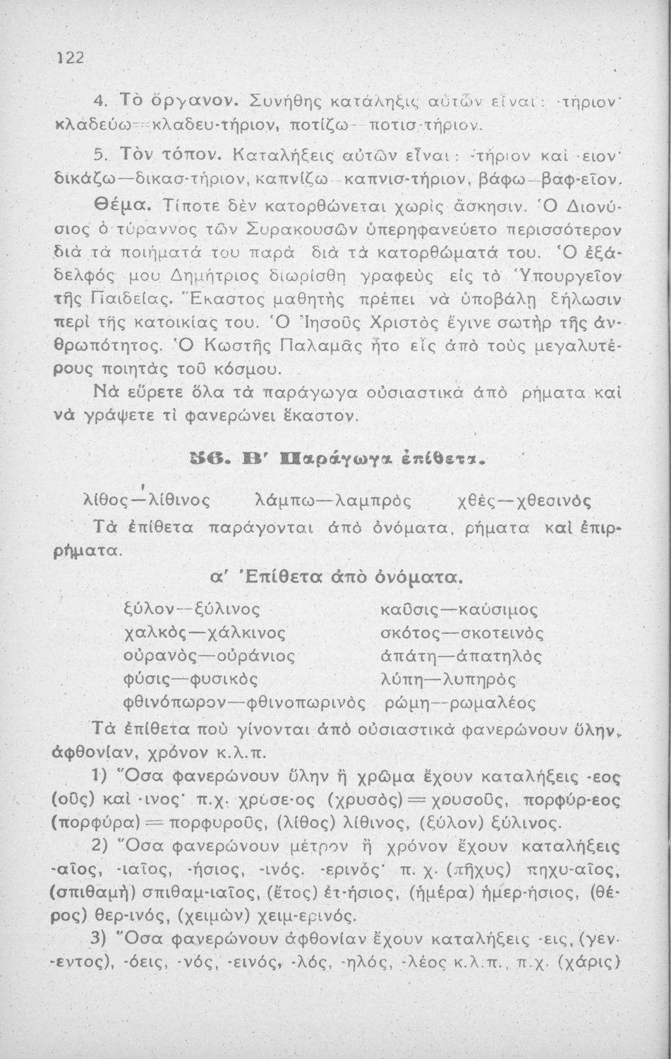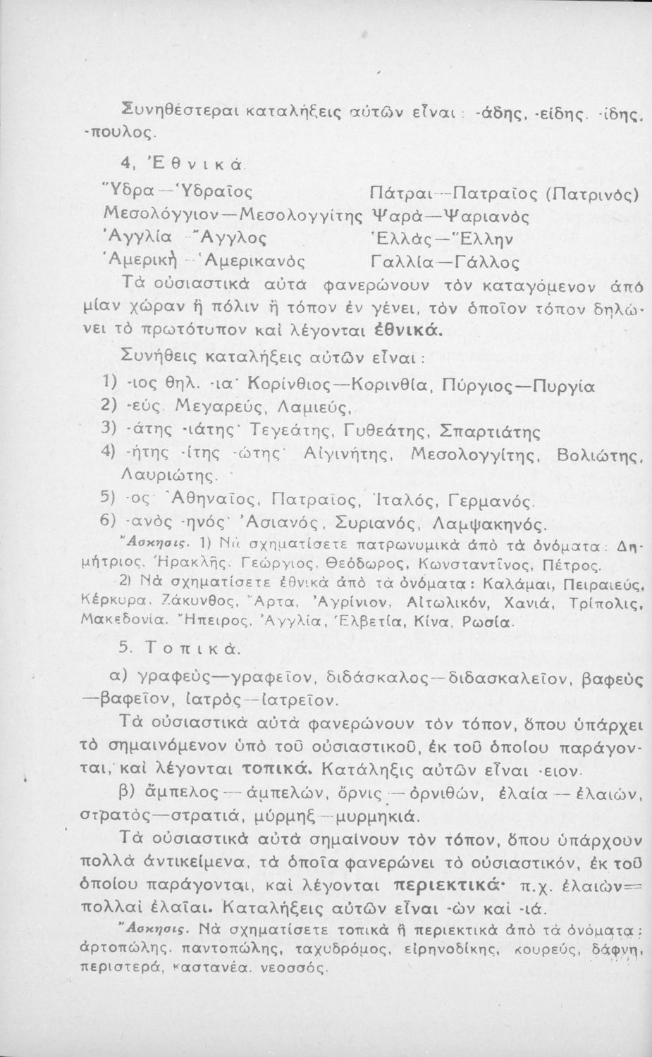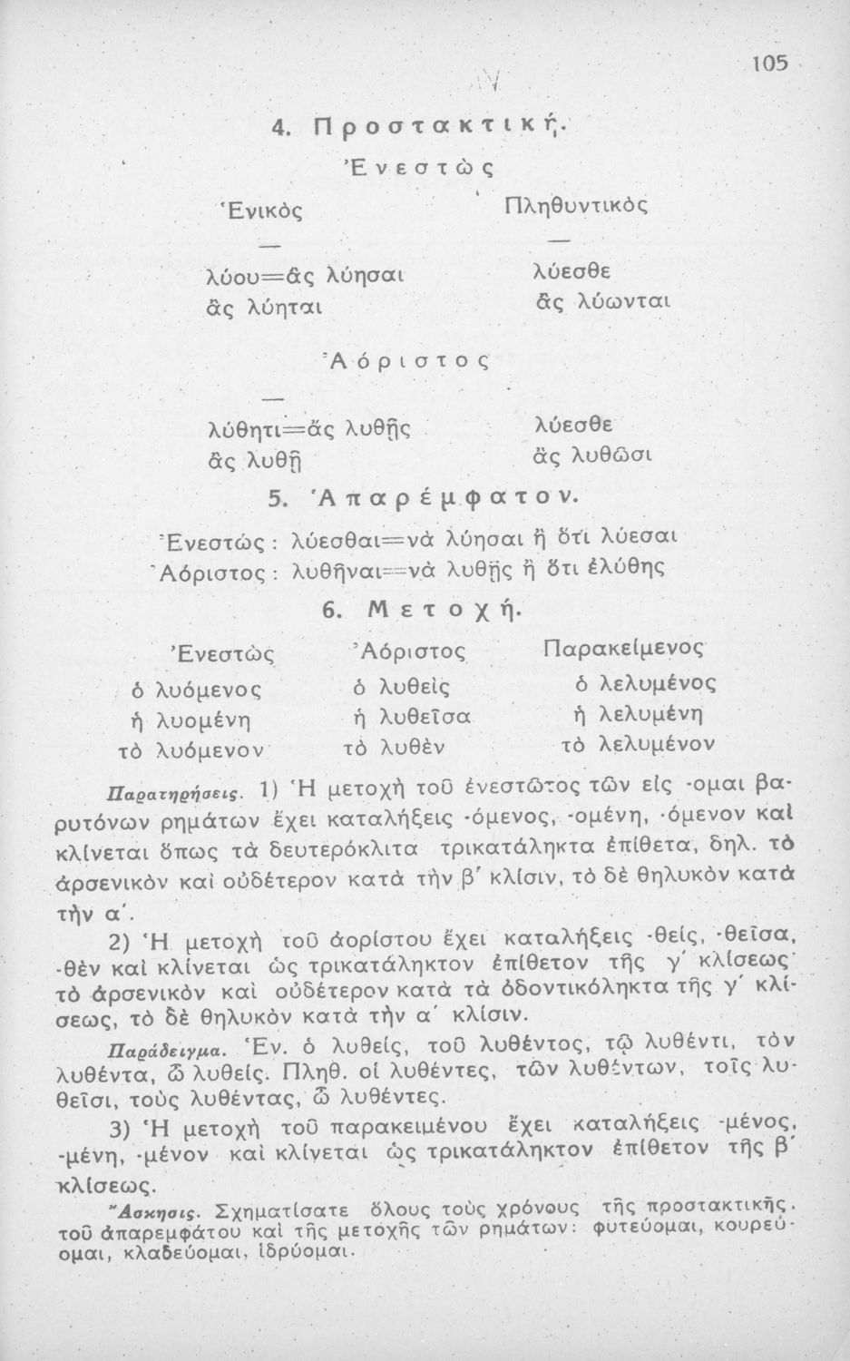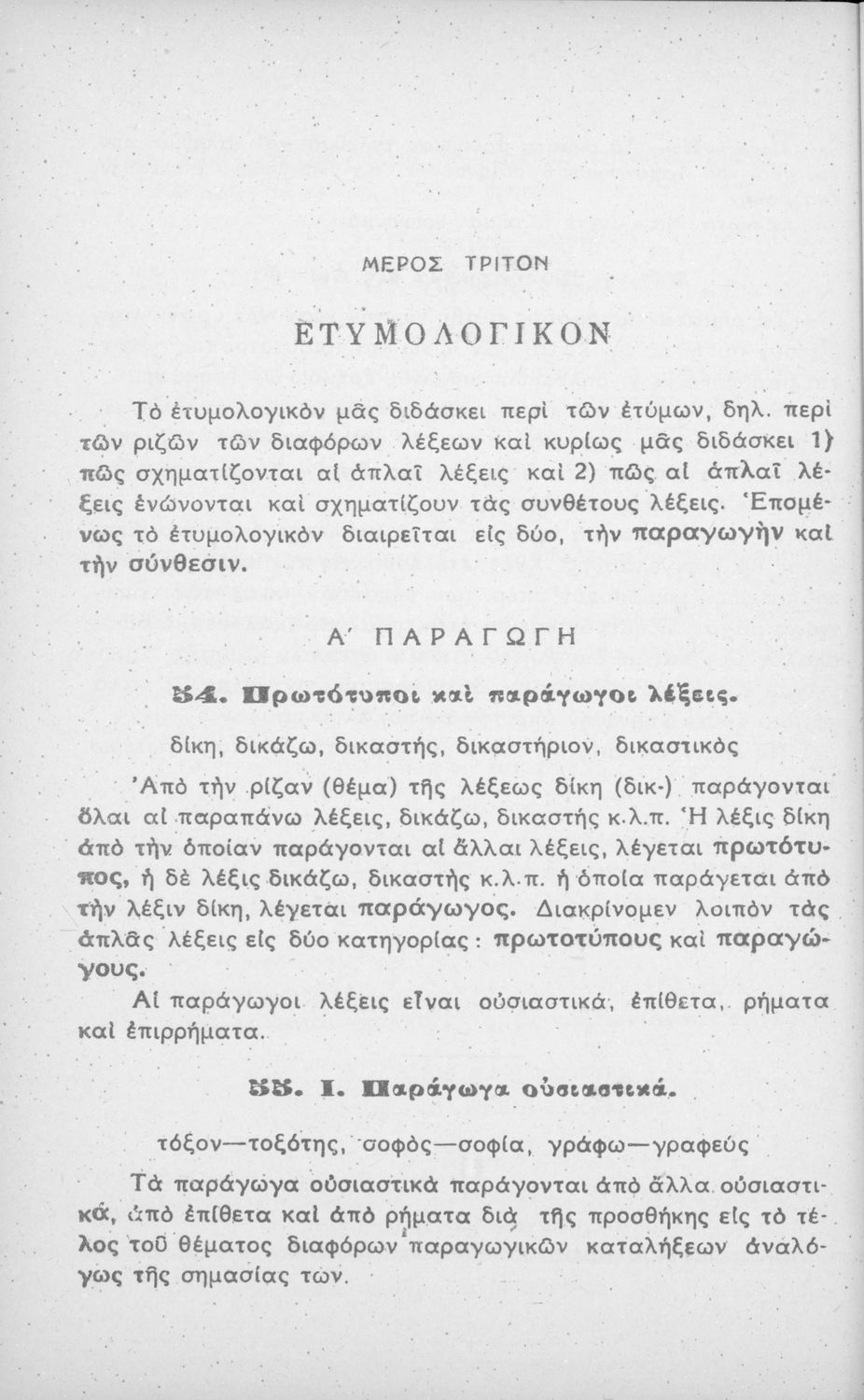 Σχολικό εγχειρίδιο γραμματικής για τους μαθητές της Ε΄ και ΣΤ΄ τάξης του Δημοτικού. Περιέχει τη διδασκαλία της γραμματικής της καθαρεύουσας με κανόνες και παραδείγματα.