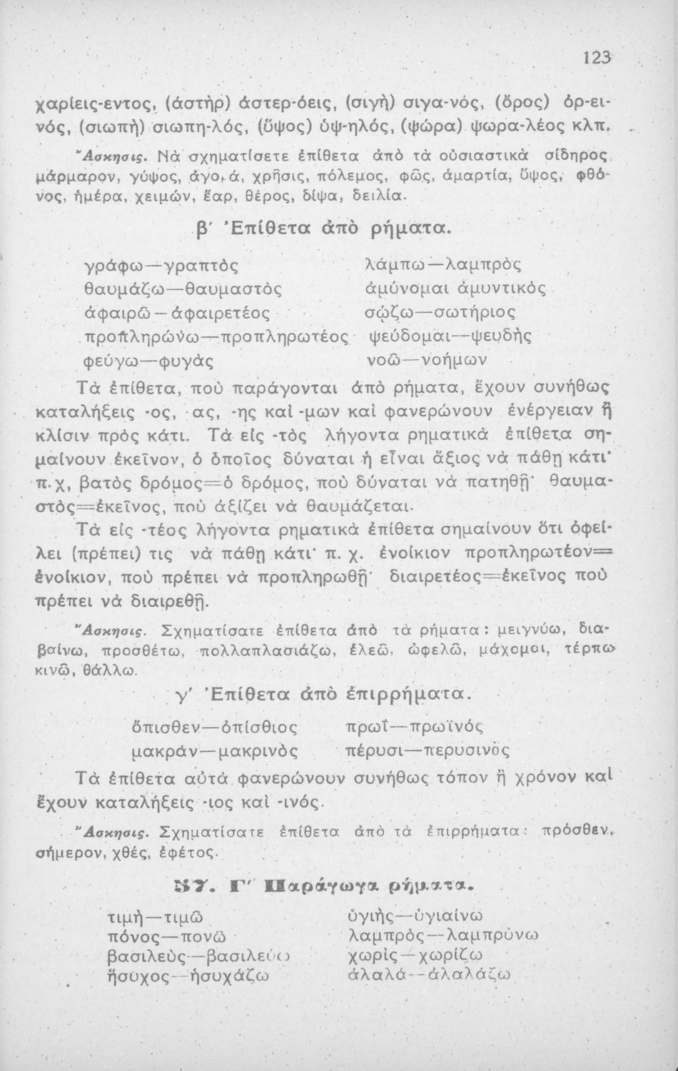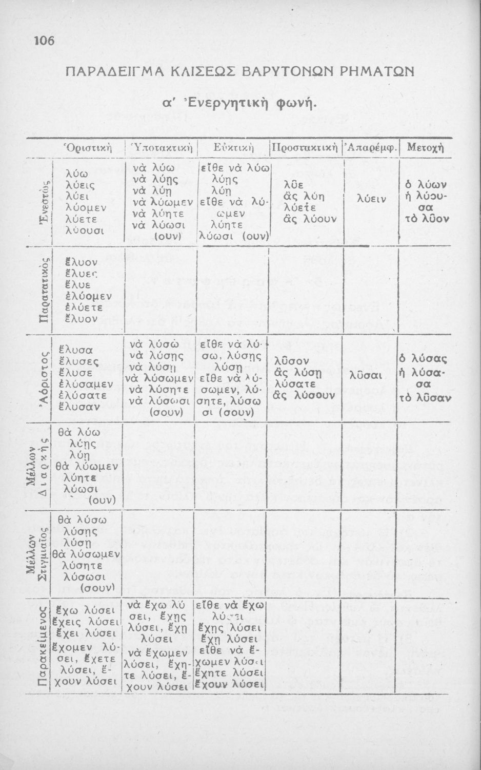 Μαθητικό βοήθημα Γλώσσας Ε΄ και ΣΤ΄ Δημοτικού που περιλαμβάνει τους κανόνες γραμματικής της καθαρεύουσας και είναι χωρισμένη στο φθογγολογικό, το τυπολογικό και ετυμολογικό μέρος. Περιέχει και παράρτημα με το συντακτικό της καθαρεύουσας.