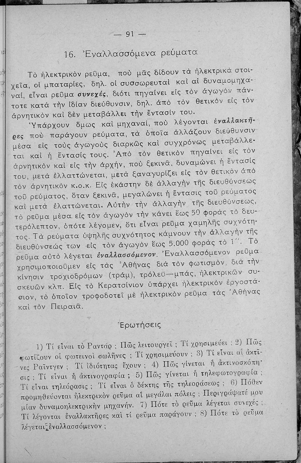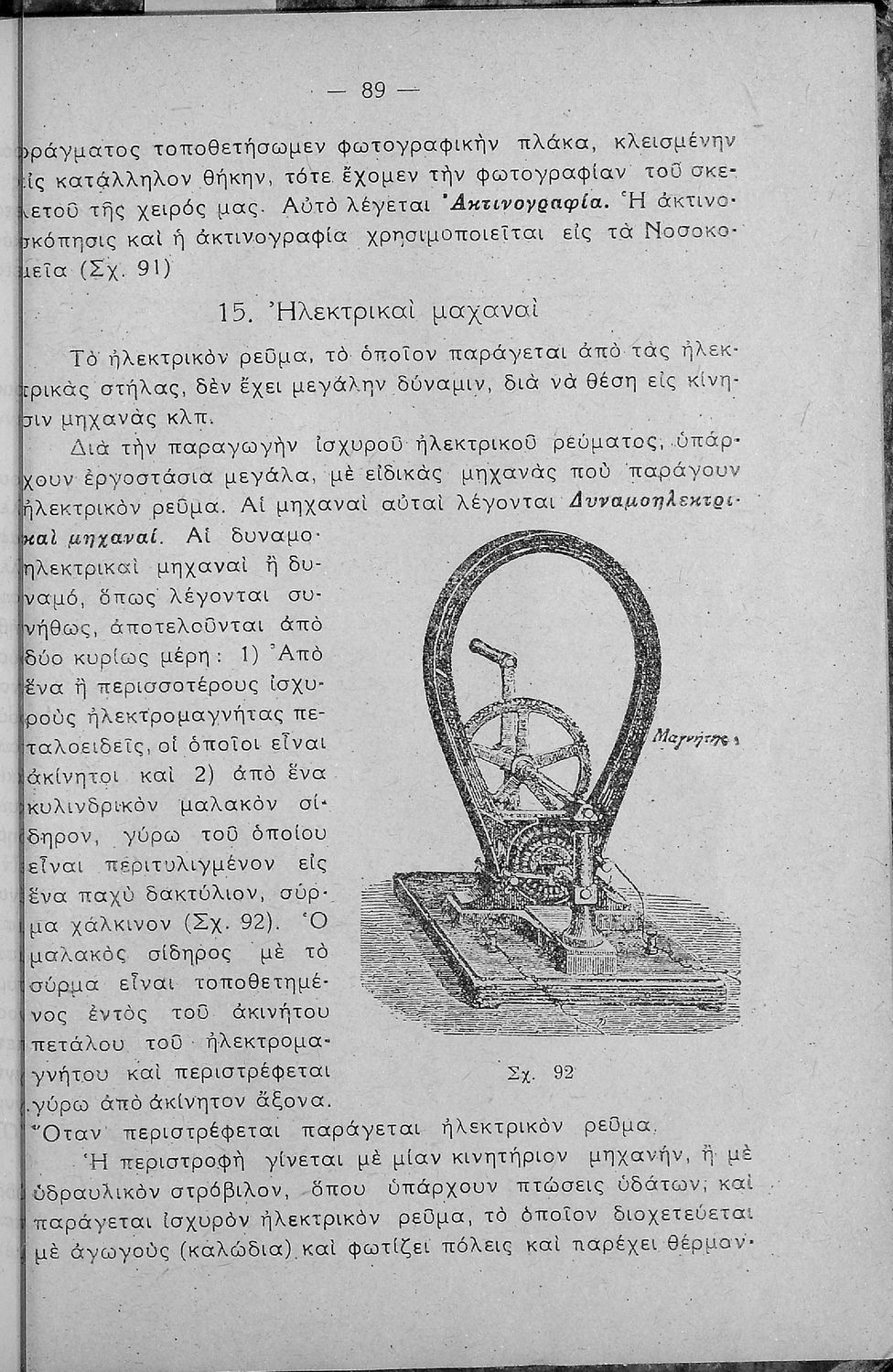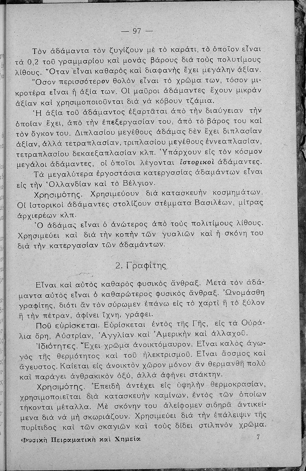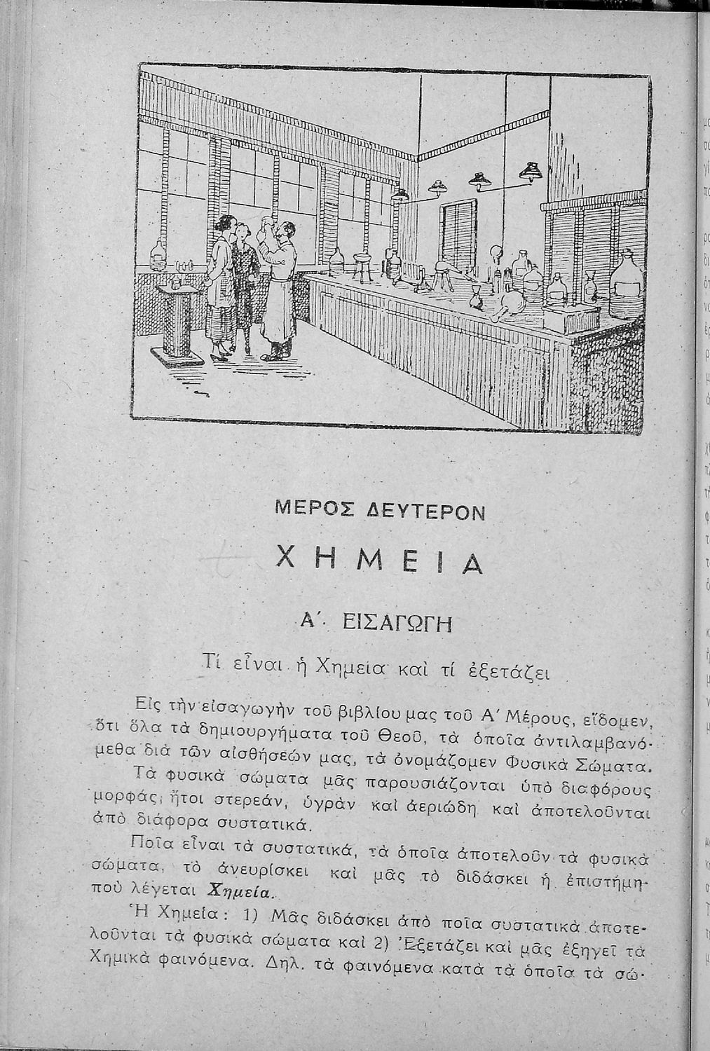 Παρουσίαση περιεχομένου: Το σύγγραμμα ήταν μαθητικό βοήθημα για το μάθημα της Φυσικής στο Δημοτικό . Παρέχει βασικές γνώσεις της φυσικής επιστήμης και της χημείας. Αναλύει τις ιδιότητες των σωμάτων, καθώς και της οπτικής, ακουστικής, της θερμότητας, του ηλεκτρισμού και του μαγνητισμού, την υδροστατική, την βαρύτητα και την αεροστατική. Σχετικά με τη χημεία αναφέρεται στα μέταλλα, στα οξέα, τις βάσεις, τα άλατα. Αναφέρεται στην πρακτική εφαρμογή της φυσικής και της χημείας στην καθημερινότητά. Επίσης, περιλαμβάνει πολλά από τα όργανα, που χρησιμοποιούνται στη φυσική, και τη χημεία. Περιέχει εικόνες και σχεδιαγράμματα τα οποία βοηθούν τη διδασκαλία. Προτείνεται μια συγκεκριμένη δομή για τη διδασκαλία σύμφωνα με την οποία το μάθημα διαρθρώνεται αρχικά με την ανάγνωση, που αναφέρεται στη θεωρία, στην περίληψη των σημαντικότερων σημείων, στις ερωτήσεις κατανόησης και τέλος στο γύμνασμα, το οποίο είναι η πρακτική εφαρμογή για την εμπέδωση της θεωρίας.