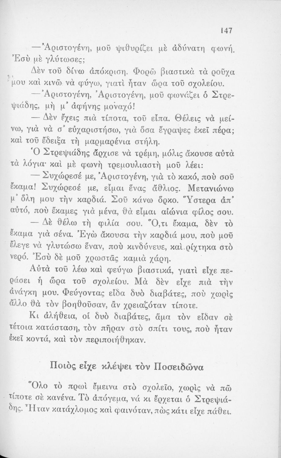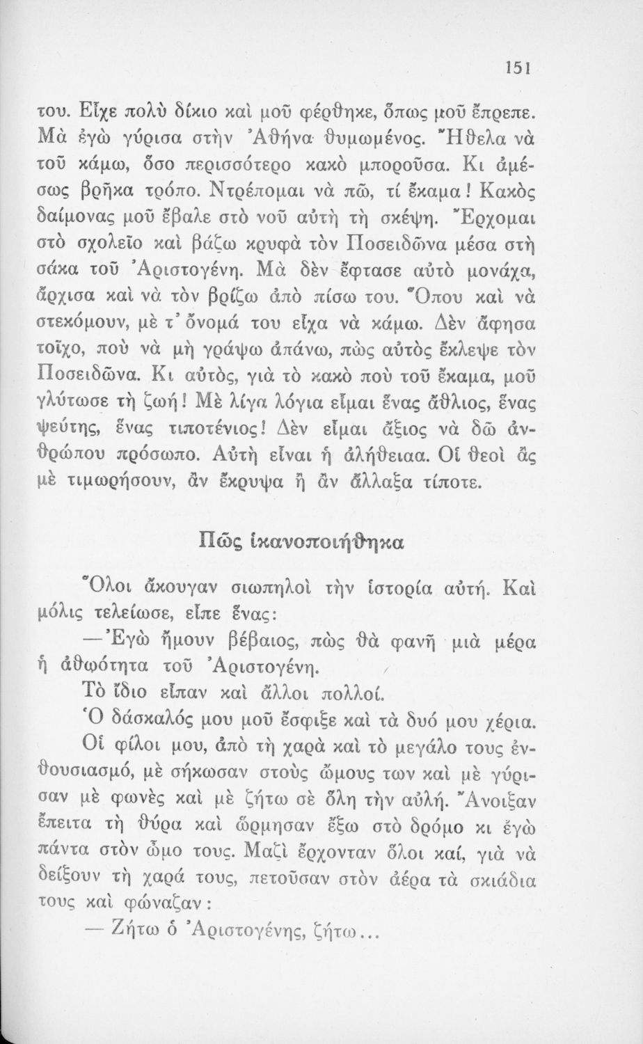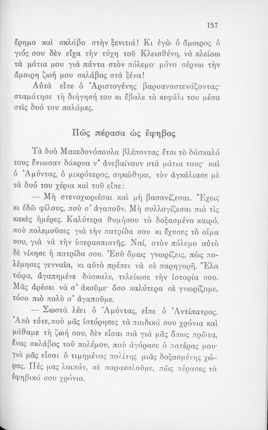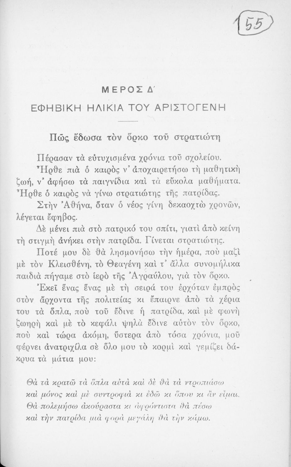 Αναγνωστικό Δ΄ Δημοτικού που περιέχει πεζά και ποιήματα εμπνευσμένα από την ελληνική ιστορία και μυθολογία, την κοινωνική ζωή και την ελληνική φύση.