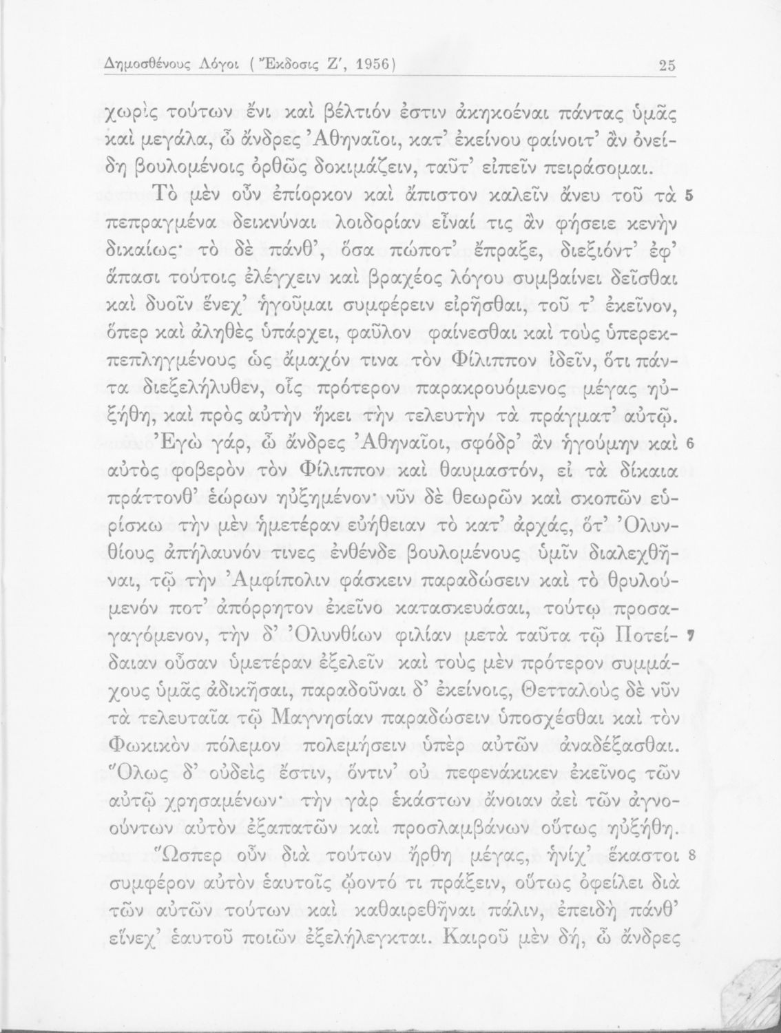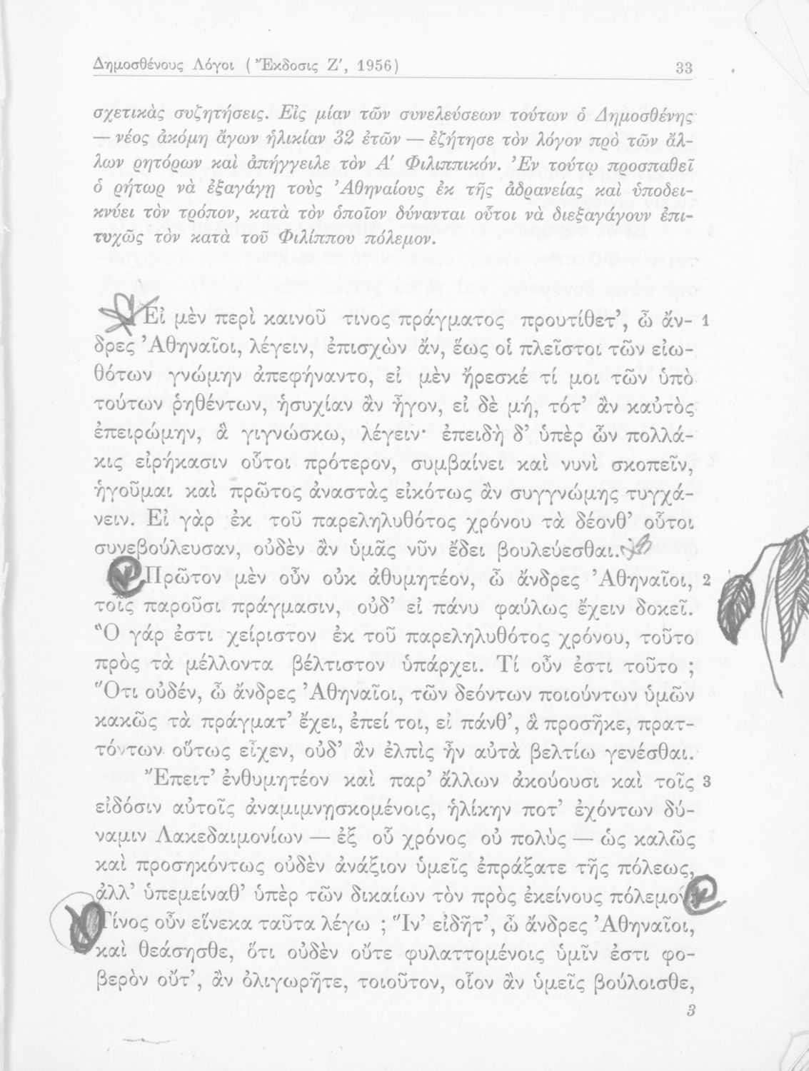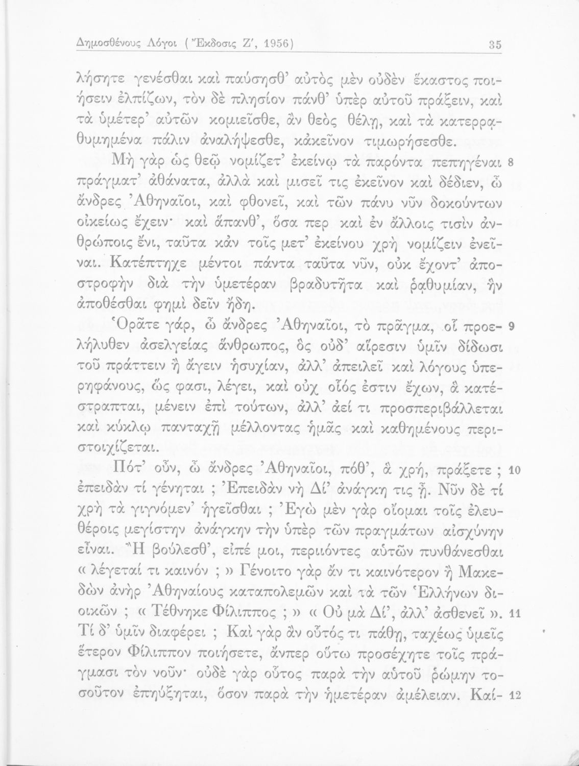 Σχολικό εγχειρίδιο Αρχαίων Ελληνικών Γυμνασίου που περιέχει τους Ολυνθιακούς Α΄ και Β΄ και τους Φιλιππικούς Α΄ και Β΄ του Δημοσθένη, το Λόγο κατά Λεωκράτους του Λυκούργου και τις Επιστολές προς Φίλιππο του Ισοκράτη, και ερμηνευτικά και ετυμολογικά σχόλια.
