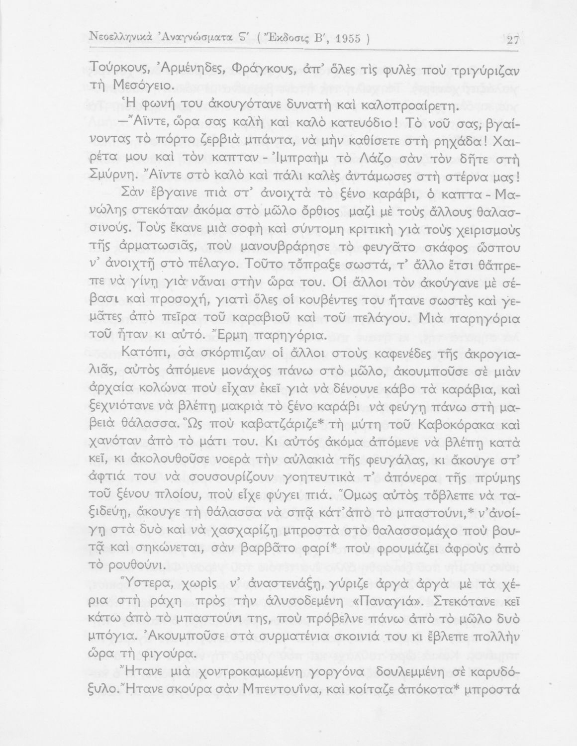 Αναγνωστικό της ΣΤ΄ Δημοτικού με ποιήματα και πεζά από την ελληνική και ξένη λογοτεχνία. Διαθέτει παράρτημα με λεξιλόγιο και βιογραφίες συγγραφέων. Η θεματολογία είναι επηρεασμένη όσον αφορά την ελληνική λογοτεχνία από την ιστορική ζωή του τόπου.