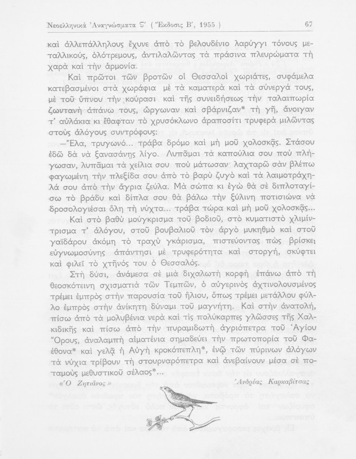 Αναγνωστικό της ΣΤ΄ Δημοτικού με ποιήματα και πεζά από την ελληνική και ξένη λογοτεχνία. Διαθέτει παράρτημα με λεξιλόγιο και βιογραφίες συγγραφέων. Η θεματολογία είναι επηρεασμένη όσον αφορά την ελληνική λογοτεχνία από την ιστορική ζωή του τόπου.