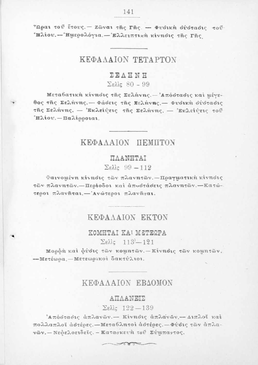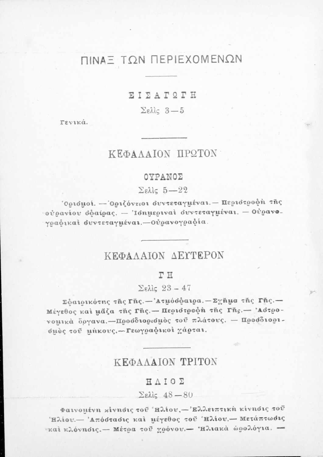 Σχολικό εγχειρίδιο κοσμογραφίας Γυμνασίου που παρουσιάζει τους πλανήτες του ηλιακού μας συστήματος και δίνει στοιχεία για τη σύσταση και τις κινήσεις τους. Ο συγγραφέας ήταν διευθυντής του Αστεροσκοπείου και καθηγητής στο Εθνικό Πανεπιστήμιο.