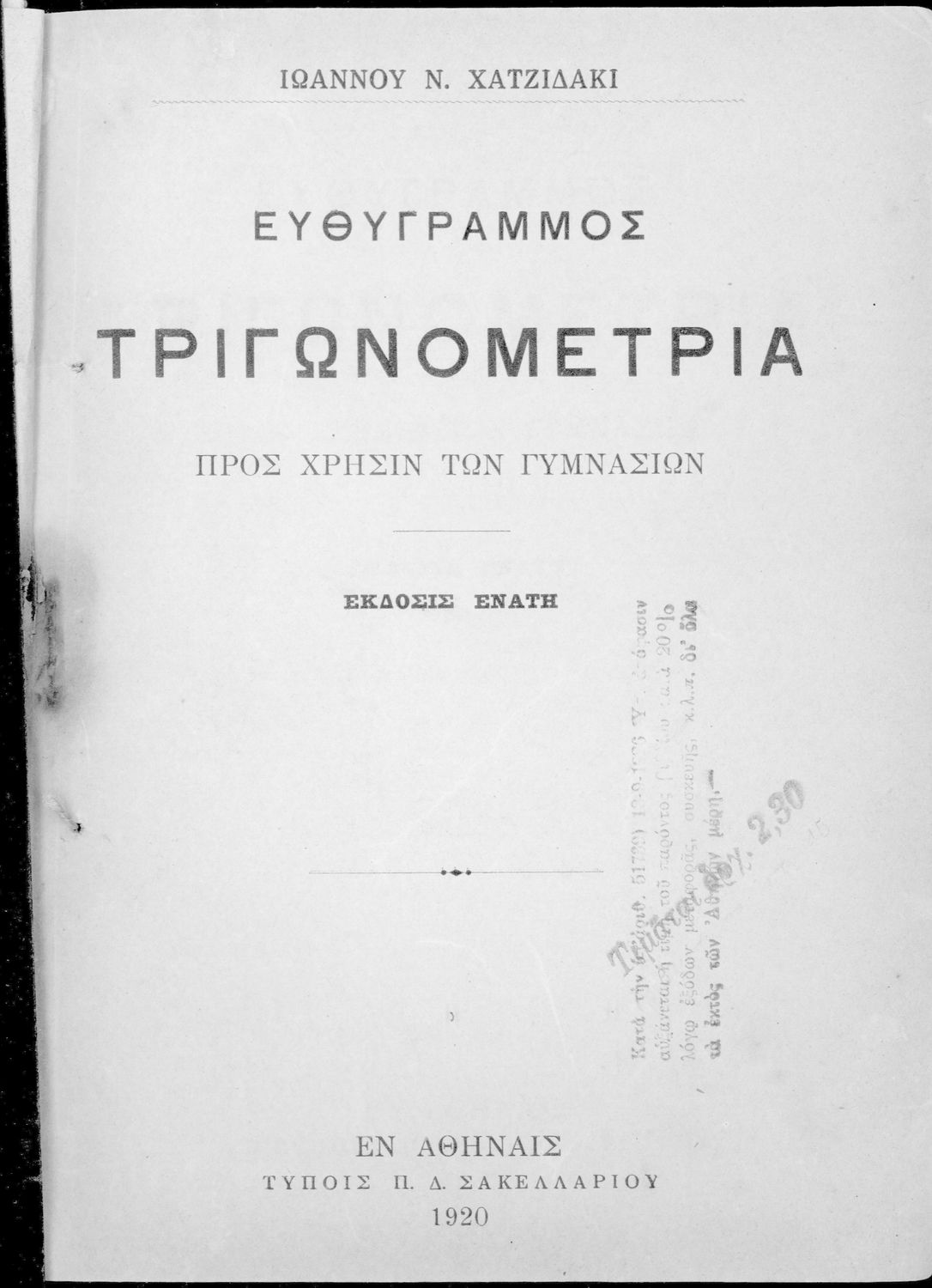 LDR 01002 2200205 4500 035 ## _a01-45258c 040 ## _aΙνστιτούτο Εκπαιδευτικής Πολιτικής 041 ## _ael 100 ## _aΙωάννης Ν. Χατζηδάκις 110 ## _a45258c 245 0# _aΕυθύγραμμος τριγωνομετρία προς χρήσιν των Γυμνασίων 250 ## _a9η Έκδοση 260 ## _aΑθήνα _bΠ. Δ. Σακελλαρίου _c1920 300 ## _a88 _c19 520 ## _aΣχολικό εγχειρίδιο Τριγωνομετρίας Γυμνασίου που εστιάζει στις τριγωνομετρικές γραμμές και την μέτρηση των ευθύγραμμων τριγώνων. 521 ## _aΓυμνάσιο 522 ## _aΕλλάδα 546 ## _aΚαθαρεύουσα 563 ## _aΜαλακό Εξώφυλλο 650 #4 _aΕφαπτομένη _aΗμιτόνιο _aΣυνημίτονο _aΤριγωνομετρικοί αριθμοί