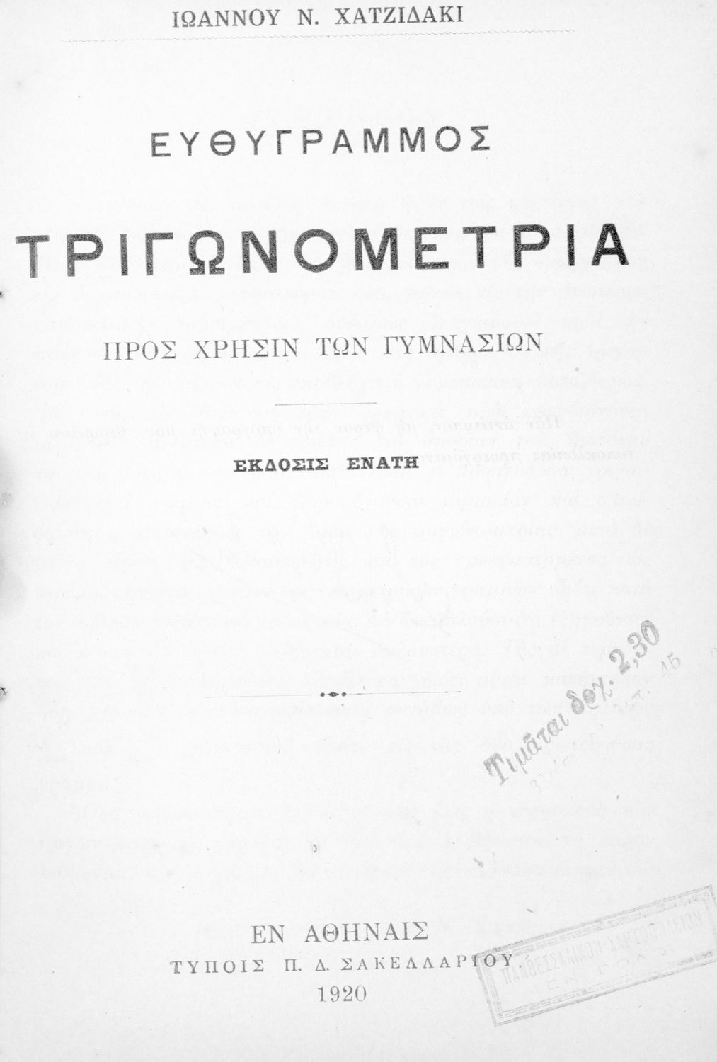 Κωδικός αναγνώρισης: 01-45258c Τίτλος: Ευθύγραμμος τριγωνομετρία προς χρήσιν των Γυμνασίων Συγγραφέας: Ιωάννης Ν. Χατζηδάκις Μέγεθος και υπόστρωμα: Σχολικό εγχειρίδιο, 19εκ., μαλακό εξώφυλλο, 88 σελίδες. |