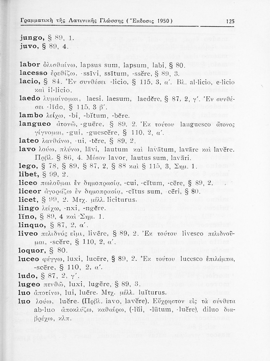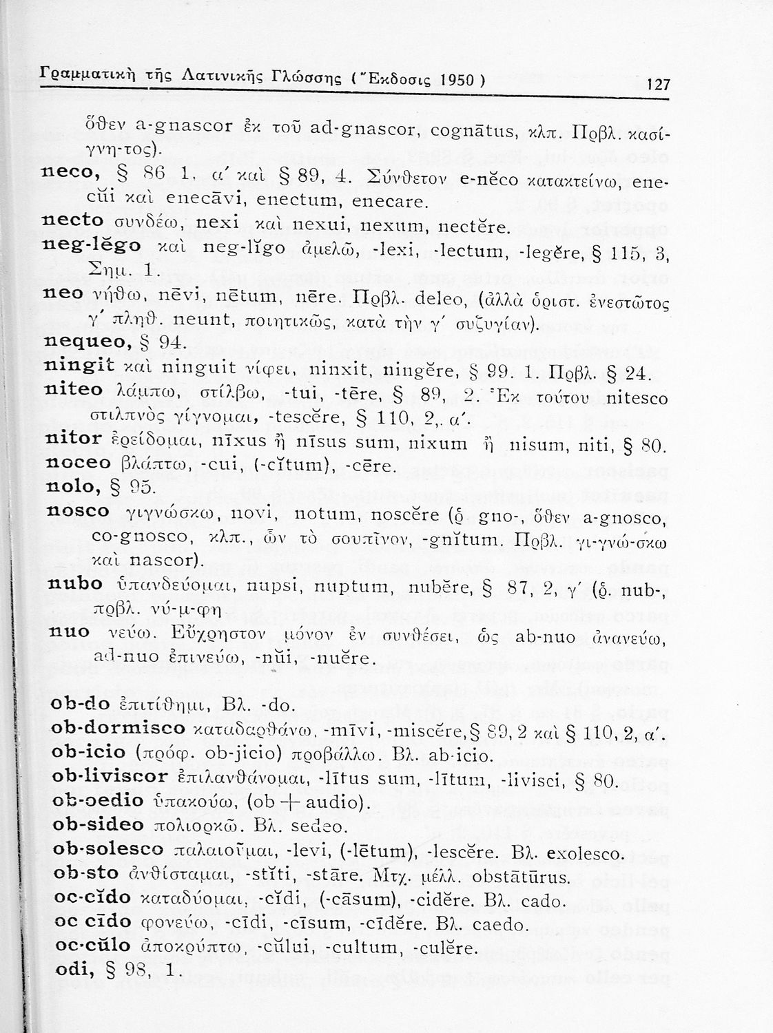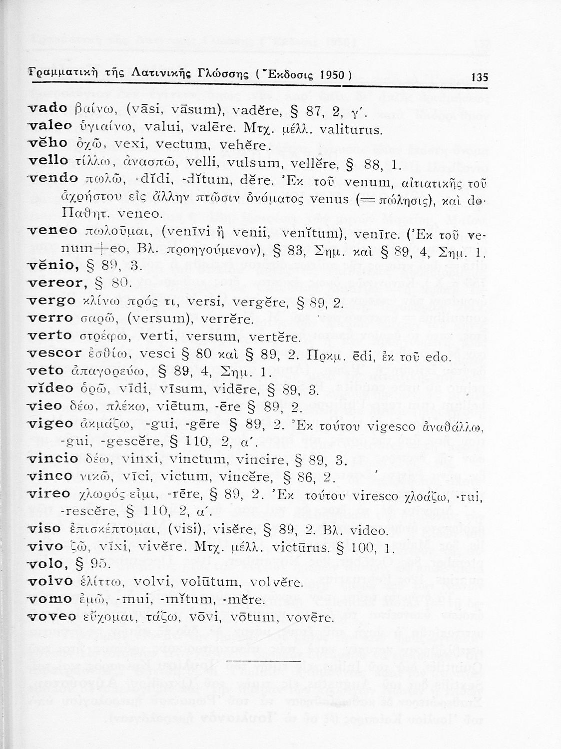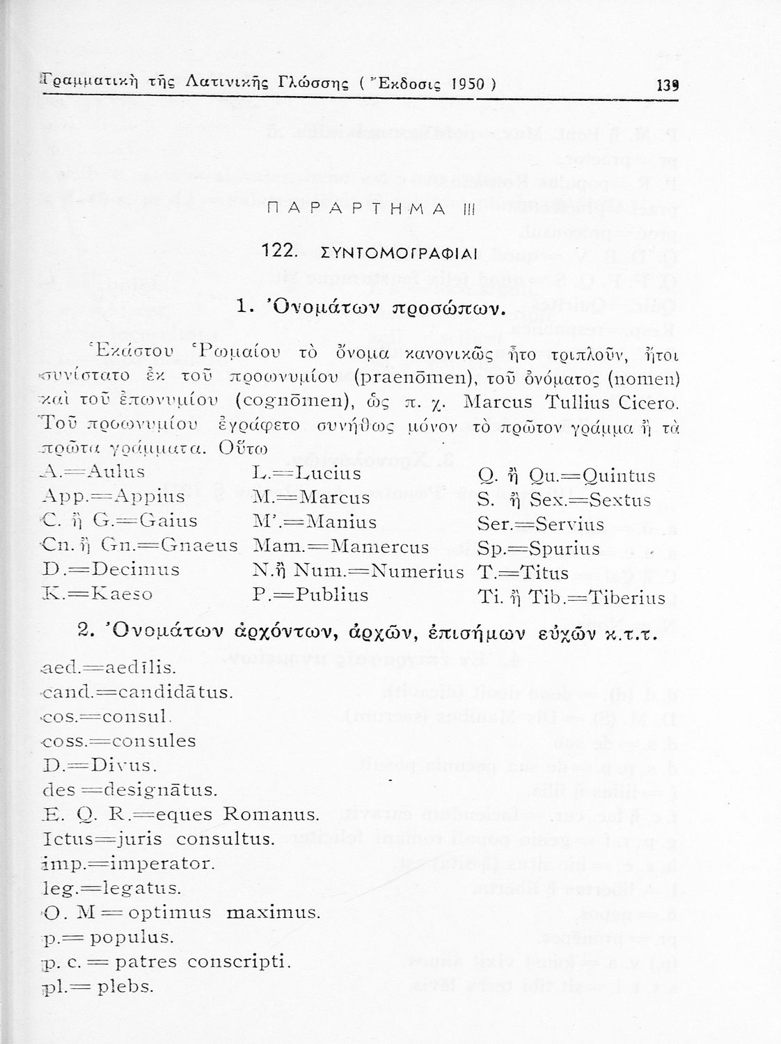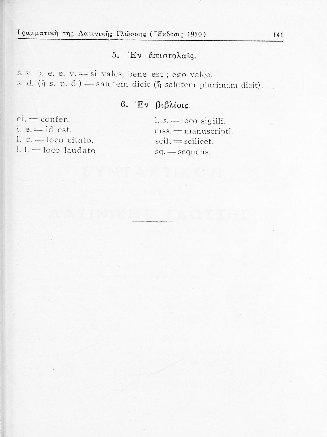 Σχολικό εγχειρίδιο Λατινικών Γυμνασίου που περιλαμβάνει γραμματική και συντακτικό και είναι χωρισμένο σε φθογγολογικό, τυπολογικό και ετυμολογικό μέρος.