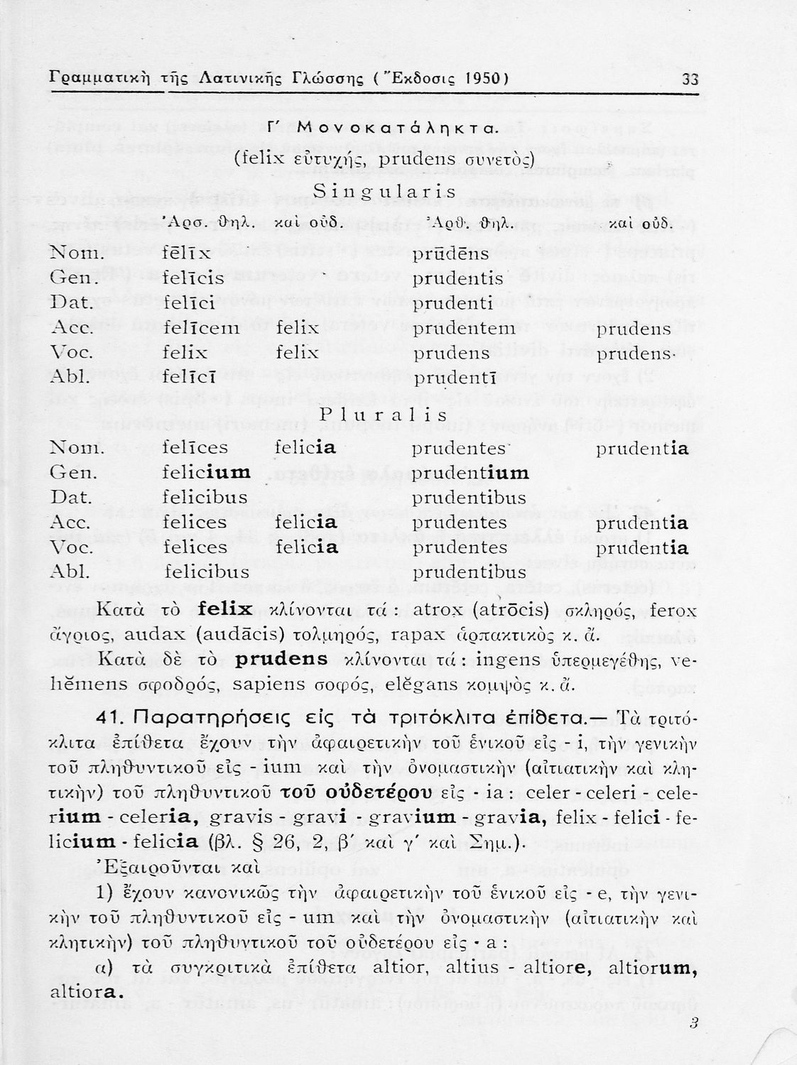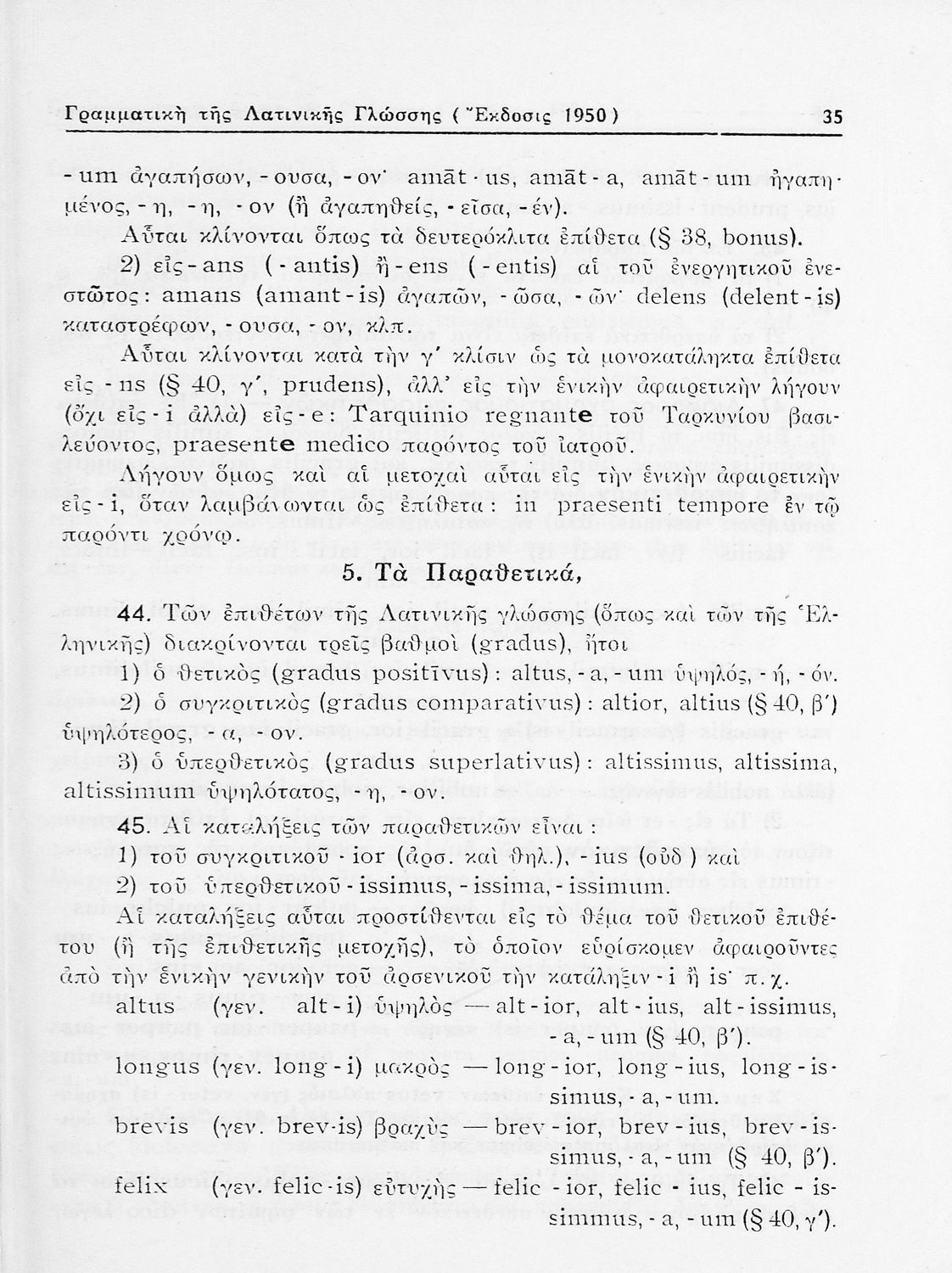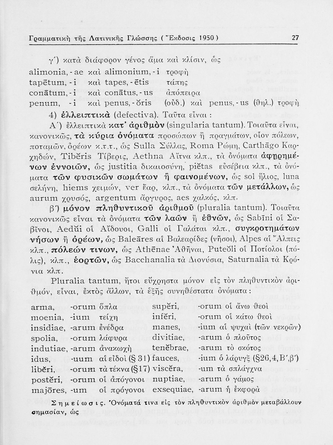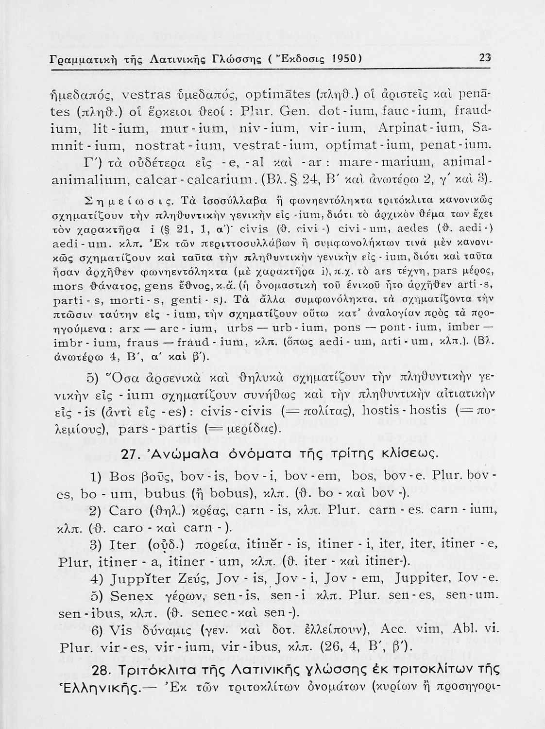 Σχολικό εγχειρίδιο Λατινικών Γυμνασίου που περιλαμβάνει γραμματική και συντακτικό και είναι χωρισμένο σε φθογγολογικό, τυπολογικό και ετυμολογικό μέρος.
