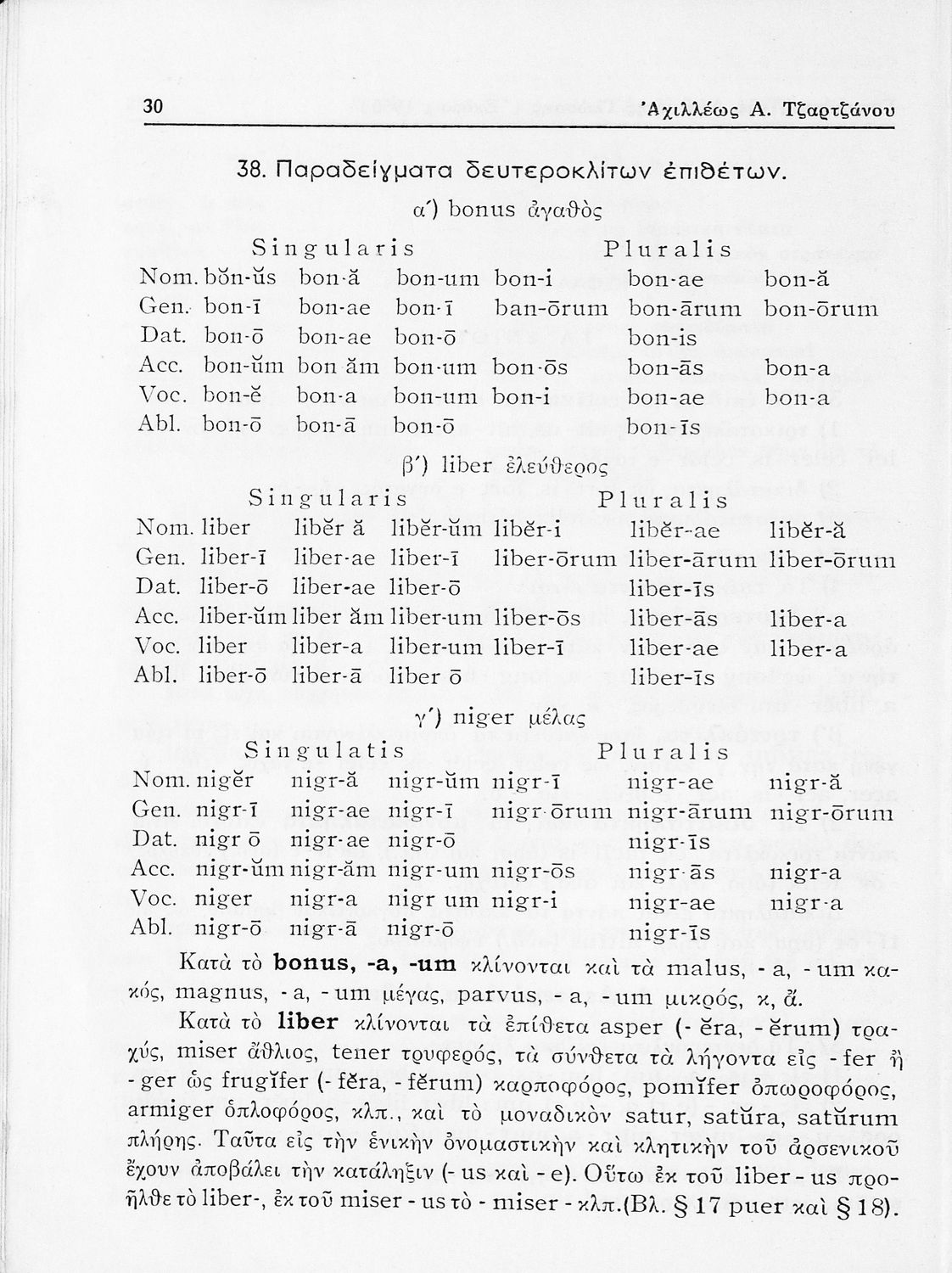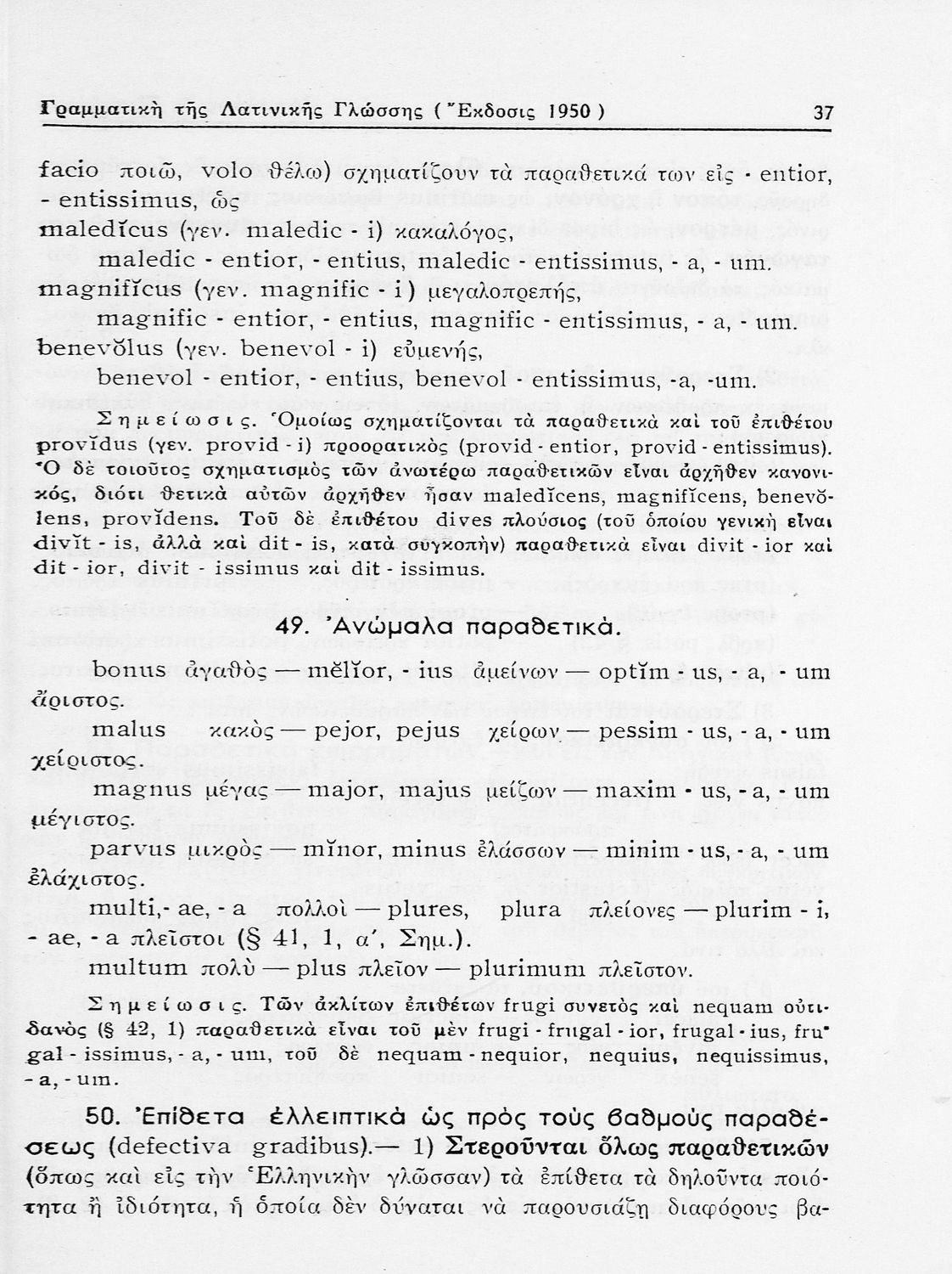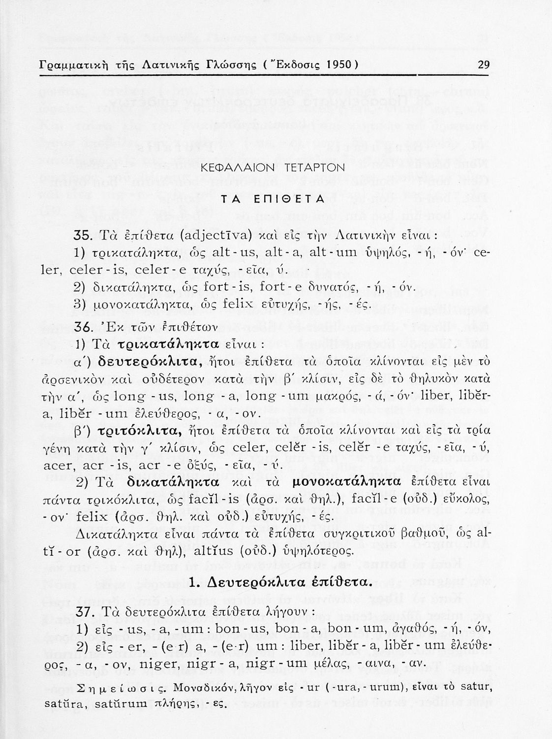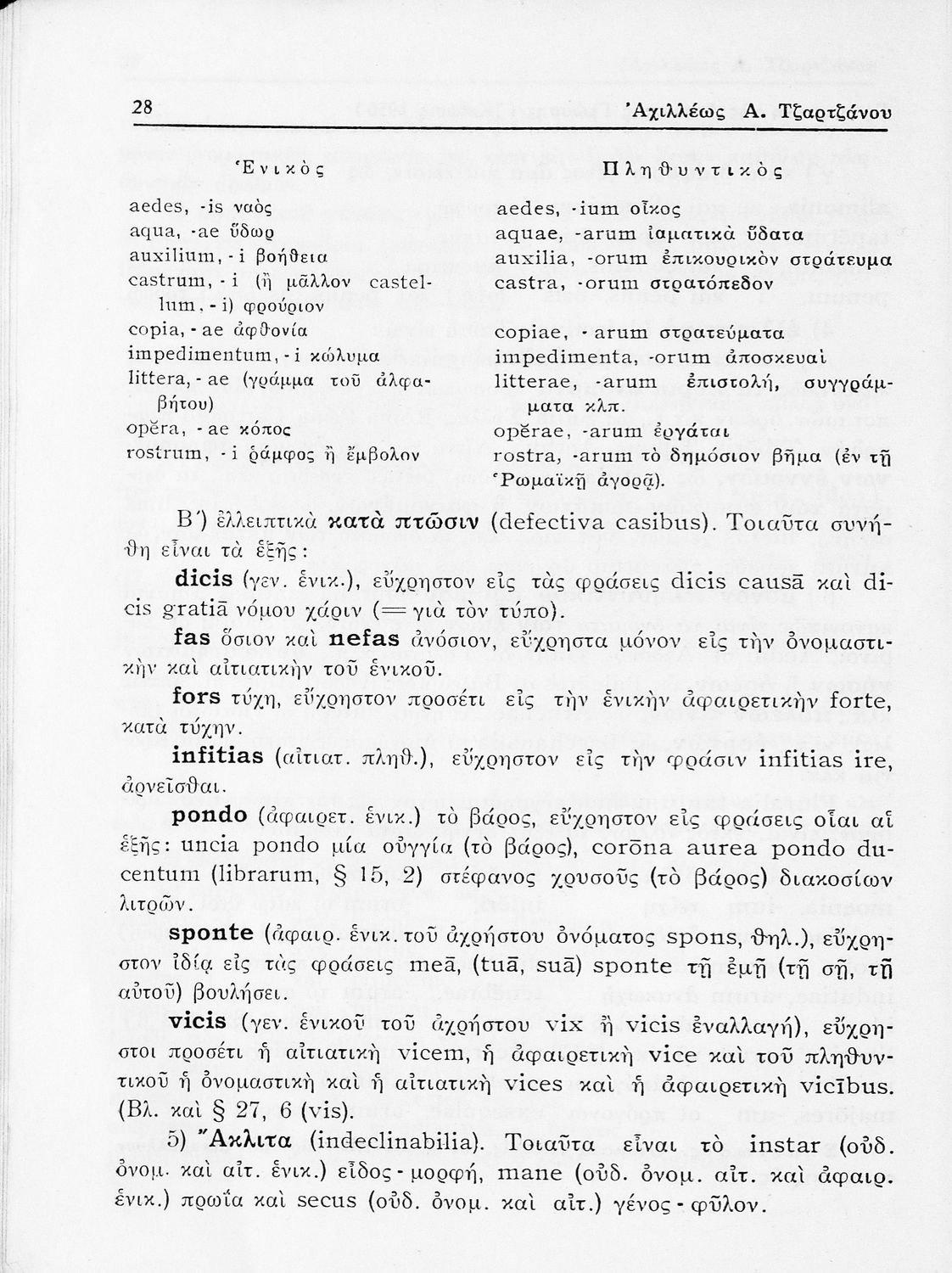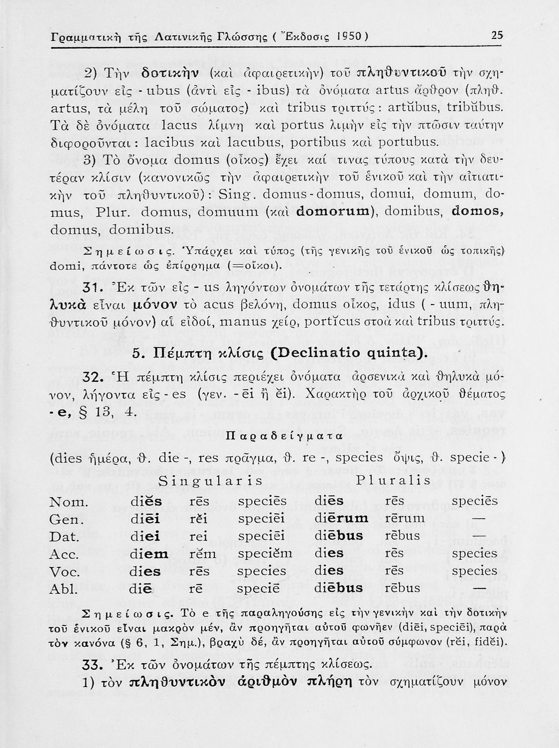 Σχολικό εγχειρίδιο Λατινικών Γυμνασίου που περιλαμβάνει γραμματική και συντακτικό και είναι χωρισμένο σε φθογγολογικό, τυπολογικό και ετυμολογικό μέρος.