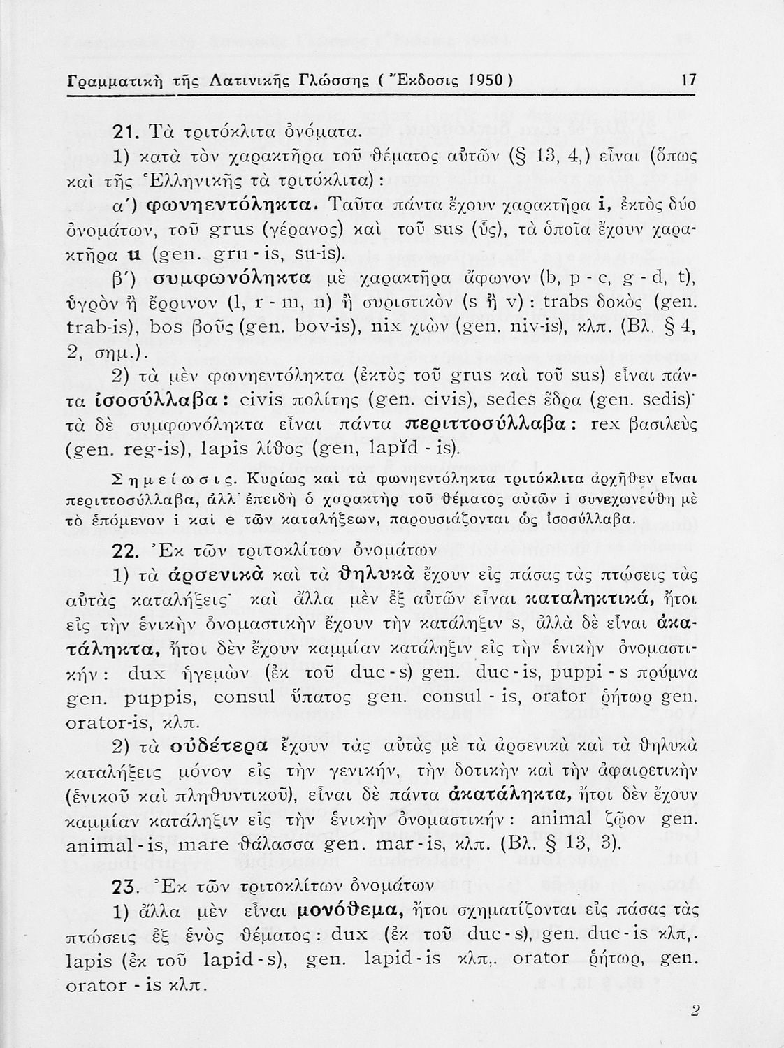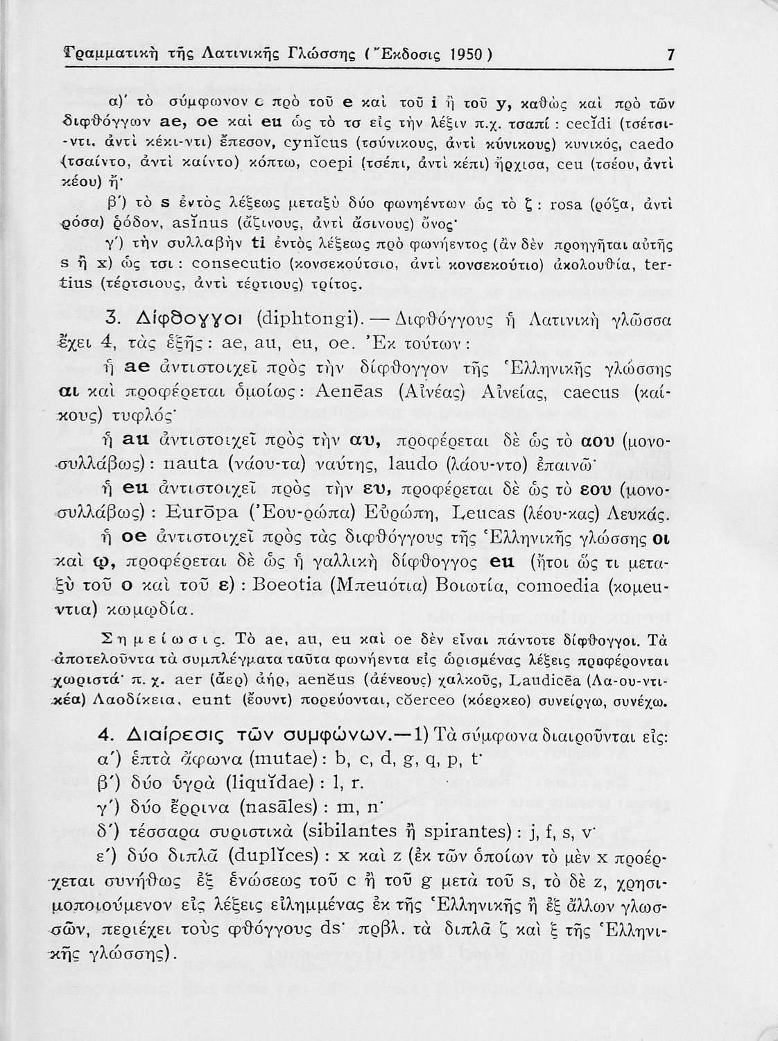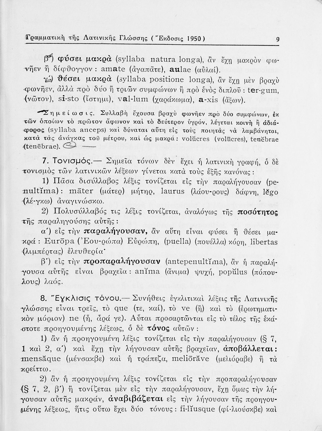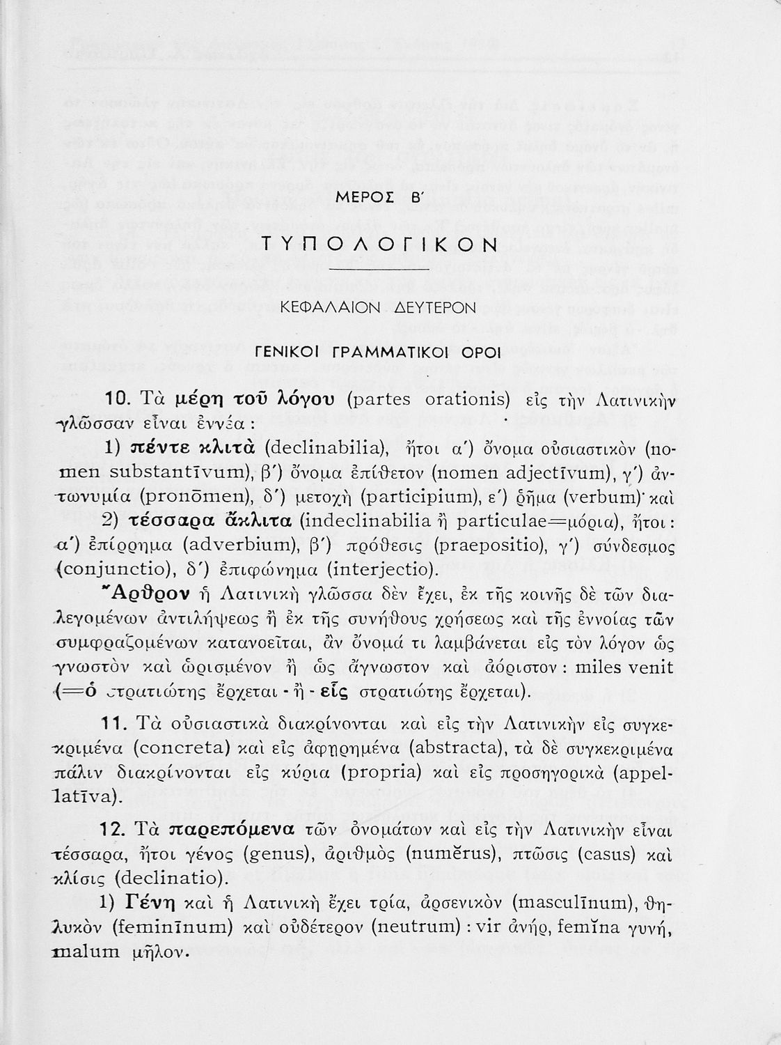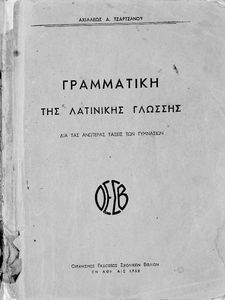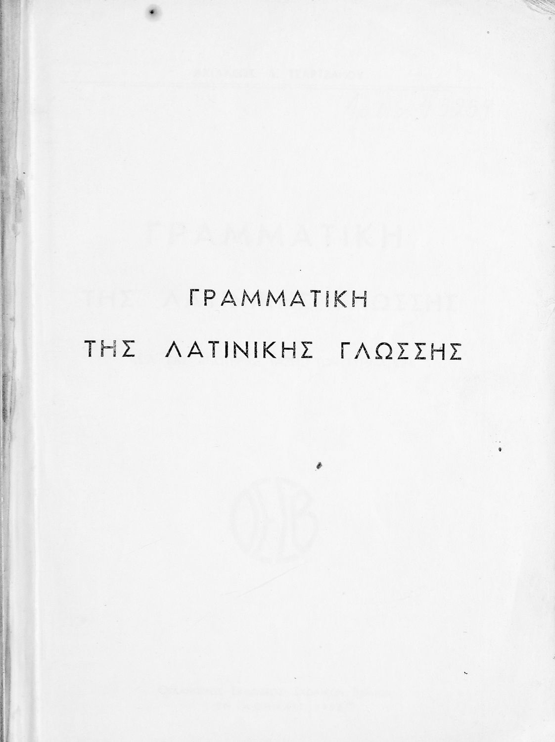Σχολικό εγχειρίδιο Λατινικών Γυμνασίου που περιλαμβάνει γραμματική και συντακτικό και είναι χωρισμένο σε φθογγολογικό, τυπολογικό και ετυμολογικό μέρος.