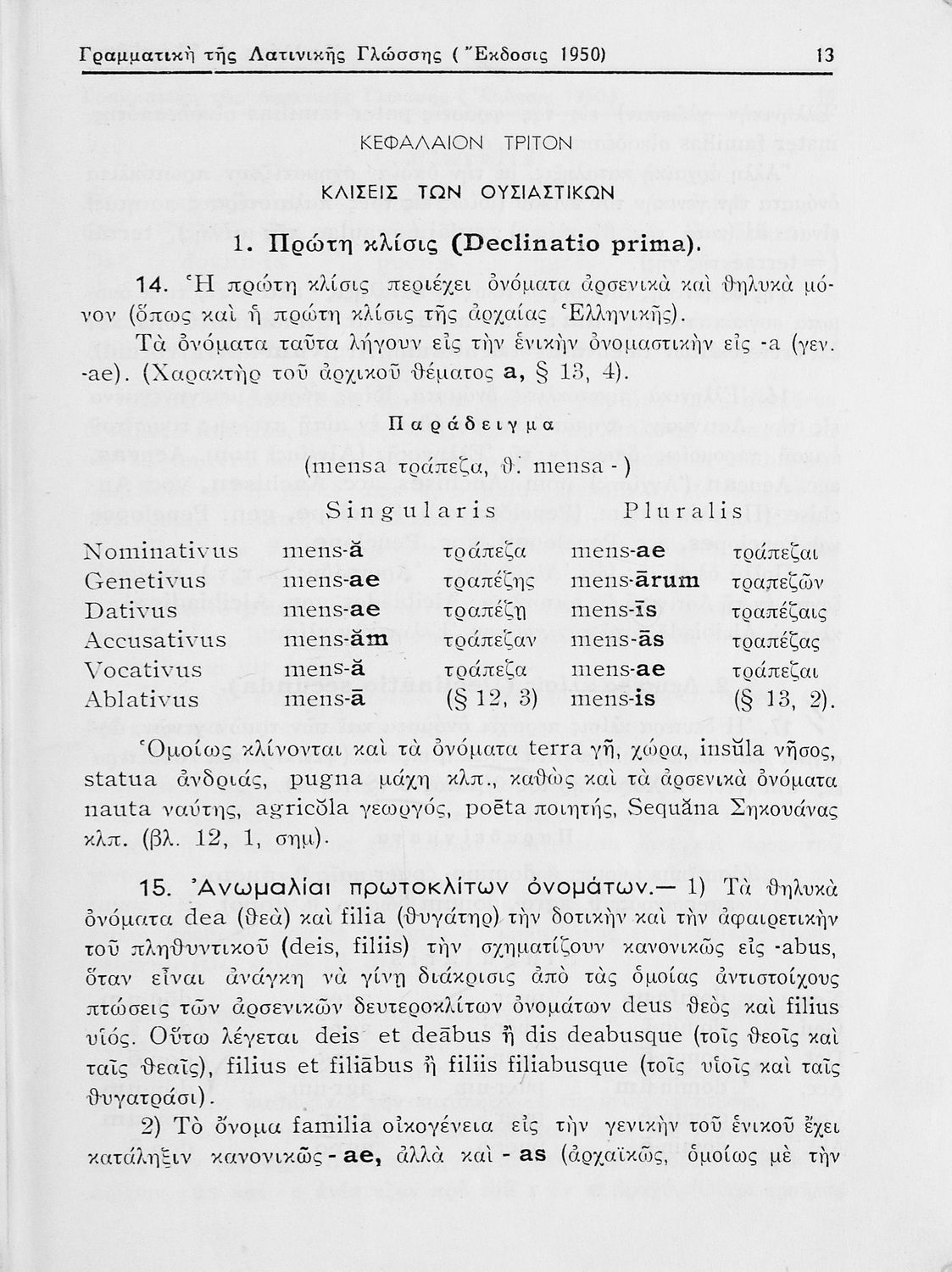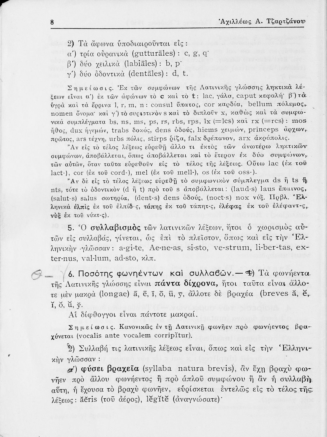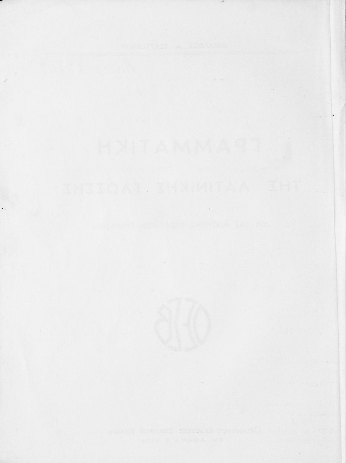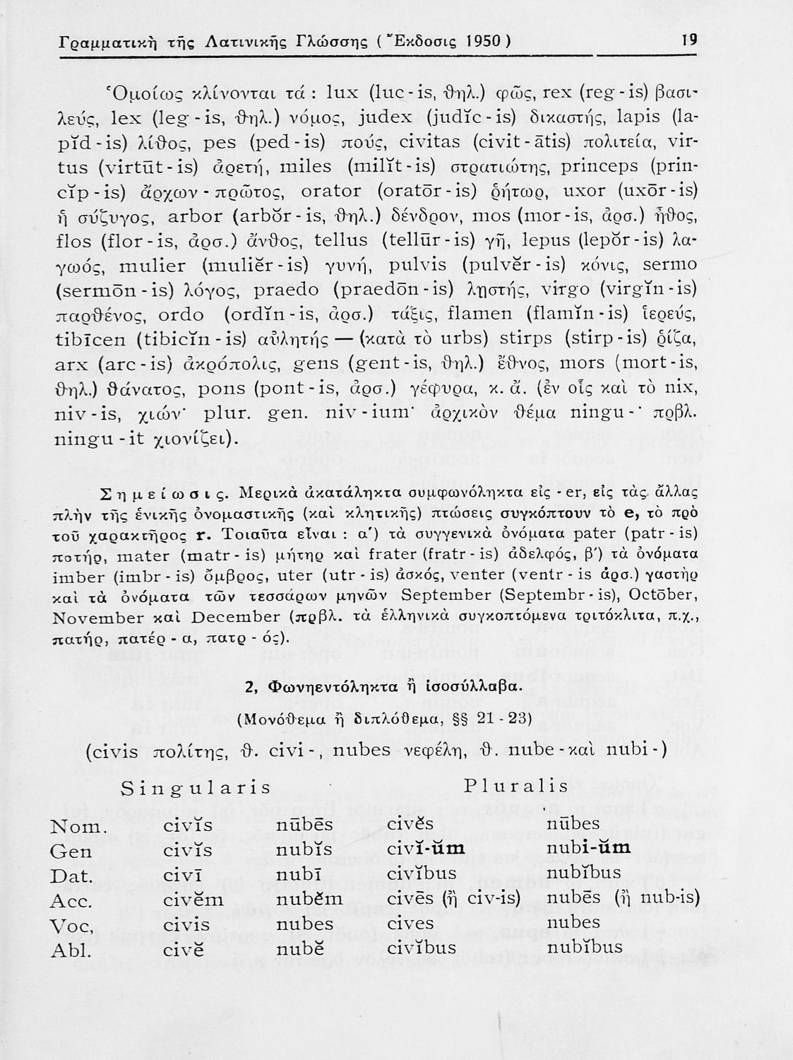 Σχολικό εγχειρίδιο Λατινικών Γυμνασίου που περιλαμβάνει γραμματική και συντακτικό και είναι χωρισμένο σε φθογγολογικό, τυπολογικό και ετυμολογικό μέρος.