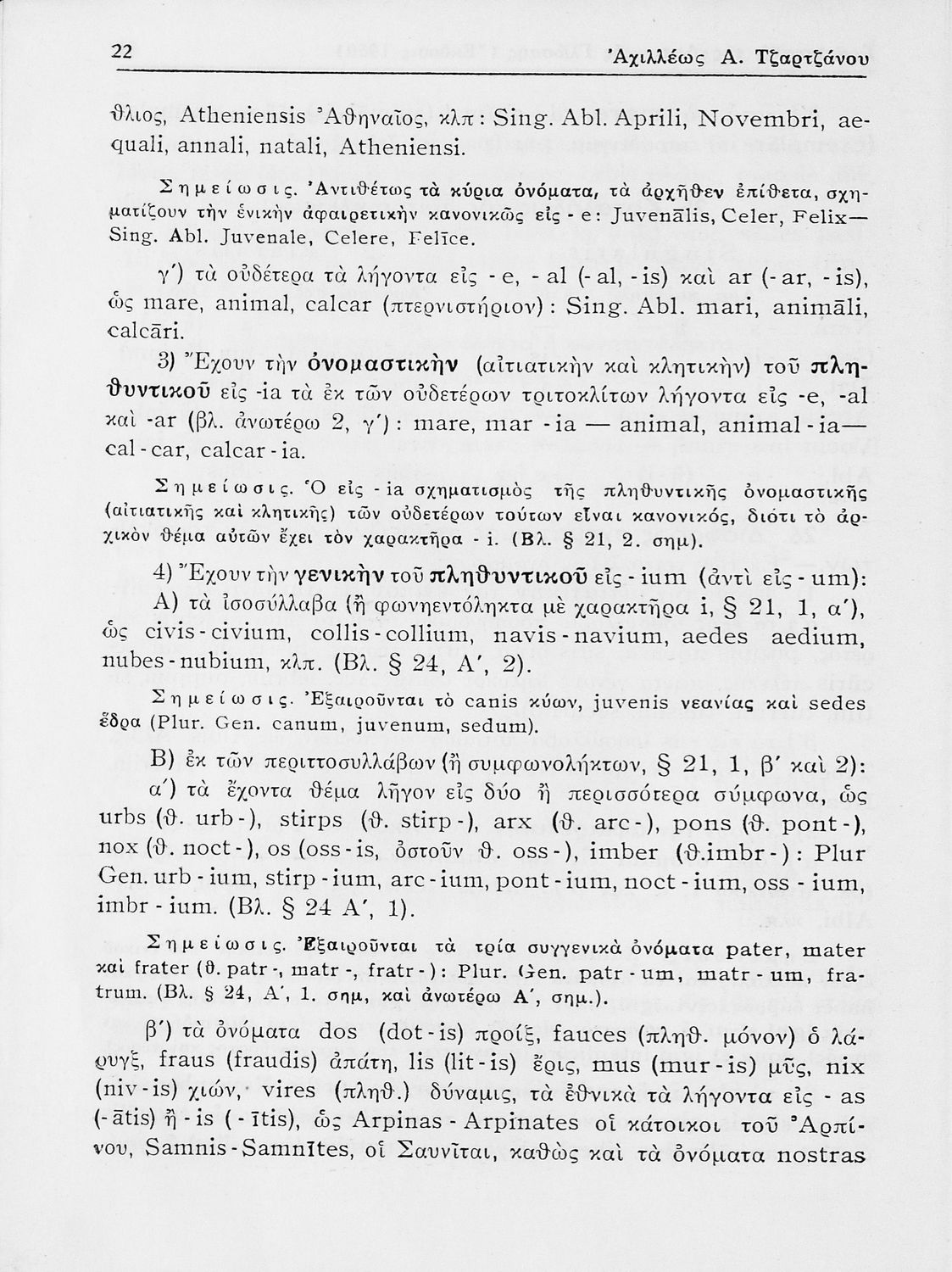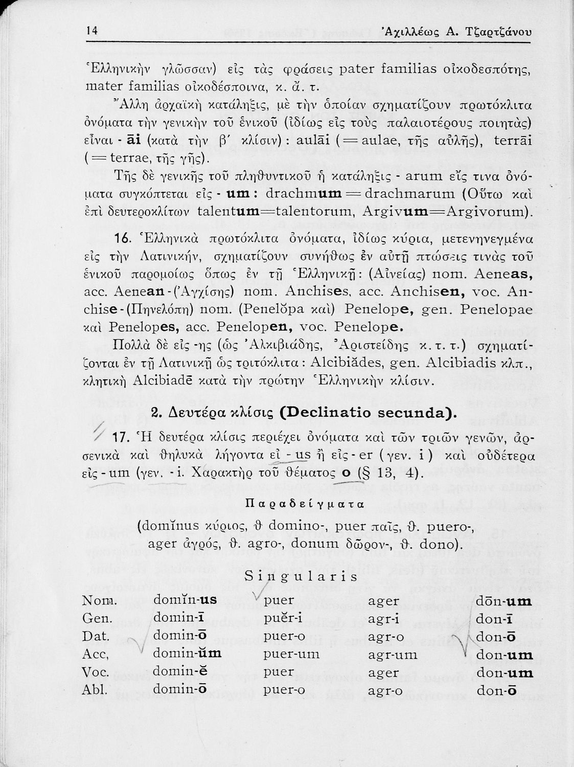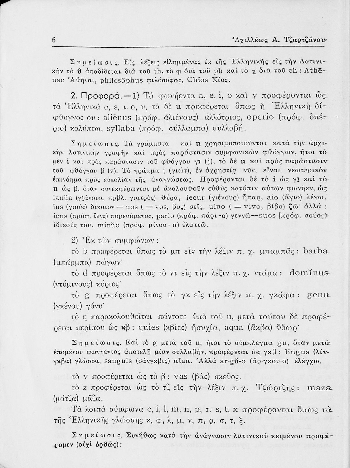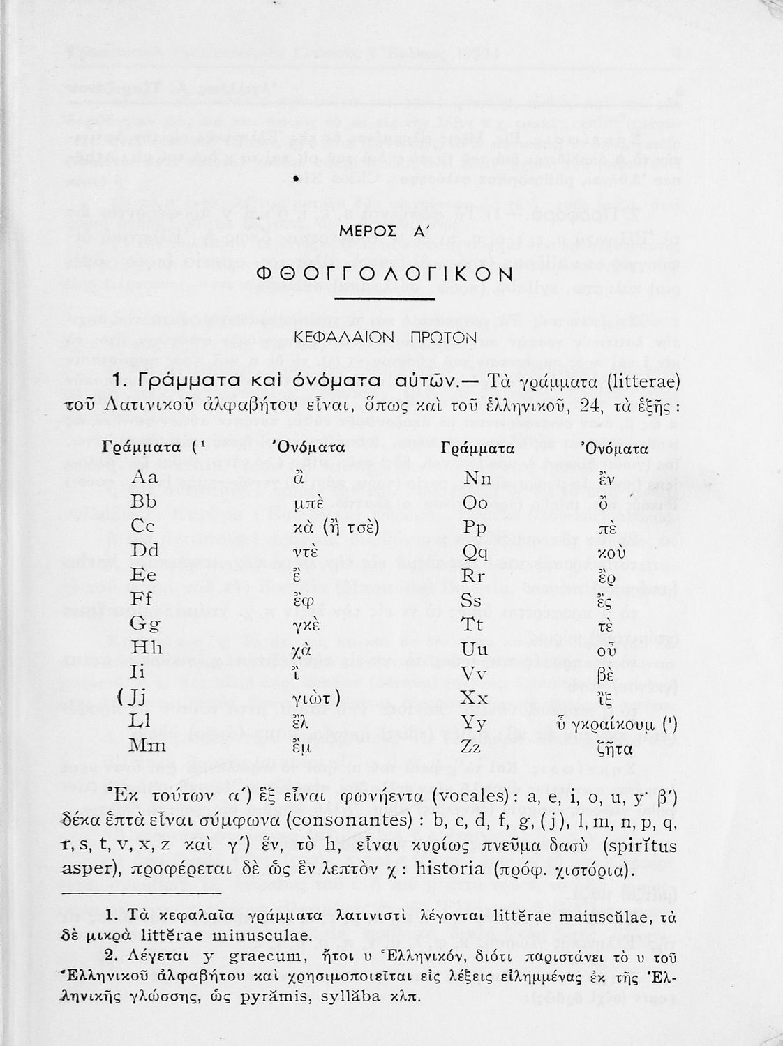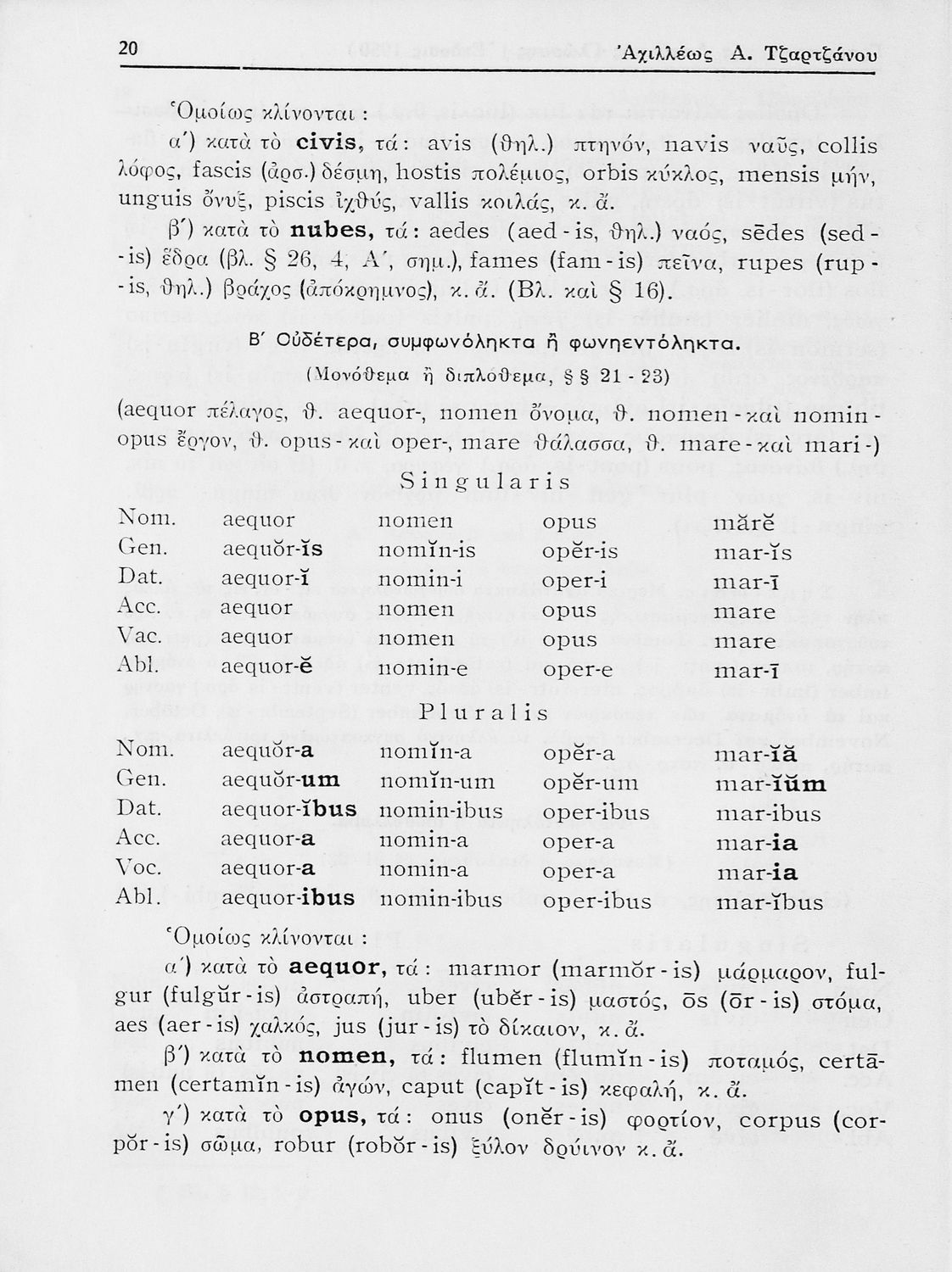 Σχολικό εγχειρίδιο Λατινικών Γυμνασίου που περιλαμβάνει γραμματική και συντακτικό και είναι χωρισμένο σε φθογγολογικό, τυπολογικό και ετυμολογικό μέρος.