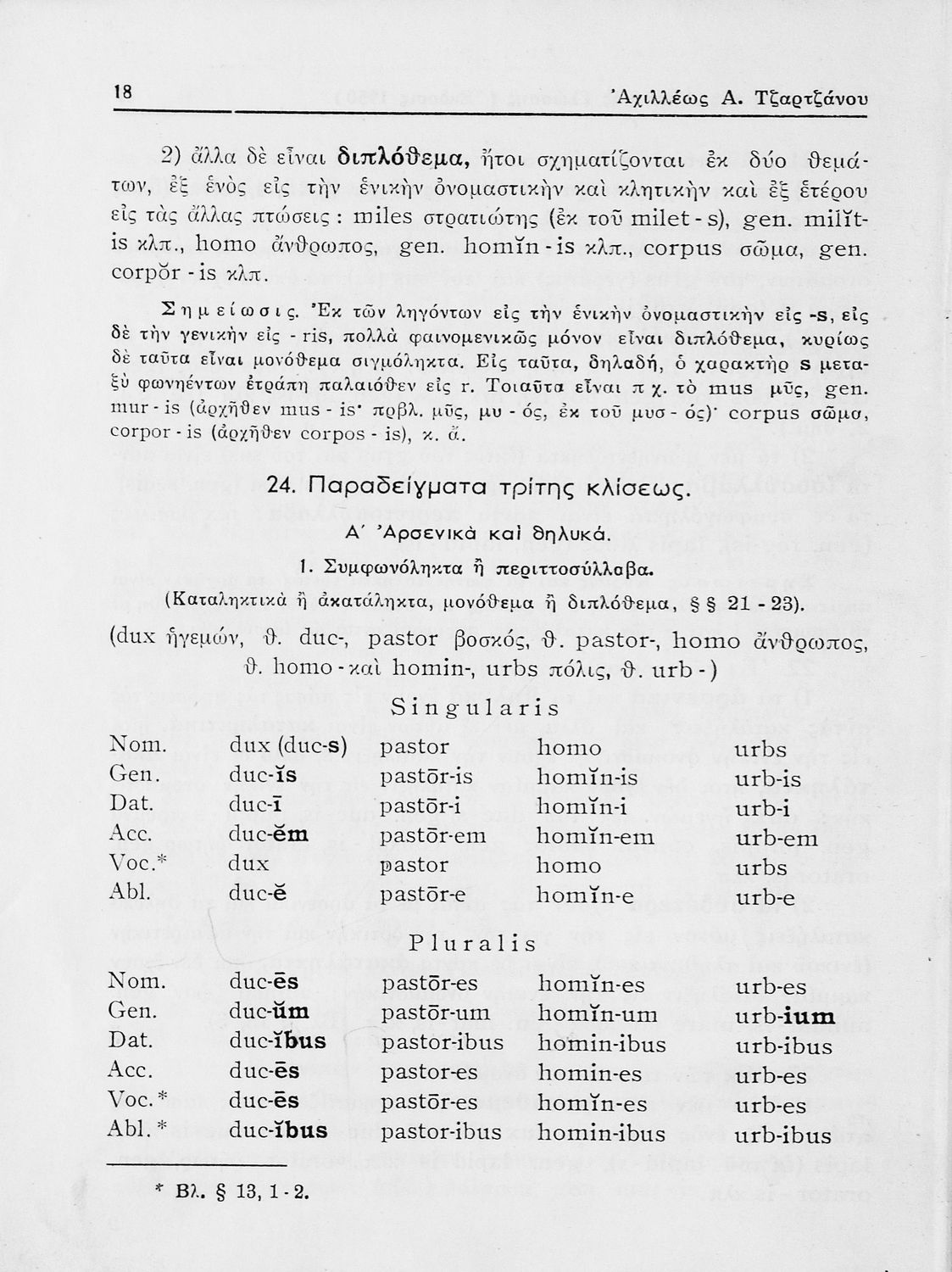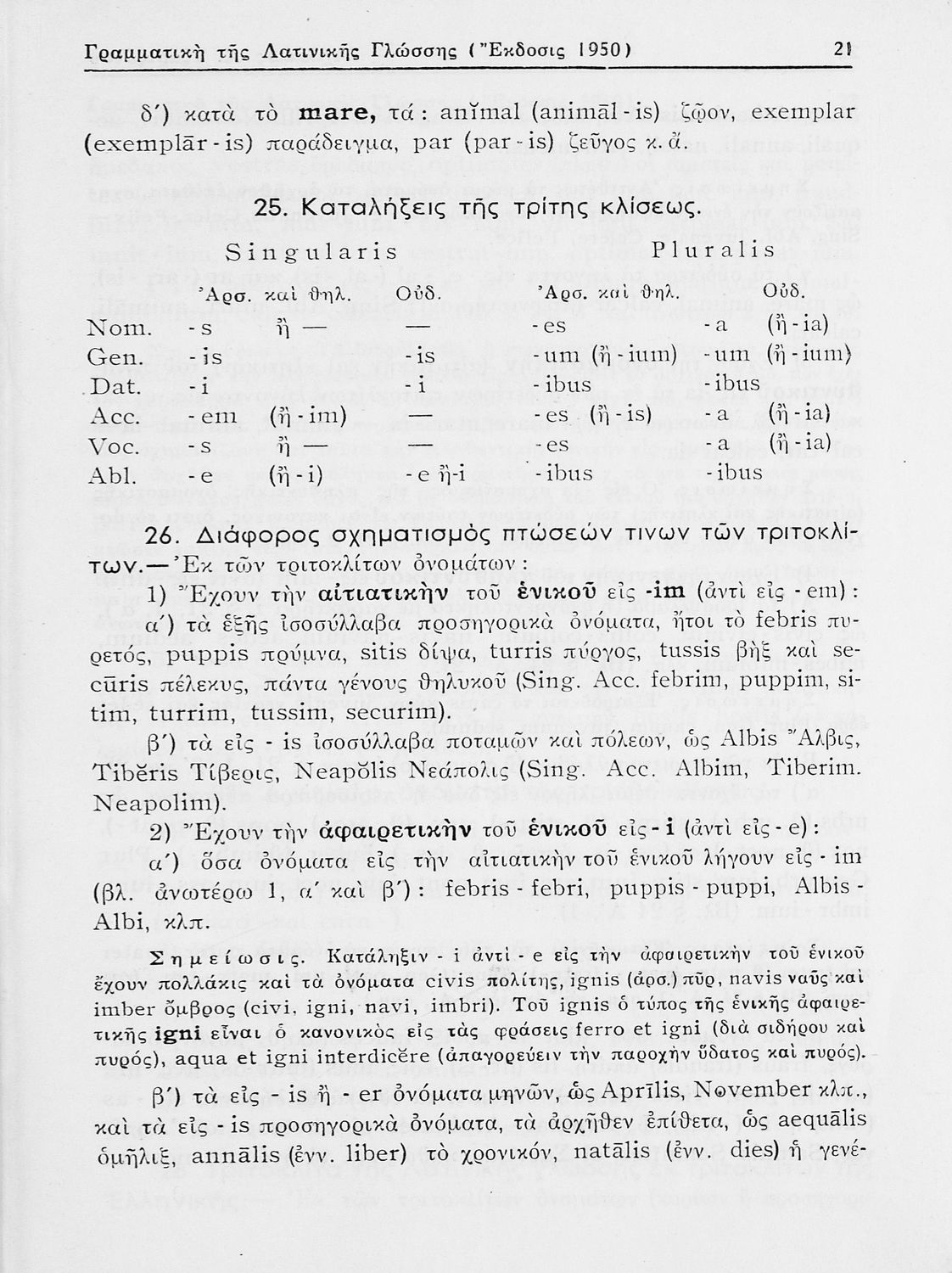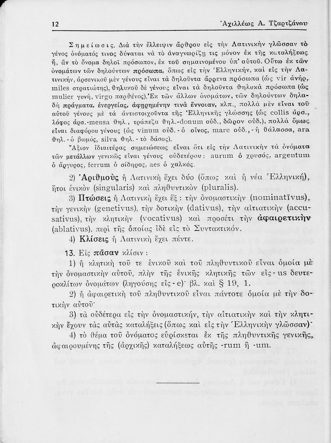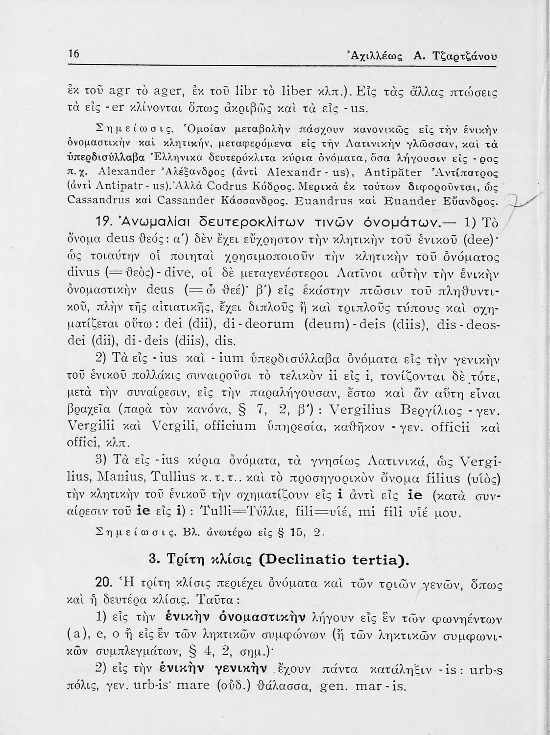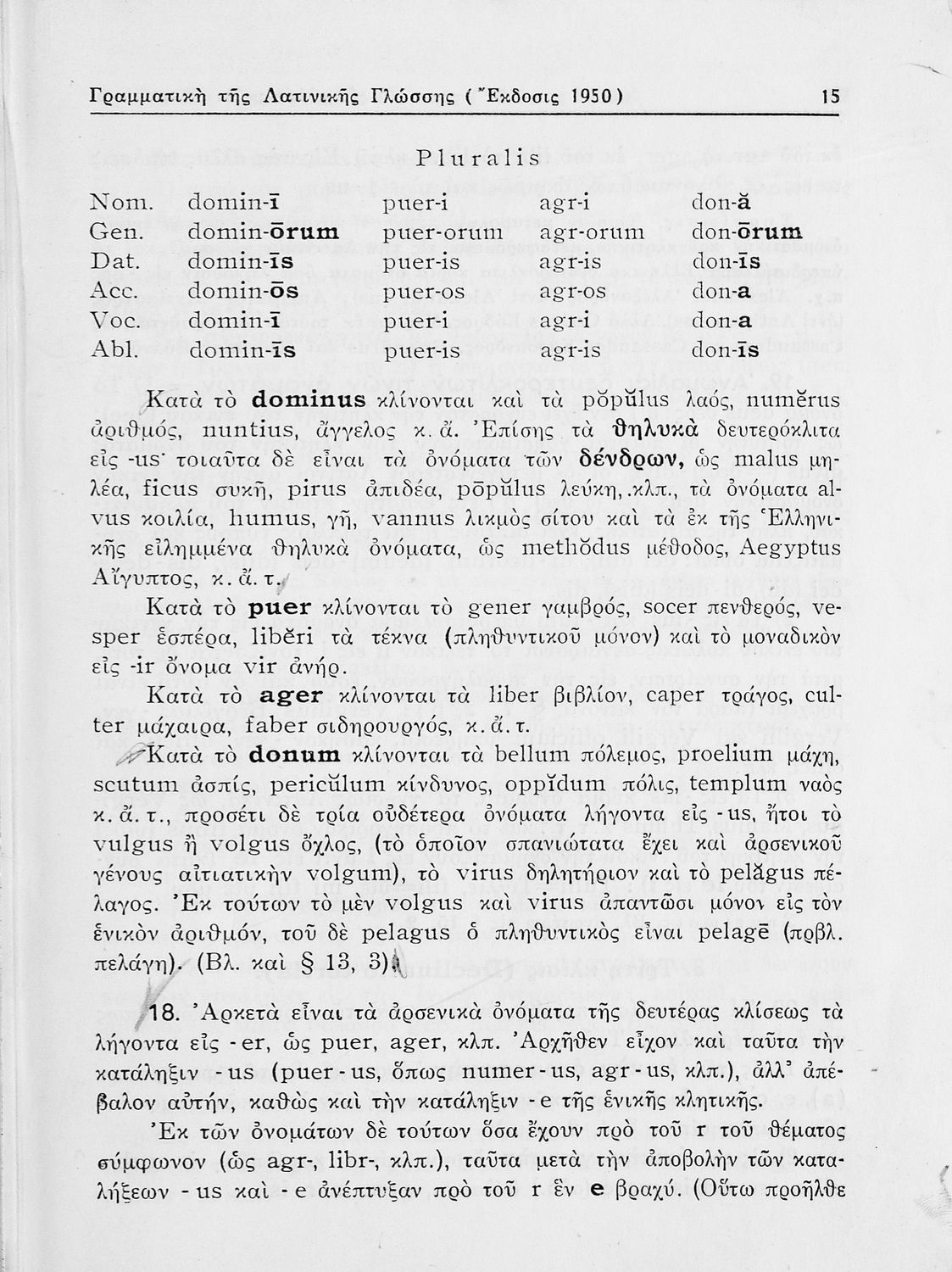 Σχολικό εγχειρίδιο Λατινικών Γυμνασίου που περιλαμβάνει γραμματική και συντακτικό και είναι χωρισμένο σε φθογγολογικό, τυπολογικό και ετυμολογικό μέρος.