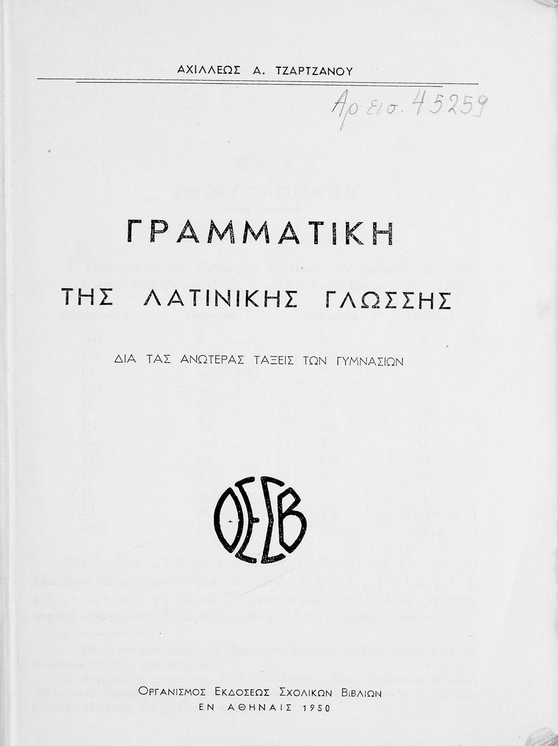 Κωδικός αναγνώρισης: 01-45259 Τίτλος: Γραμματική της λατινικής γλώσσης δια τας ανωτέρας τάξεις των Γυμνασίων Συγγραφέας: Αχιλλέας Α. Τζάρτζανος Μέγεθος και υπόστρωμα: Σχολικό εγχειρίδιο, 19εκ., μαλακό εξώφυλλο, 202 σελίδες. |