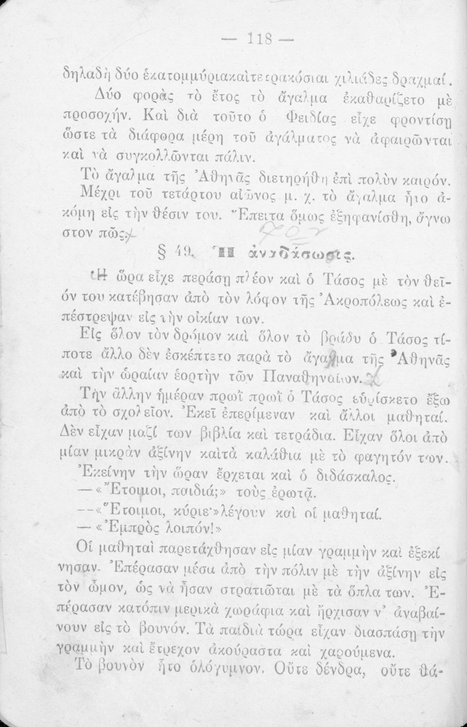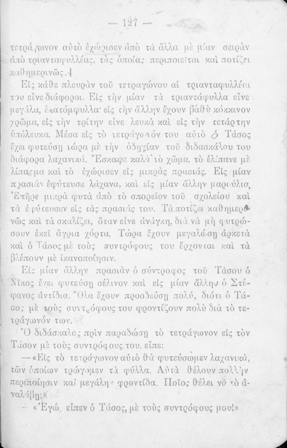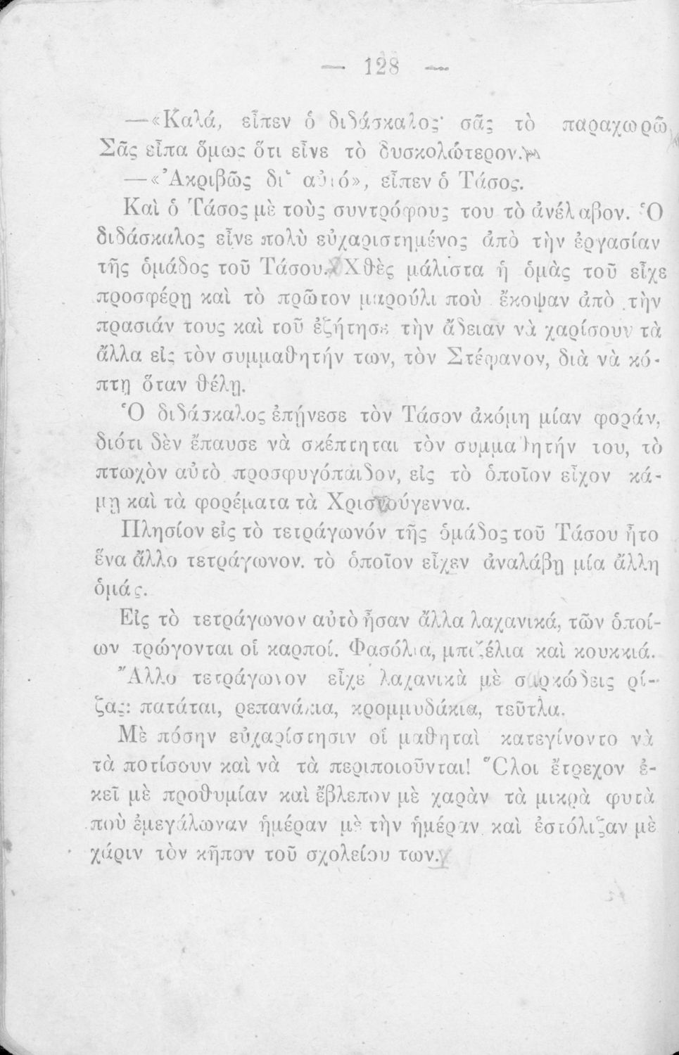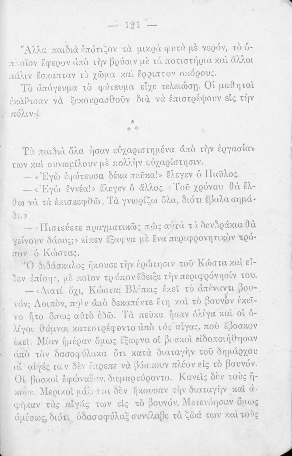 Βαθμίδα εκπαίδευσης: Πρωτοβάθμια Τάξη: Δ' Δημοτικού Μάθημα: Νέα Ελληνικά Γλώσσα: Απλή καθαρεύουσα Παρουσίαση περιεχομένου: Αναγνωστικό Δ' Δημοτικού που περιέχει πεζά και κείμενα εμπνευσμένα από ιστορικά γεγονότα, τη θρησκευτική και κοινωνική ζωή και τη φύση. Ο συγγραφέας ήταν δάσκαλος. |