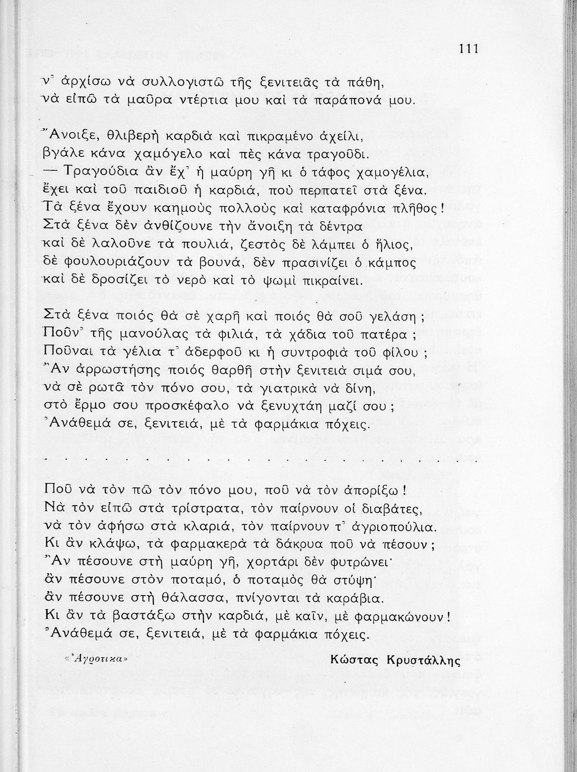 Σχολικό εγχειρίδιο Νέων Ελληνικών Δ΄ Γυμνασίου Θηλέων που περιλαμβάνει πεζά, ποιήματα και δημοτικά τραγούδια εμπνευσμένα από την σύγχρονη ελληνική ιστορία και την οικογενειακή και θρησκευτική ζωή. Περιέχει και