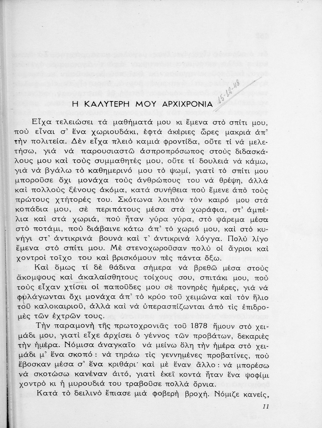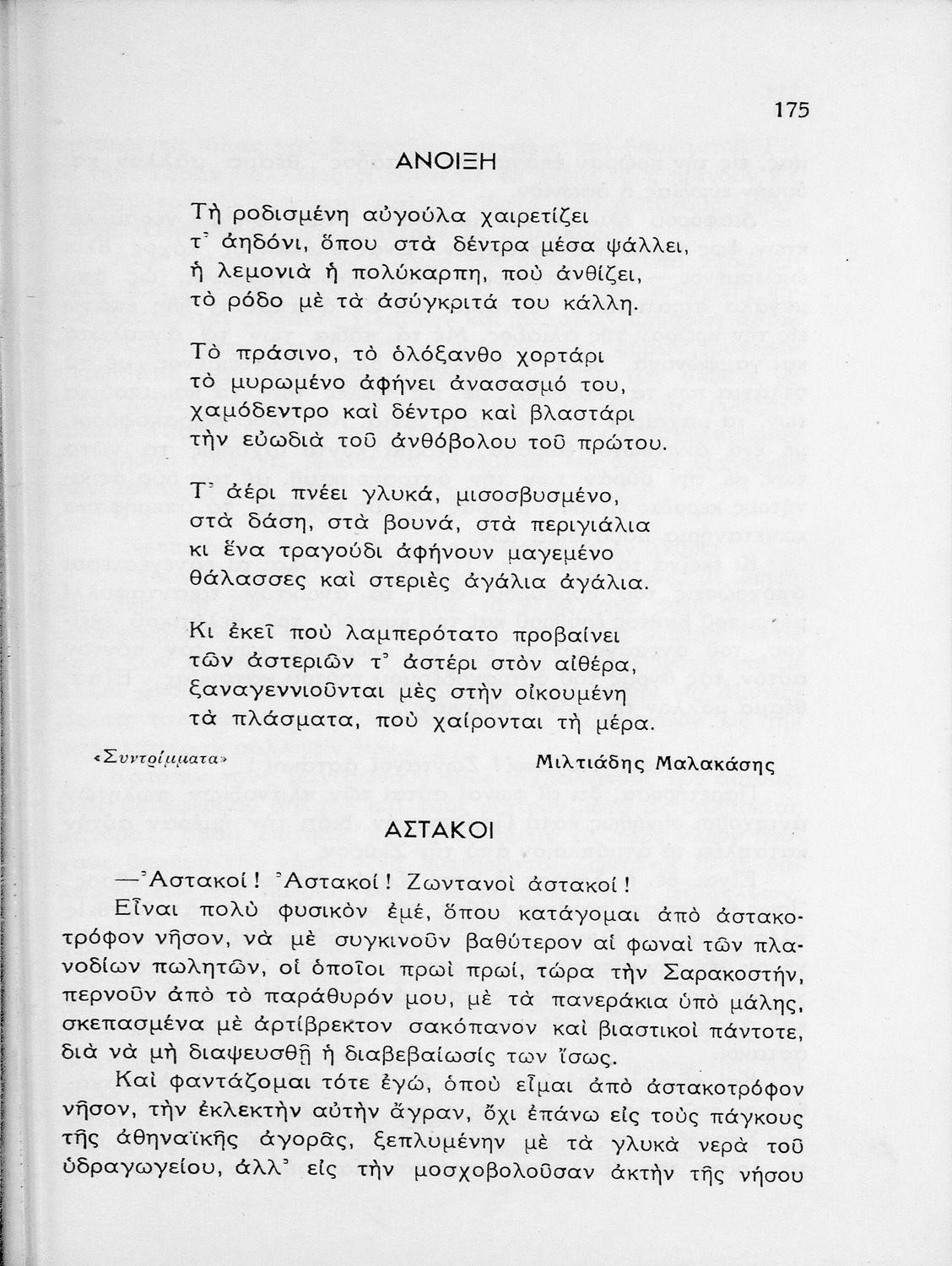 Σχολικό εγχειρίδιο Νέων Ελληνικών Δ΄ Γυμνασίου Θηλέων που περιλαμβάνει πεζά, ποιήματα και δημοτικά τραγούδια εμπνευσμένα από την σύγχρονη ελληνική ιστορία και την οικογενειακή και θρησκευτική ζωή. Περιέχει και