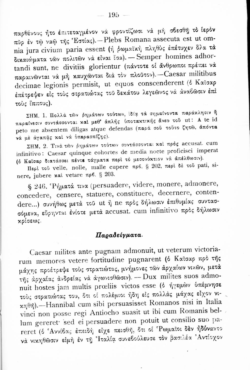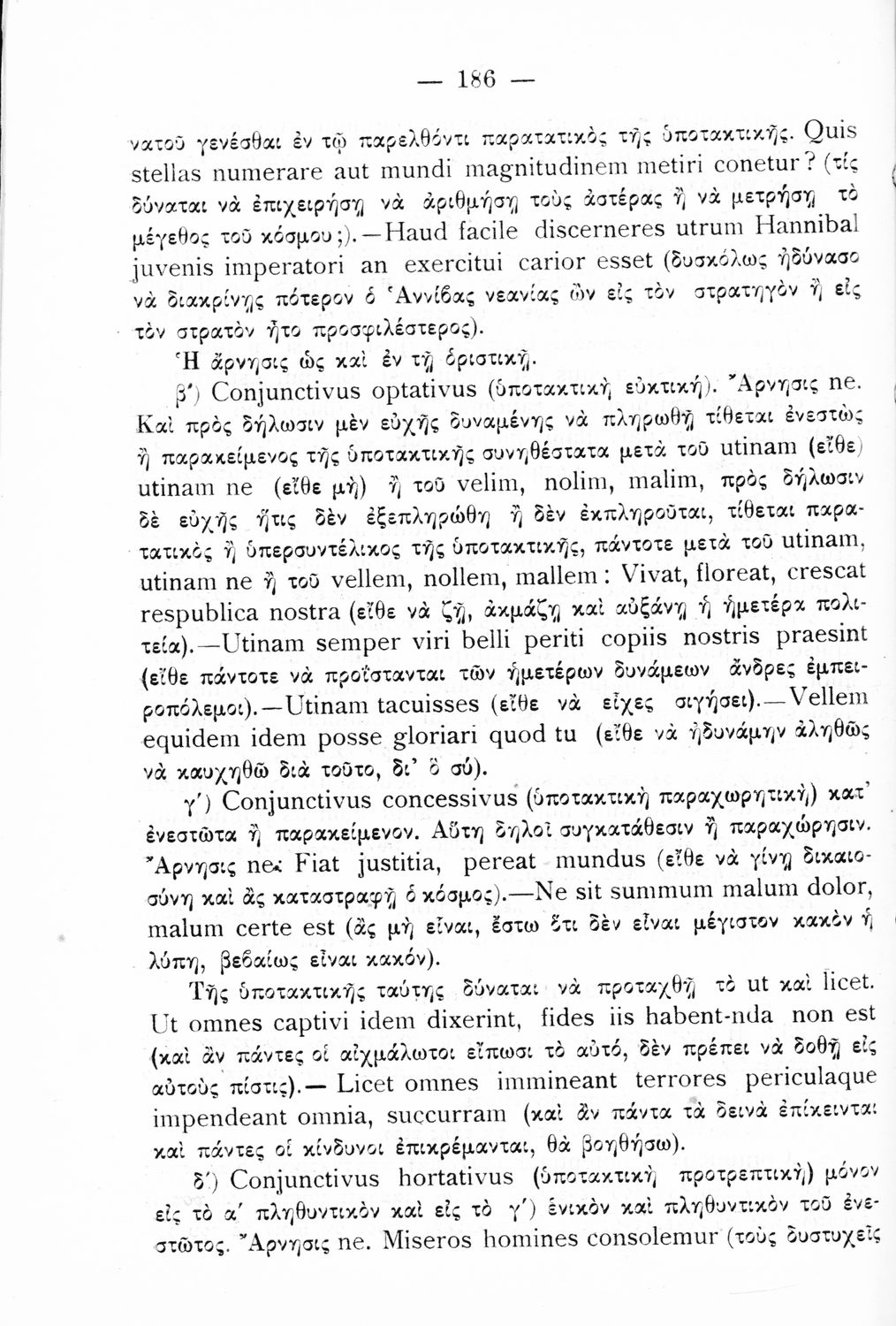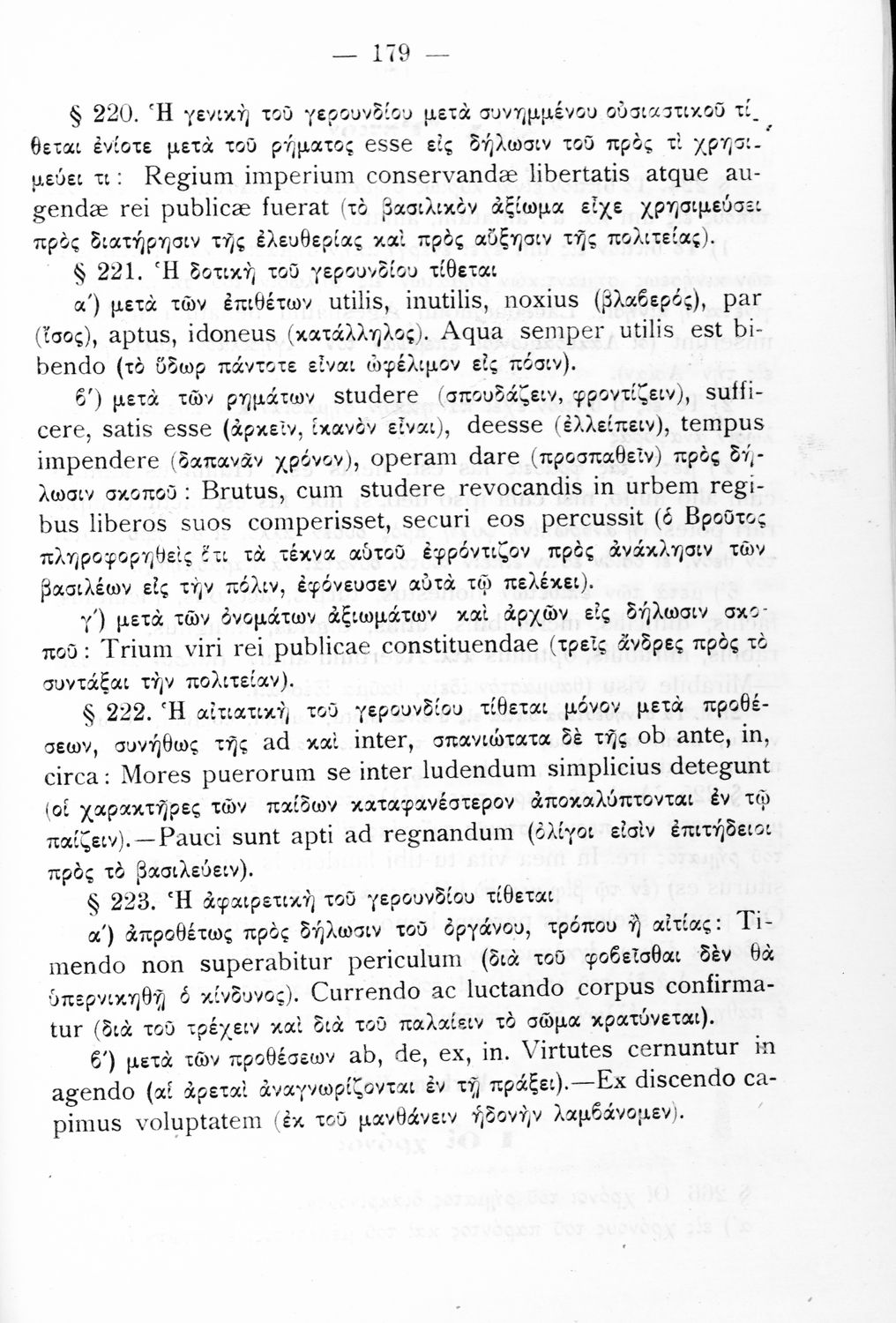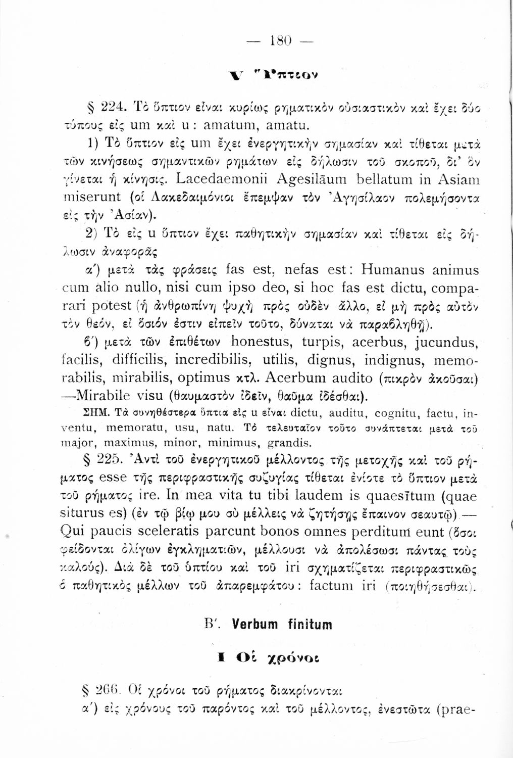 Γραμματικής της λατινικής γλώσσας για τα Ελληνικά Σχολεία και Γυμνάσια που περιέχει δύο τμήματα: το τεχνολογικό που εστιάζει στα μέρη του λόγου και το συντακτικό που ασχολείται με τις πτώσεις, τις εγκλίσεις, ...