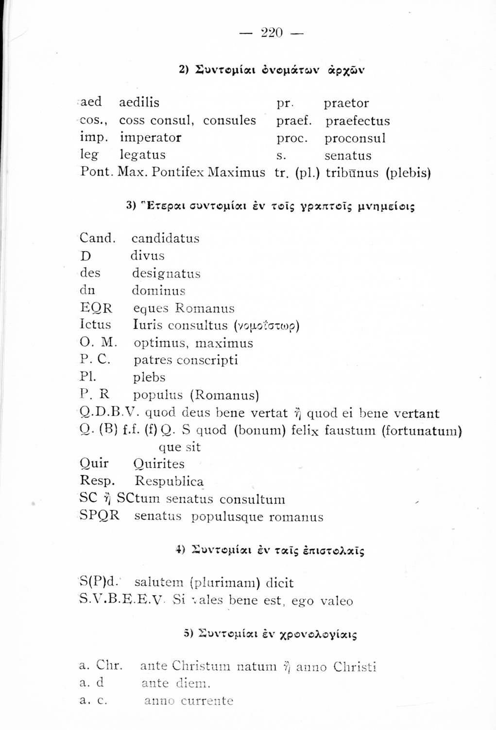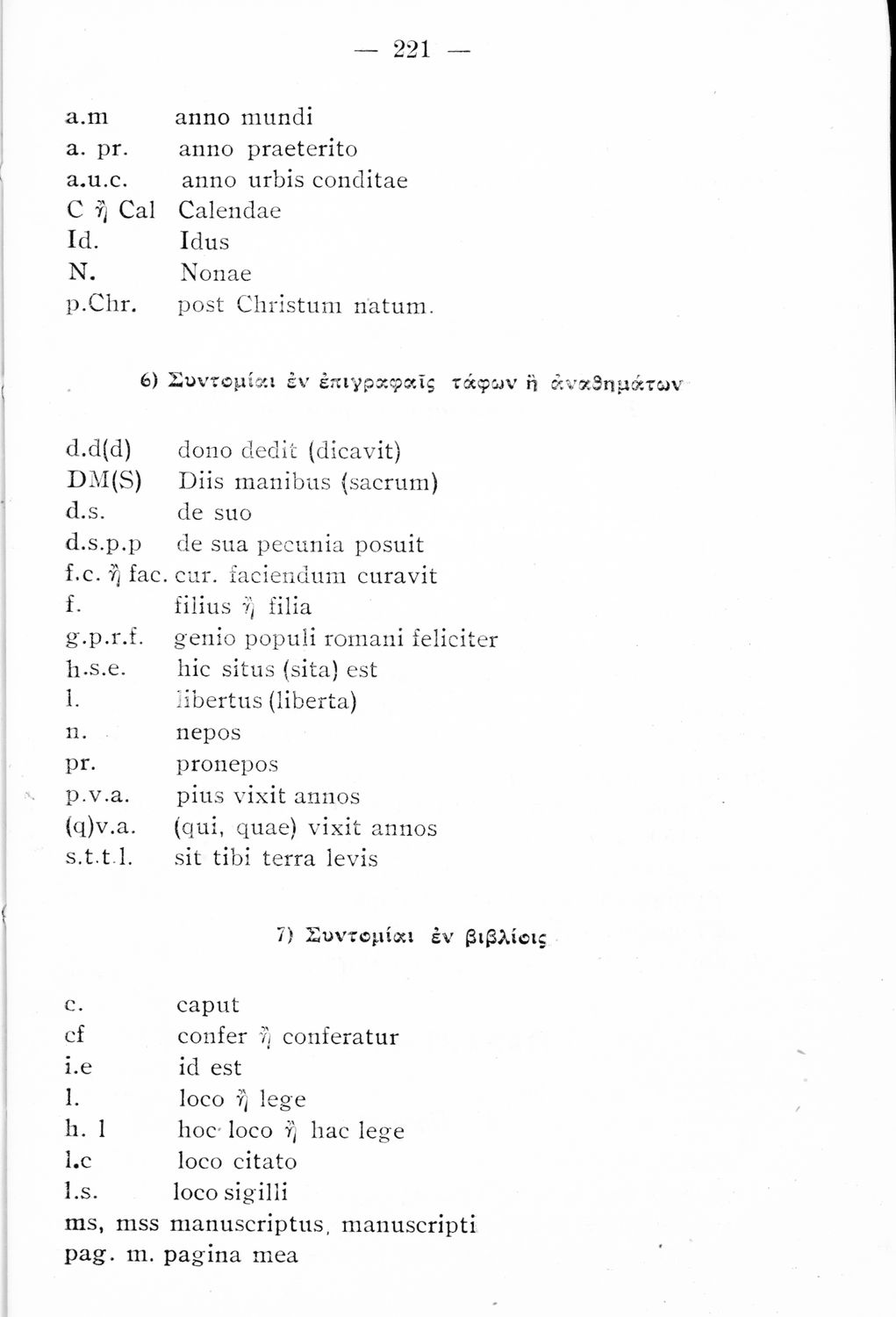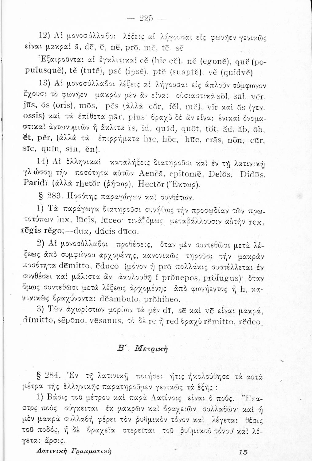 Σχολικό εγχειρίδιο Λατινικών Α΄, Β΄, Γ' Γυμνασίου που περιλαμβάνει γραμματική και συντακτικό και είναι χωρισμένο σε φθογγολογικό, τυπολογικό και ετυμολογικό μέρος.