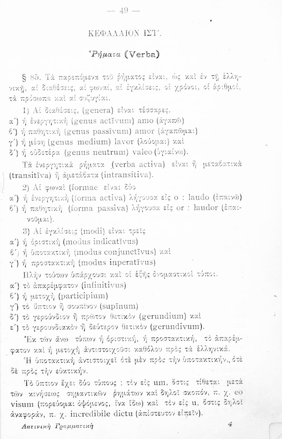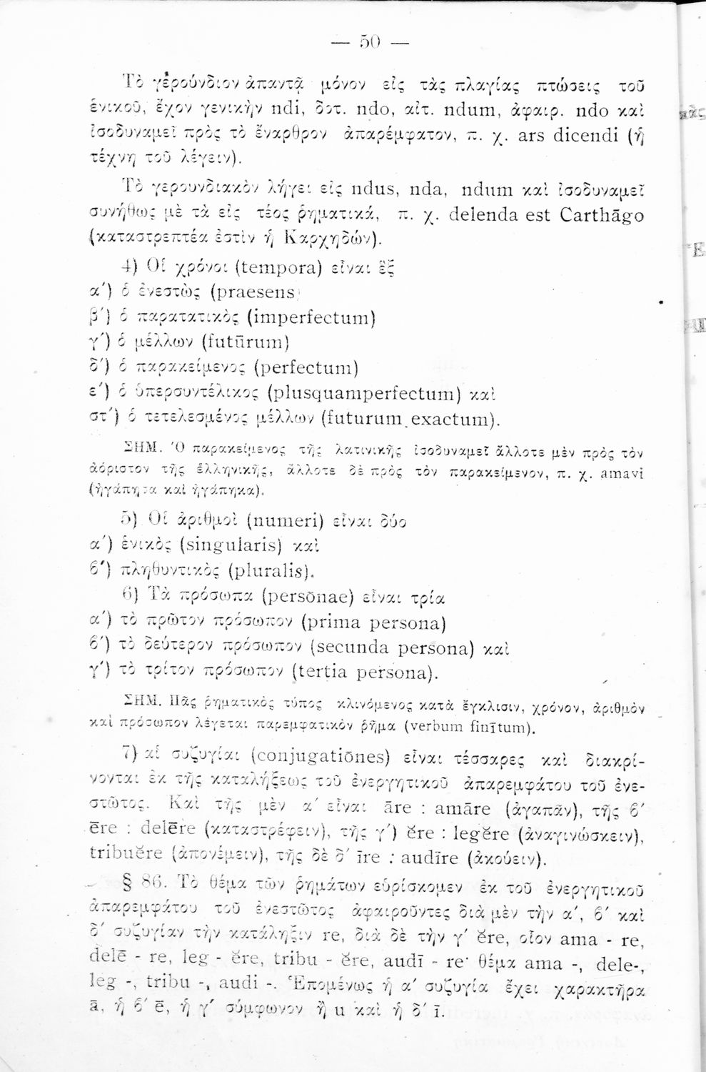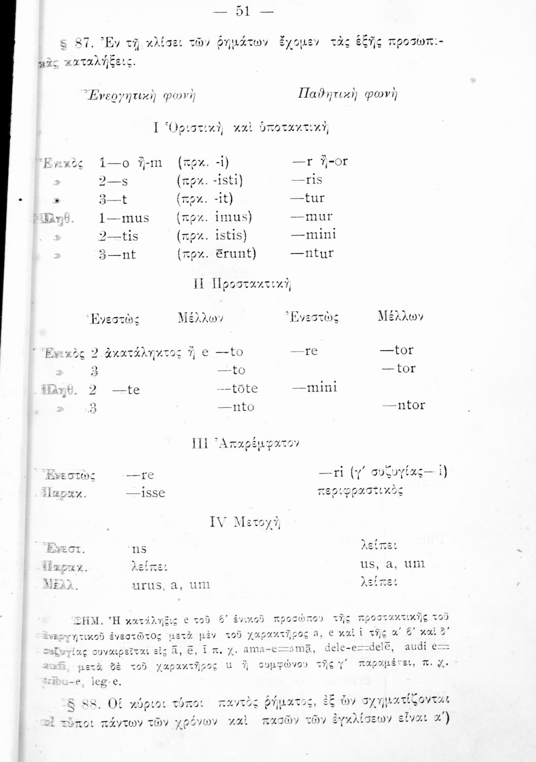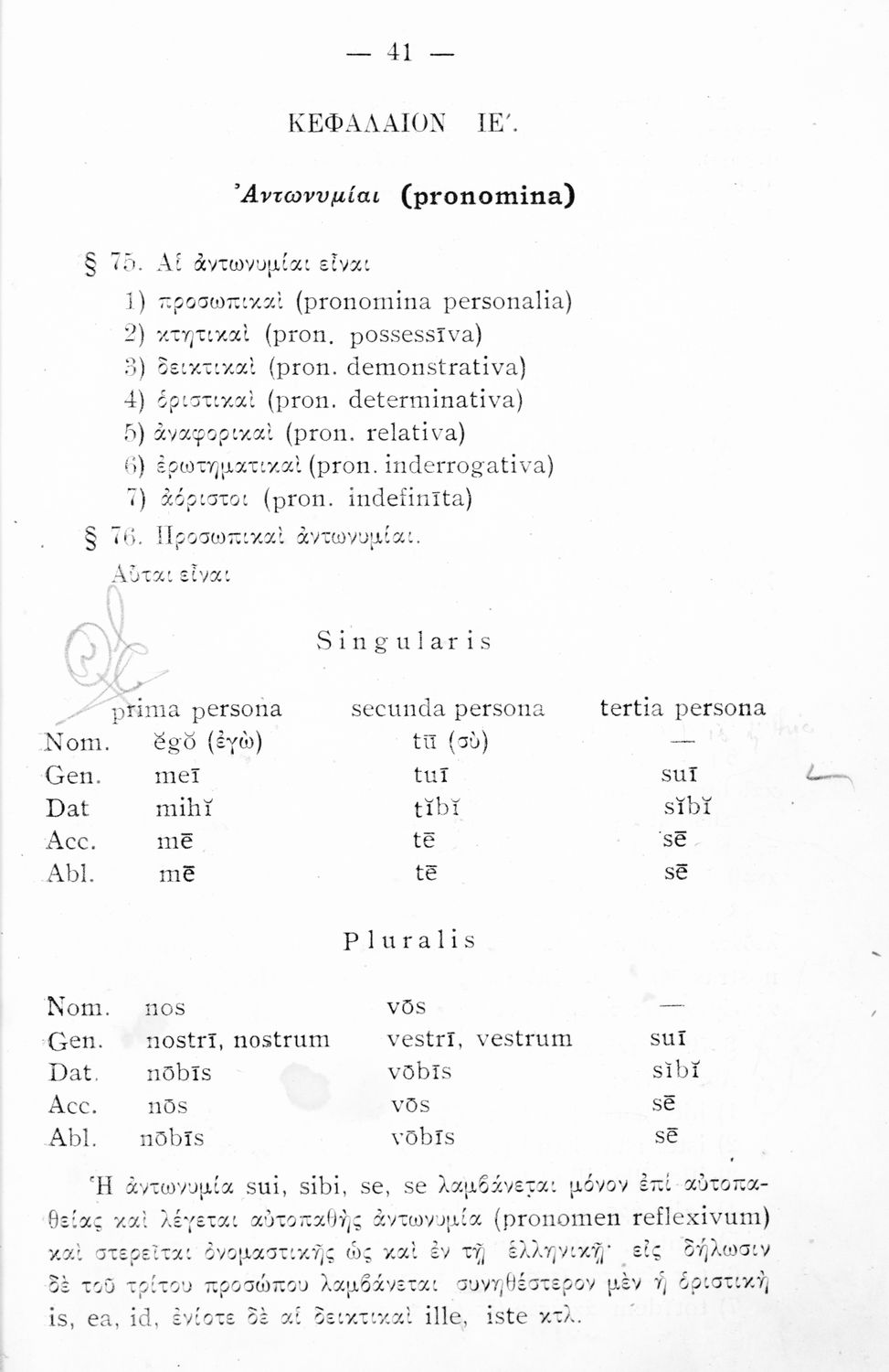 Σχολικό εγχειρίδιο Λατινικών που περιλαμβάνει τη γραμματική της λατινικής και είναι χωρισμένο στο φθογγολογικό, το τυπολογικό και το ετυμολογικό μέρος. Περιέχει και τους συντακτικούς κανόνες και τέσσερα παραρτήματα (Ρωμαϊκό ημερολόγιο, συντετμημένες λέξεις, Ρωμαϊκά νομίσματα, μέτρα και σταθμά και προσωδία - μετρική).