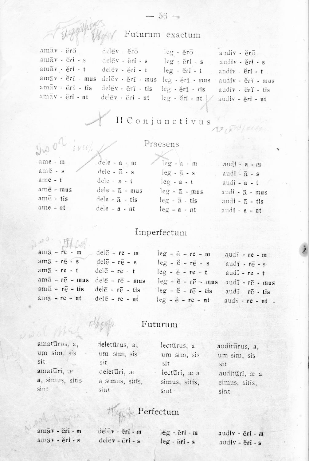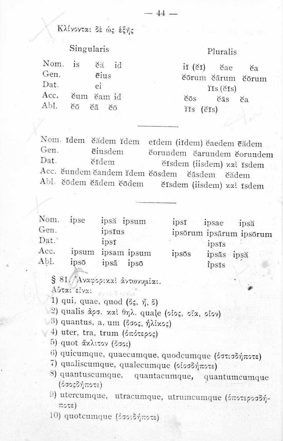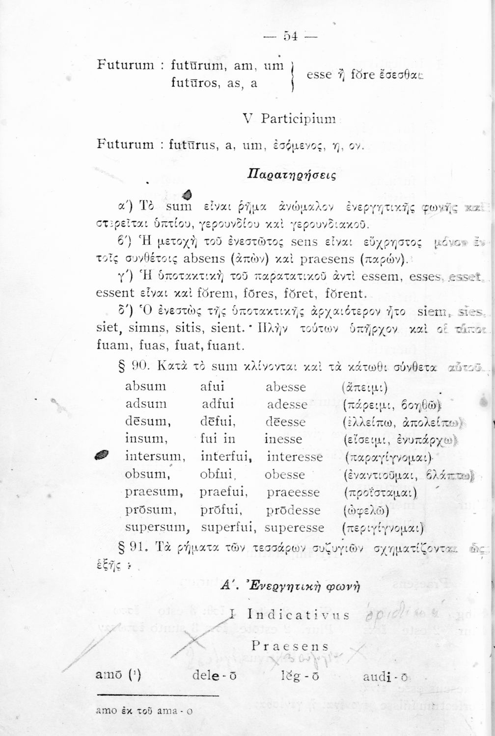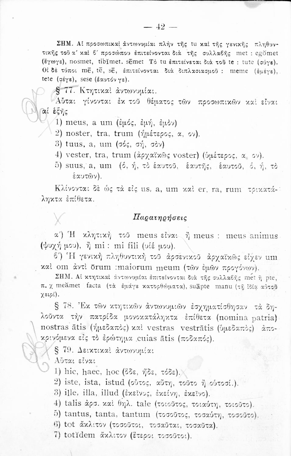 Σχολικό εγχειρίδιο Λατινικών που περιλαμβάνει τη γραμματική της λατινικής και είναι χωρισμένο στο φθογγολογικό, το τυπολογικό και το ετυμολογικό μέρος. Περιέχει και τους συντακτικούς κανόνες και τέσσερα παραρτήματα (Ρωμαϊκό ημερολόγιο, συντετμημένες λέξεις, Ρωμαϊκά νομίσματα, μέτρα και σταθμά και προσωδία - μετρική).