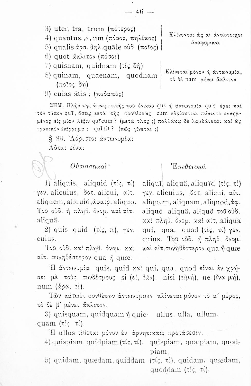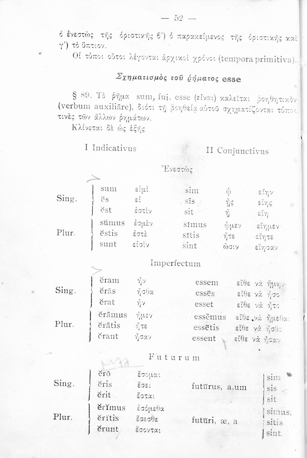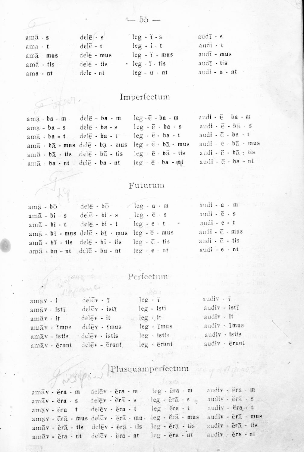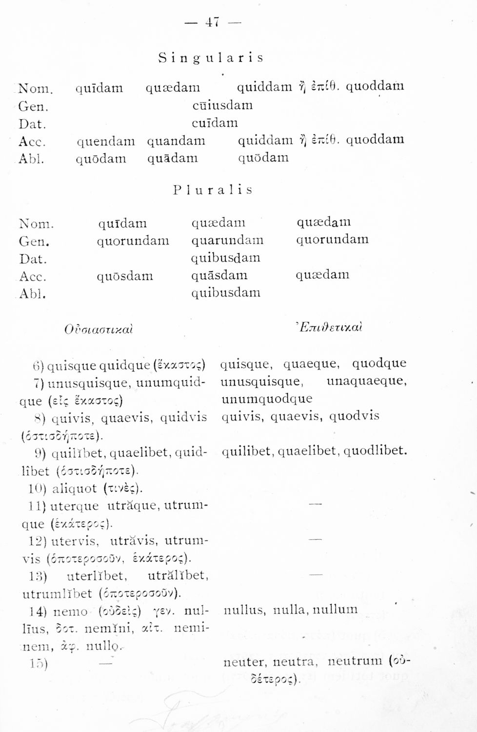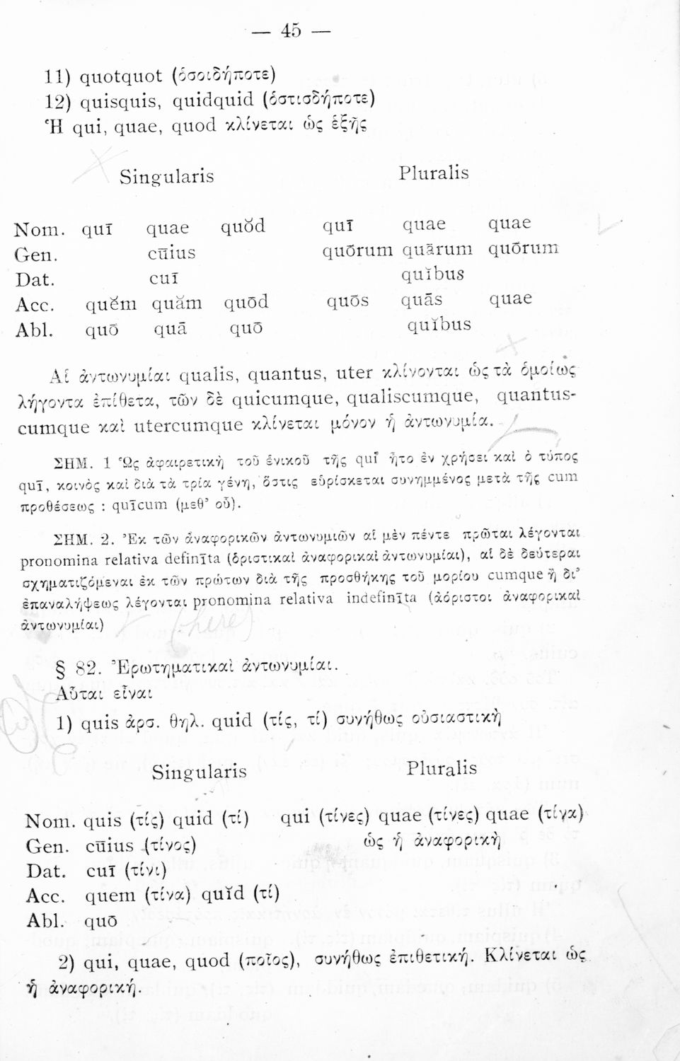 Σχολικό εγχειρίδιο Λατινικών που περιλαμβάνει τη γραμματική της λατινικής και είναι χωρισμένο στο φθογγολογικό, το τυπολογικό και το ετυμολογικό μέρος. Περιέχει και τους συντακτικούς κανόνες και τέσσερα παραρτήματα (Ρωμαϊκό ημερολόγιο, συντετμημένες λέξεις, Ρωμαϊκά νομίσματα, μέτρα και σταθμά και προσωδία - μετρική).