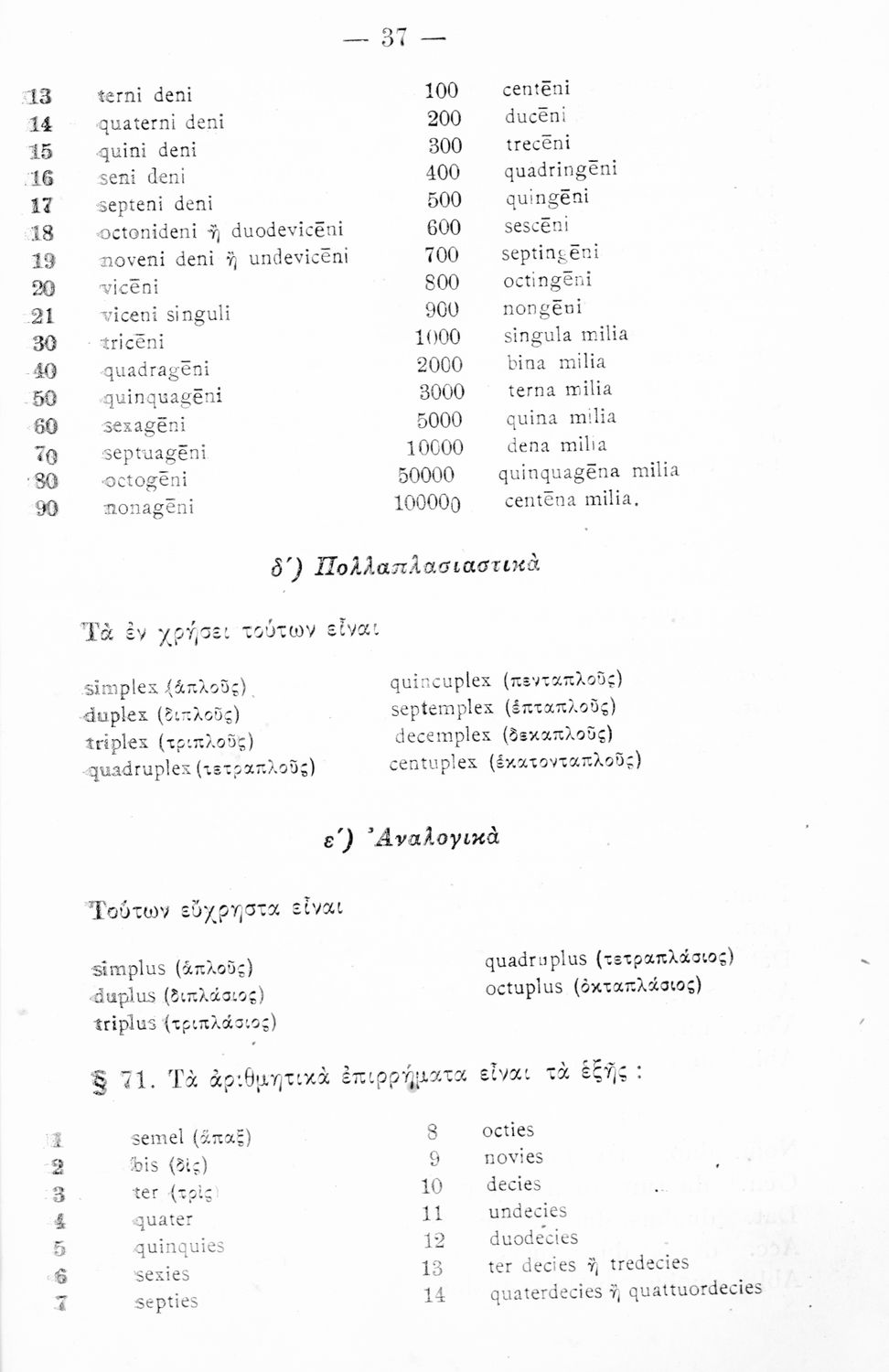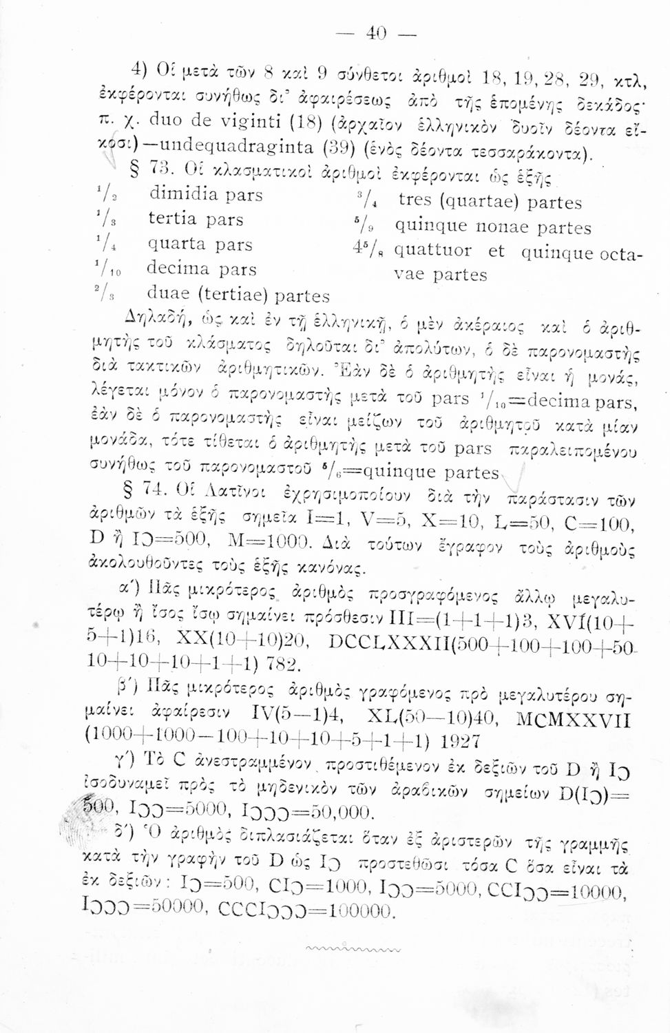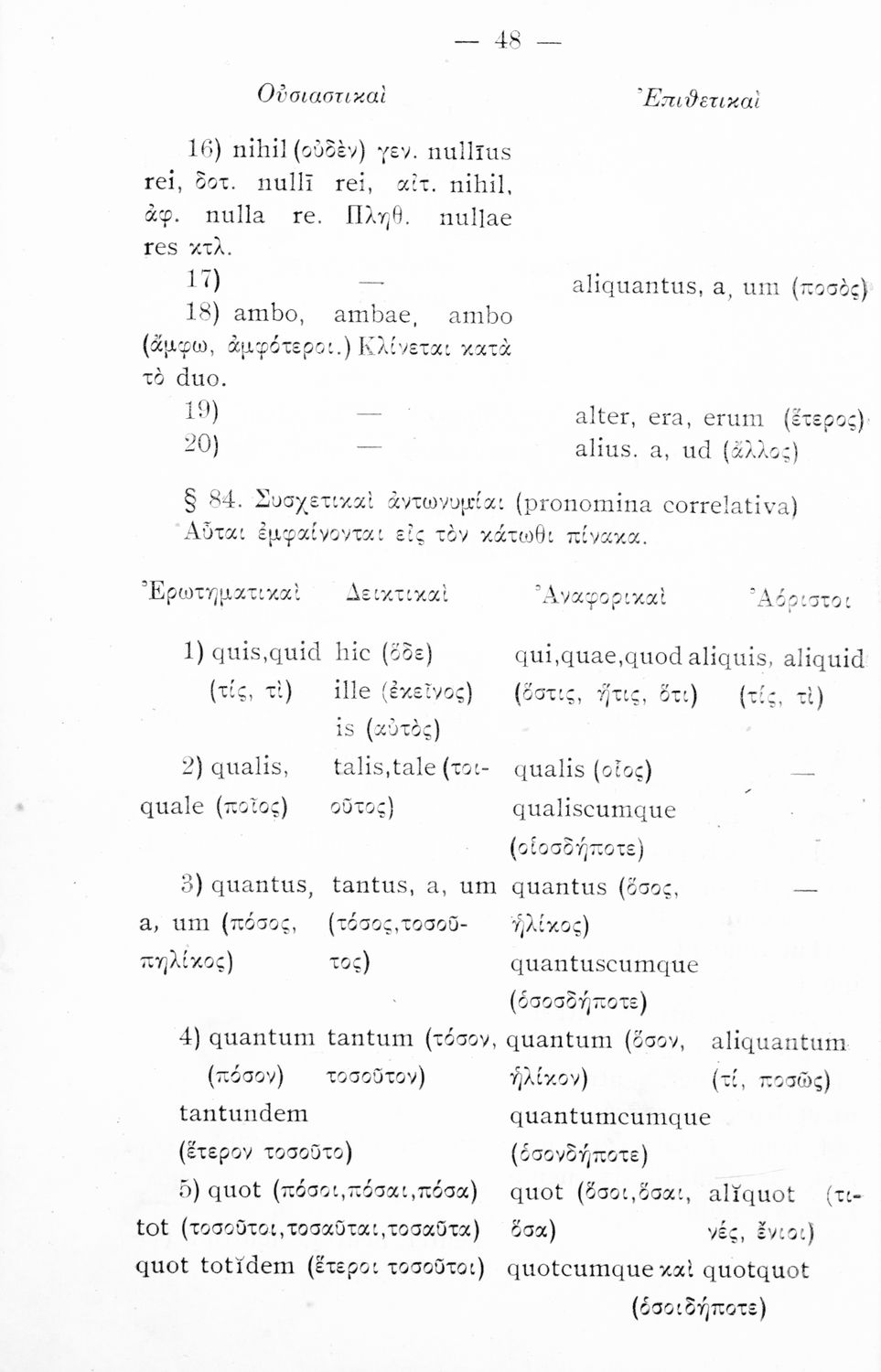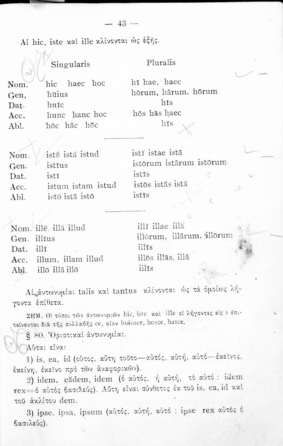 Σχολικό εγχειρίδιο Λατινικών που περιλαμβάνει τη γραμματική της λατινικής και είναι χωρισμένο στο φθογγολογικό, το τυπολογικό και το ετυμολογικό μέρος. Περιέχει και τους συντακτικούς κανόνες και τέσσερα παραρτήματα (Ρωμαϊκό ημερολόγιο, συντετμημένες λέξεις, Ρωμαϊκά νομίσματα, μέτρα και σταθμά και προσωδία - μετρική).