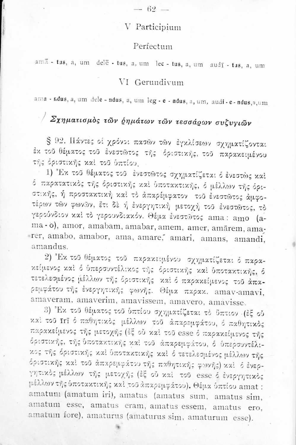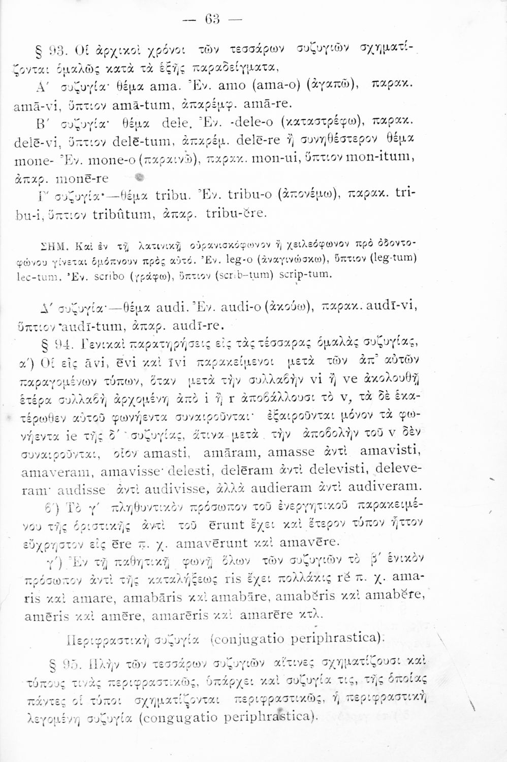 Γραμματικής της λατινικής γλώσσας για τα Ελληνικά Σχολεία και Γυμνάσια που περιέχει δύο τμήματα: το τεχνολογικό που εστιάζει στα μέρη του λόγου και το συντακτικό που ασχολείται με τις πτώσεις, τις εγκλίσεις, ...