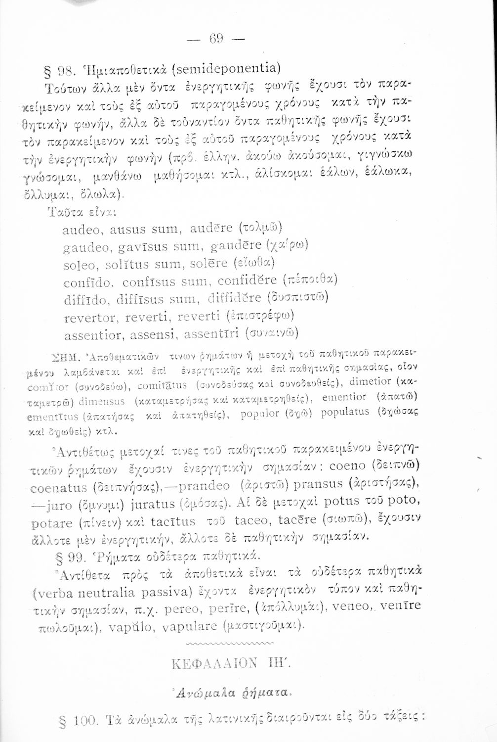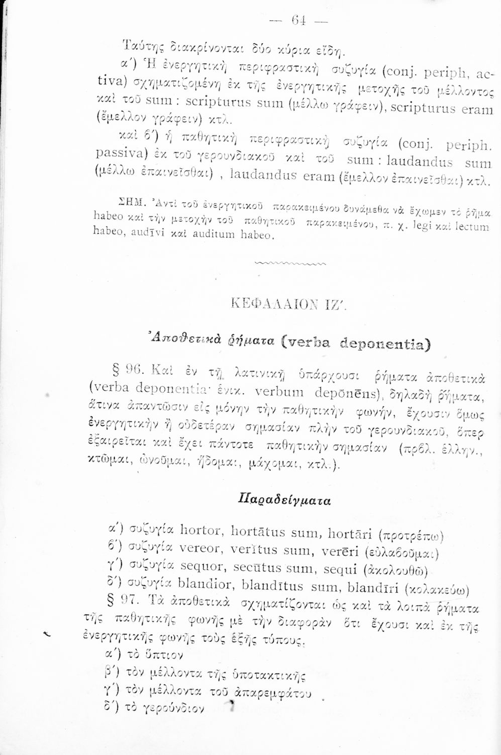 Σχολικό εγχειρίδιο Λατινικών Α΄, Β΄, Γ' Γυμνασίου που περιλαμβάνει γραμματική και συντακτικό και είναι χωρισμένο σε φθογγολογικό, τυπολογικό και ετυμολογικό μέρος.