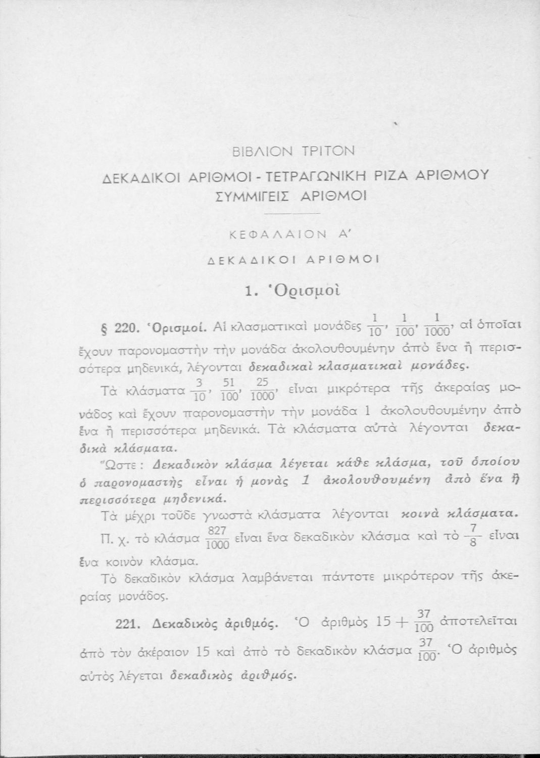 Βαθμίδα εκπαίδευσης: Δευτεροβάθμια Τάξη: Γυμνάσιο Μάθημα: Μαθηματικά Γλώσσα: Απλή καθαρεύουσα Παρουσίαση περιεχομένου: Σχολικό εγχειρίδιο Αριθμητικής Γυμνασίου που εστιάζει στις αριθμητικές πράξεις, τα κλάσματα και τις μεθόδους και είναι χωρισμένο σε θεωρία και ασκήσεις με έντονο επιχειρηματικό προσανατολισμό. Περιλαμβάνει στοιχεία Θεωρητικής Αριθμητικής. |