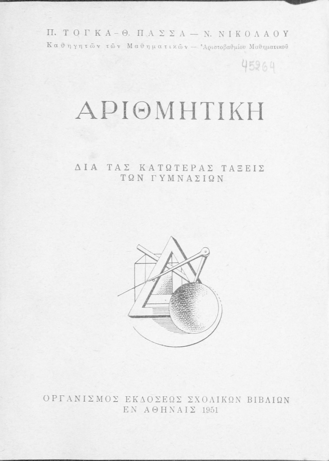Κωδικός αναγνώρισης: 01-45264 Τίτλος: Αριθμητική δια τας κατωτέρας τάξεις των Γυμνασίων Συγγραφέας: Π. Τόγκας, Θ. Πασσάς, Ν. Νικολάου Μέγεθος και υπόστρωμα: Σχολικό εγχειρίδιο, 20εκ., σκληρό εξώφυλλο, 375 σελίδες. |