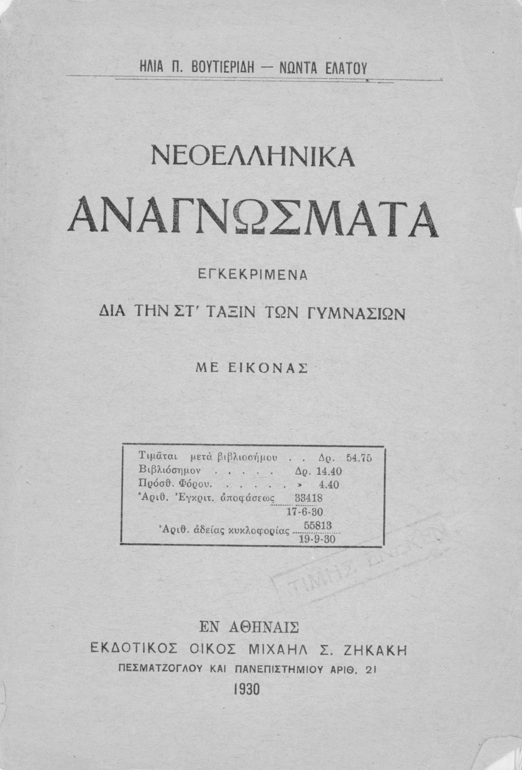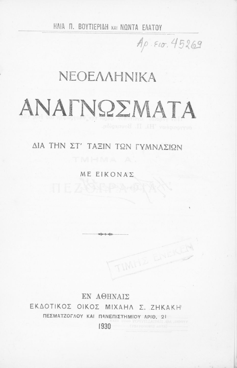 Τίτλος: Νεοελληνικά αναγνώσματα δια την ΣΤ΄ τάξιν των Γυμνασίων