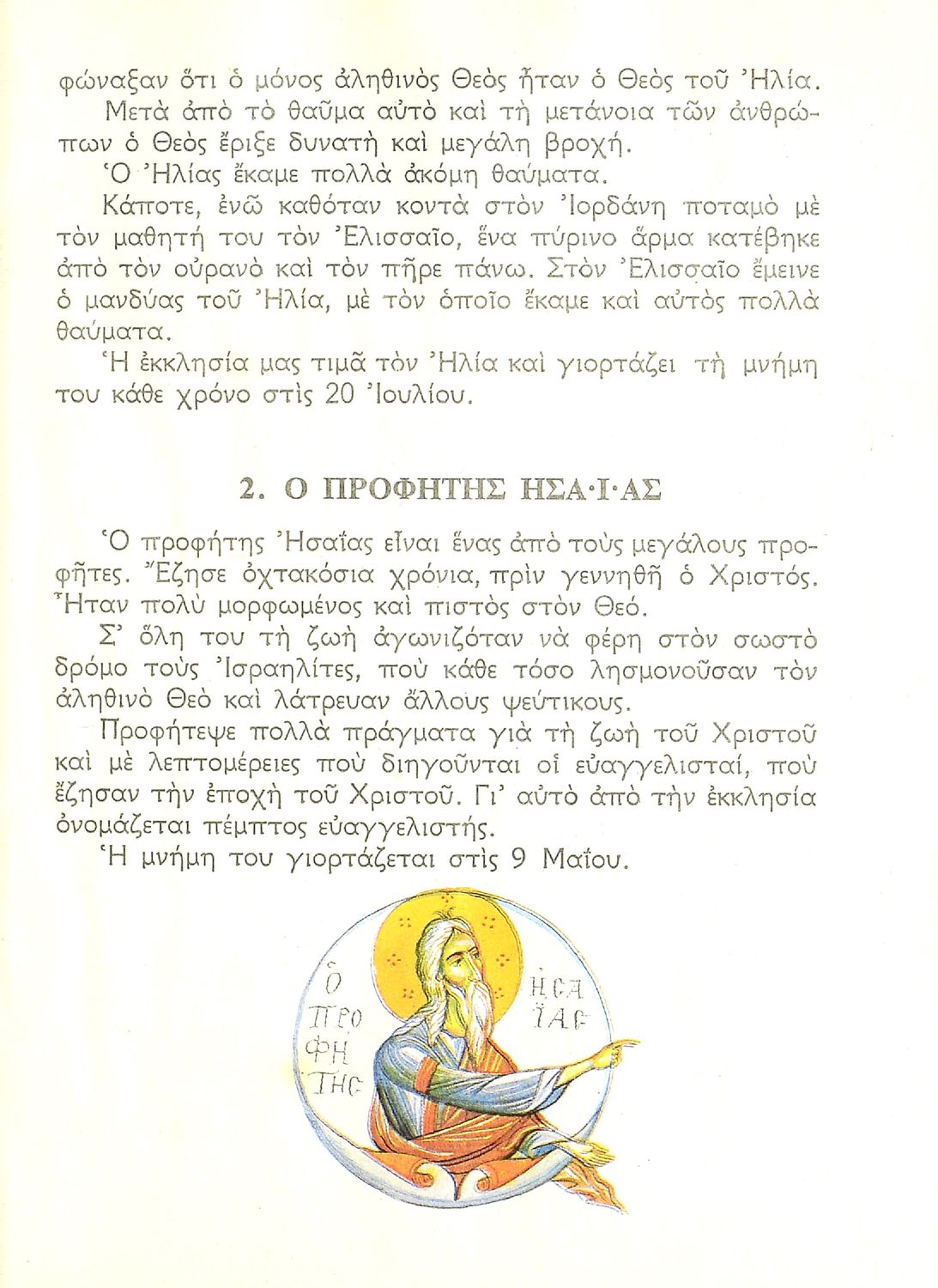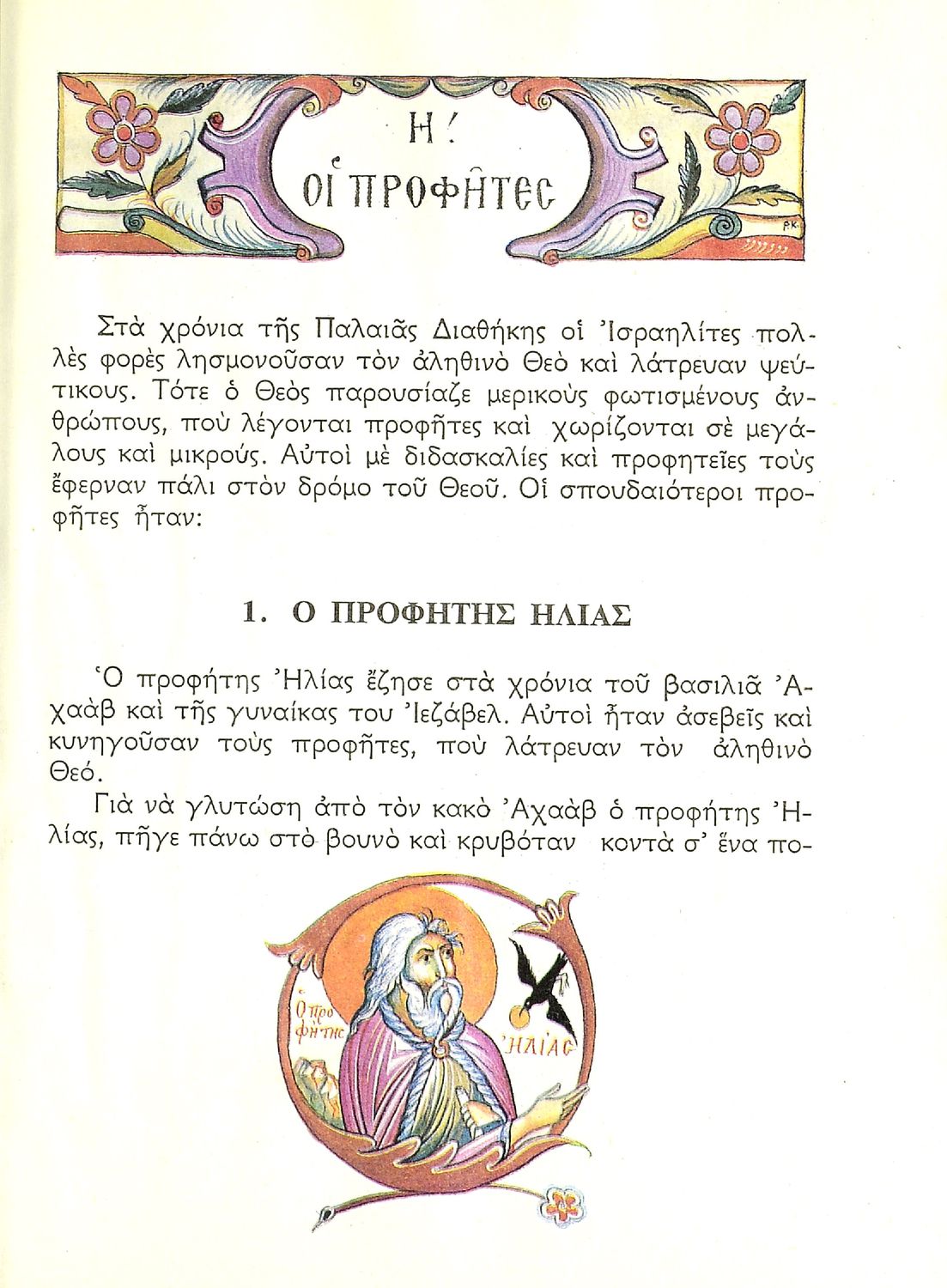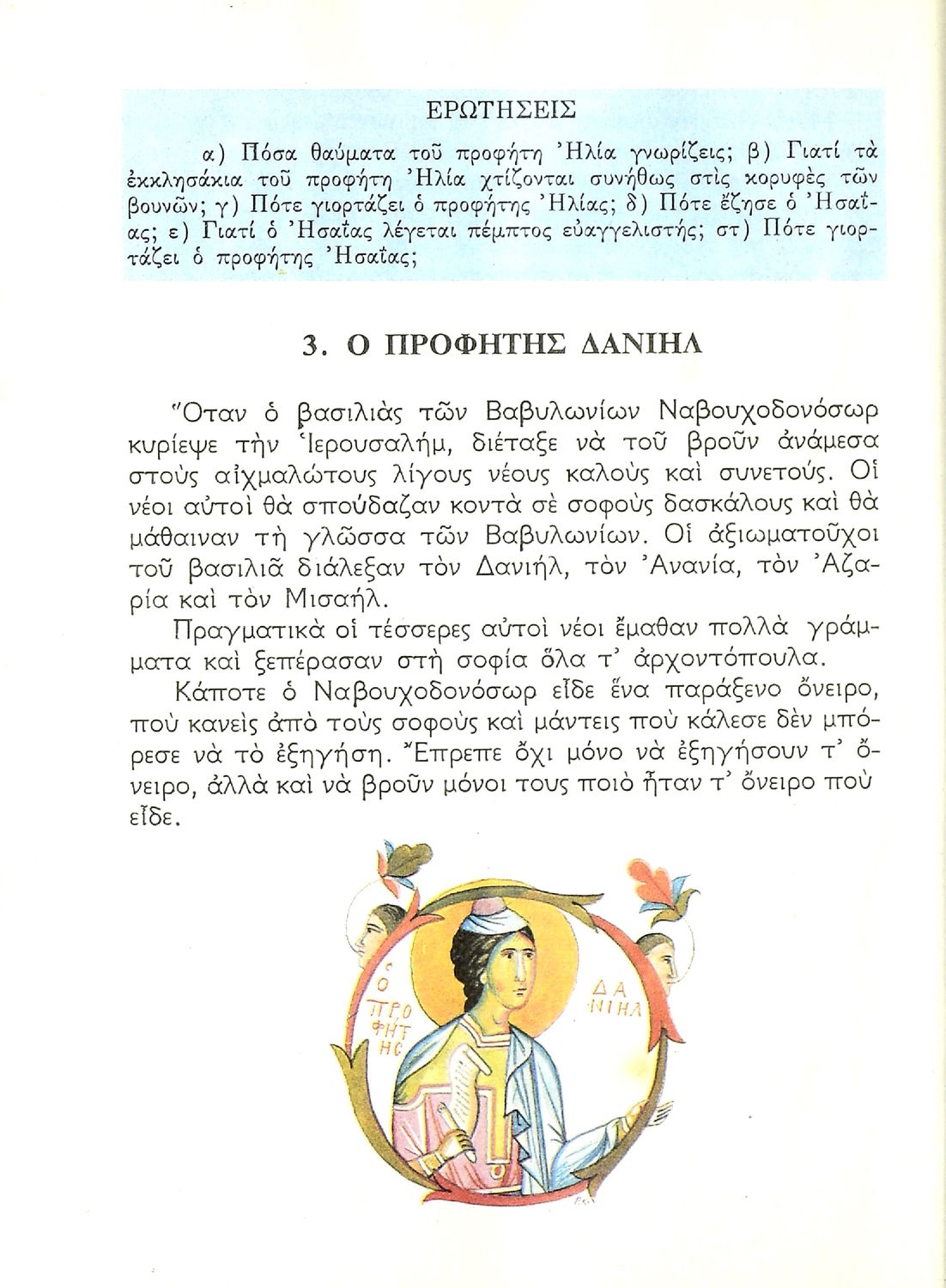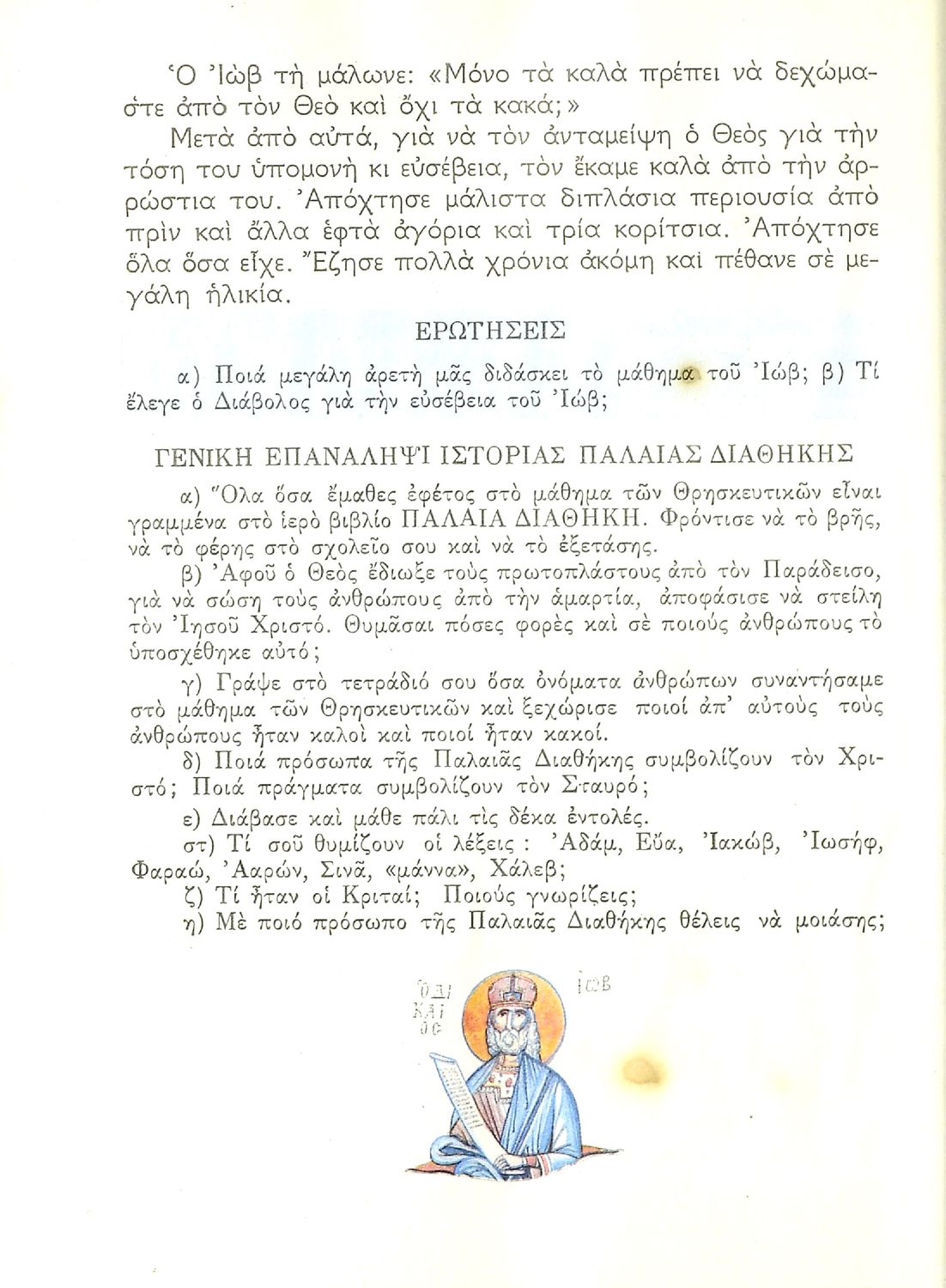 Σχολικό εγχειρίδιο Θρησκευτικών για τους μαθητές της Γ' Δημοτικού. Ενώ το βιβλίο αναφέρεται σε θέματα Παλαιάς Διαθήκης στο τέλος έχει γιορτές αγίων που έχουν σχέση με την ιστορία της Εκκλησίας.