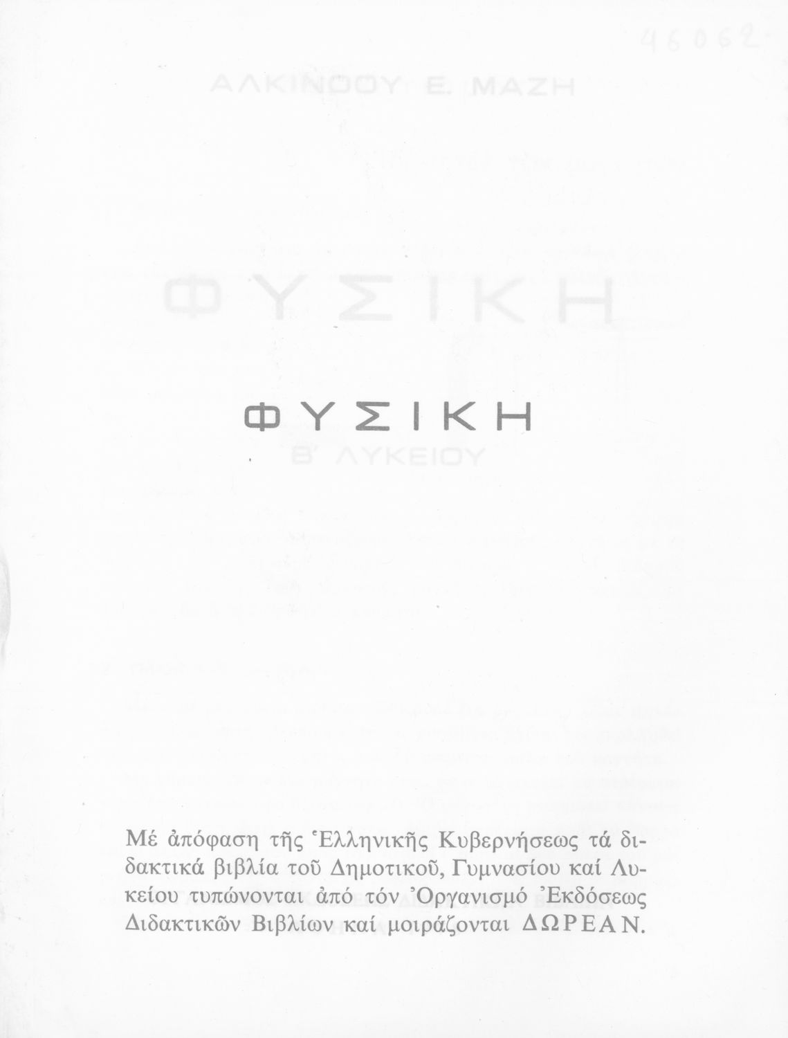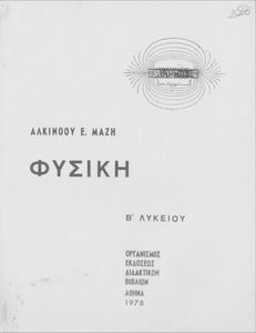 Κωδικός αναγνώρισης: 01-46062 Τίτλος: Φυσική Β΄ Λυκείου Συγγραφέας: Αλκίνοος Μάζης Μέγεθος και υπόστρωμα: Σχολικό εγχειρίδιο, μαλακό εξώφυλλο, 264 σελίδες. Εικόνες, σκίτσα ασπρόμαυρα. |