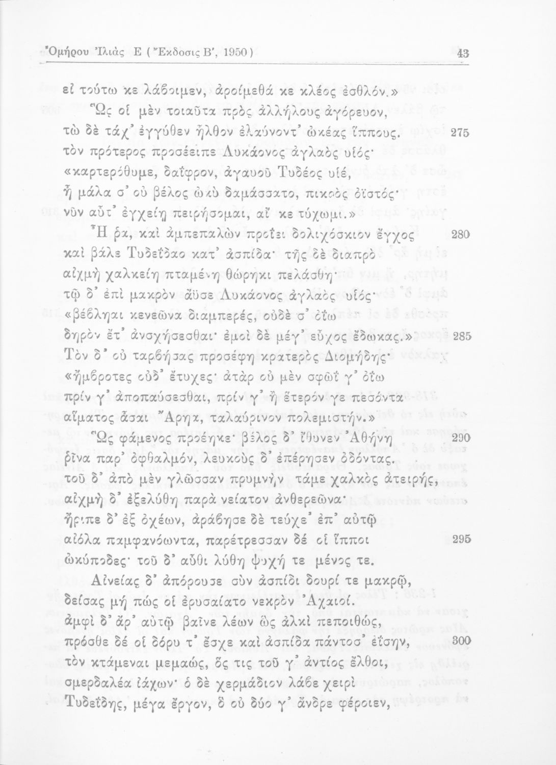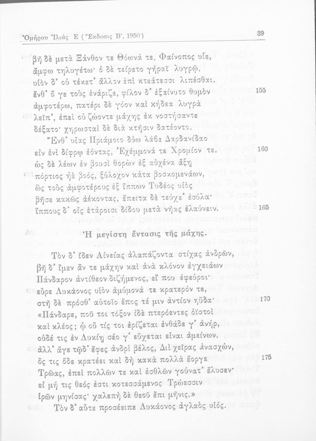 Σχολικό εγχειρίδιο Ε' Γυμνασίου για το μάθημα των Αρχαίων Ελληνικών. Περιλαμβάνει αποσπάσματα από ραψωδίες της Ιλιάδας, ερμηνευτικά και πραγματολογικά σχόλια και λεξιλογικές παρατηρήσεις.