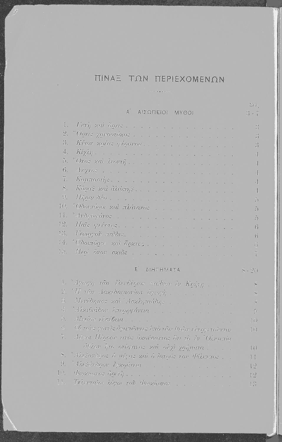 Σχολικό εγχειρίδιο Αρχαίων Ελληνικών Α΄ Γυμνασίου που περιλαμβάνει διηγήματα εμπνευσμένα από τους μύθους του Αισώπου, την αρχαία Ελλάδα, τις ελληνικές πόλεις και την ελληνική μυθολογία. Περιέχει λεξιλόγιο και πίνακα των κυριοτέρων ονομάτων..