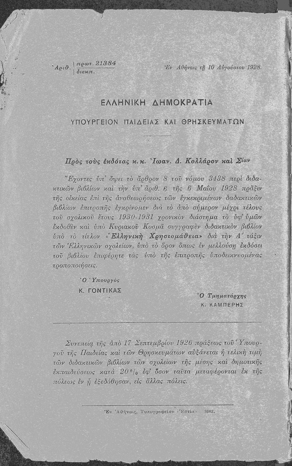 Υπουργική απόφαση / Σύμβαση: 21384/10-8-1928