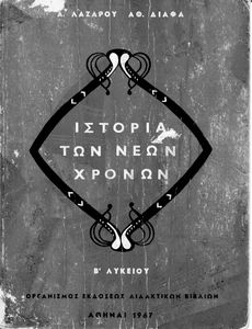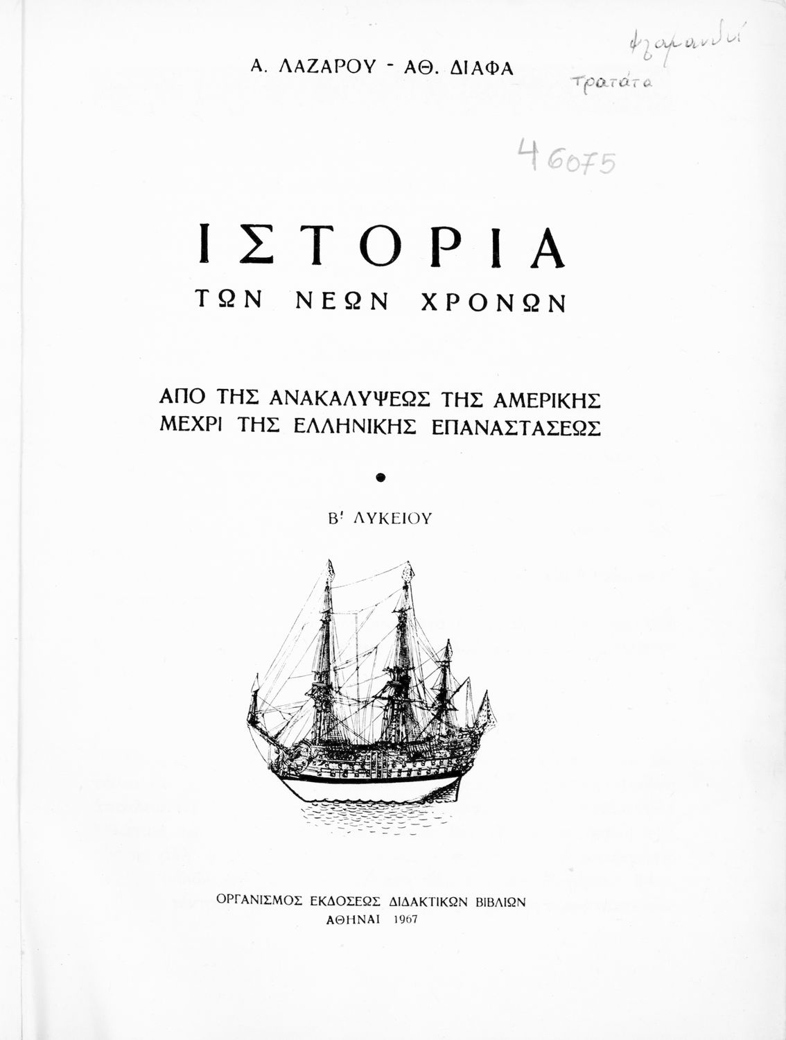 Κωδικός αναγνώρισης: 01-46075 Τίτλος: Ιστορία των Νέων Χρόνων από της ανακαλύψεως της Αμερικής μέχρι της Ελληνικής Επαναστάσεως Β΄ Λυκείου Συγγραφέας: Α. Λαζάρου, Α. Διάφας Εικονογράφος: Φωφώ Ανδρέου Μέγεθος και υπόστρωμα: Σχολικό εγχειρίδιο, σκληρό εξώφυλλο, 350 σελίδες. Σκίτσα, χάρτης, εικόνες (ασπρόμαυρα). |