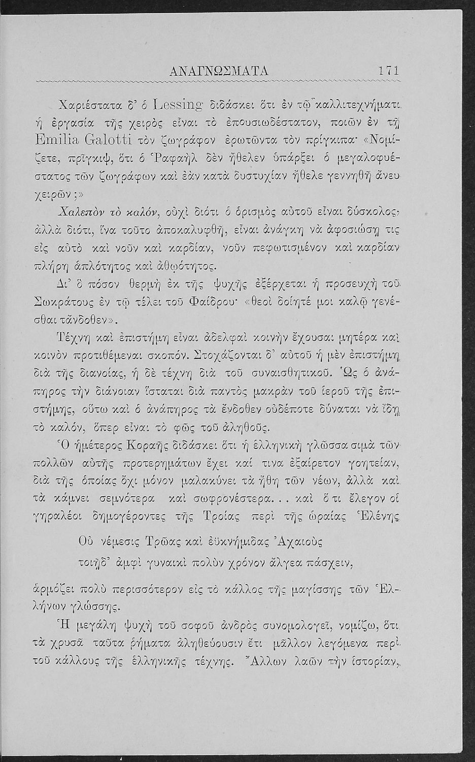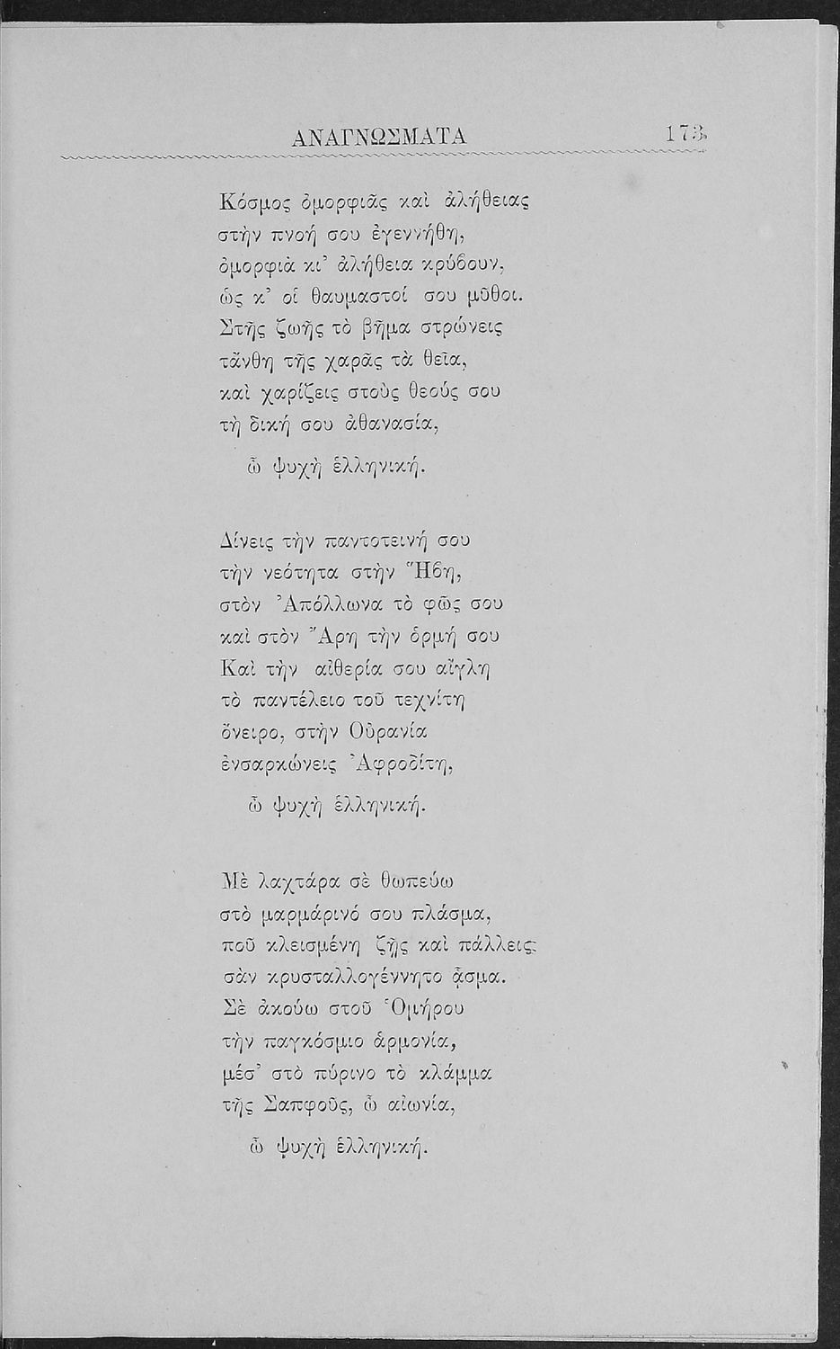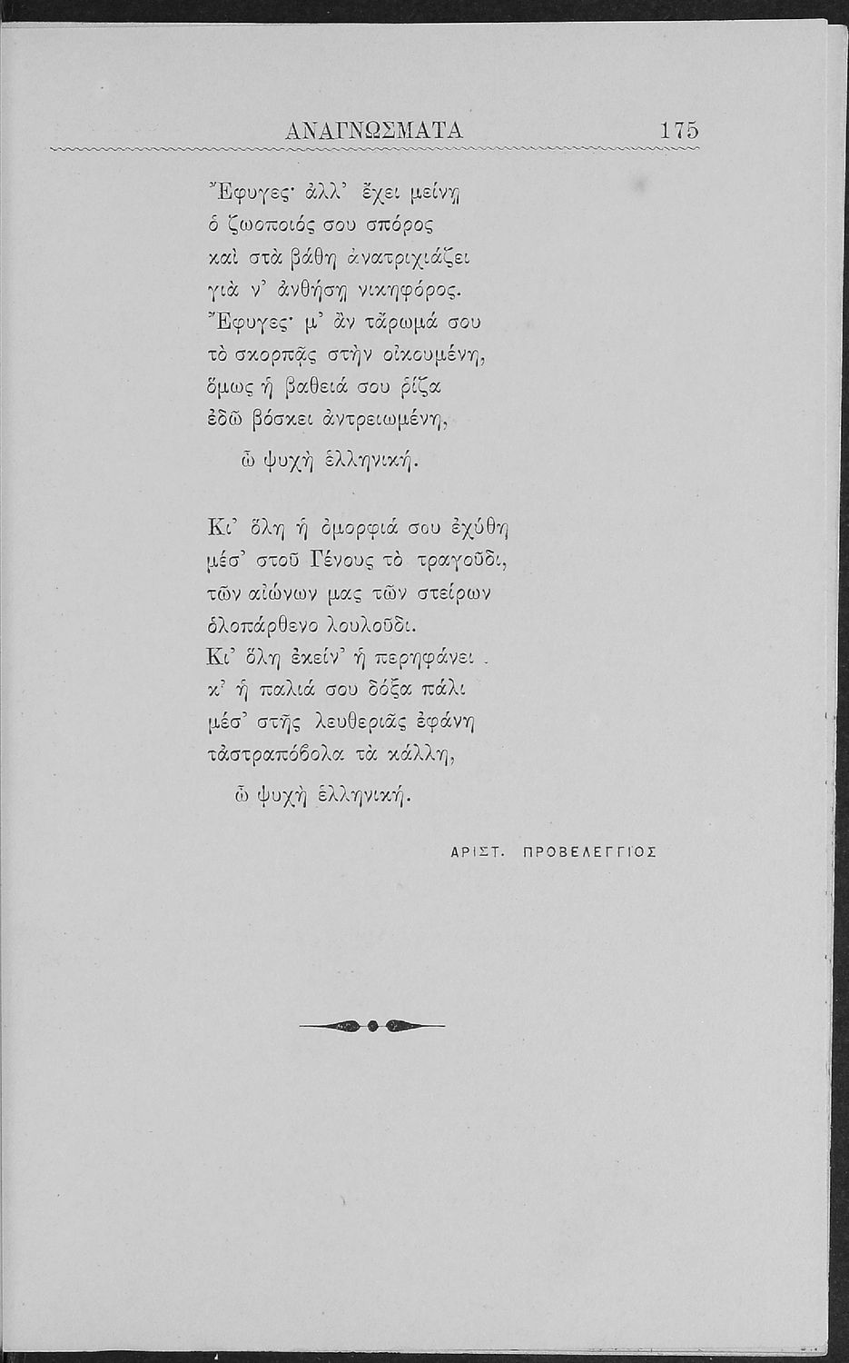 Σχολικό εγχειρίδιο Νέων Ελληνικών για όλες τις τάξεις του Γυμνασίου με πεζά και ποιήματα Ελλήνων λογοτεχνών και ποιητών. Η θεματολογία του από την αρχαιότητα και την ιστορική ζωή του τόπου. Το βιβλίο είχε εγκριθεί για μια τετραετία από το 1909-1913.