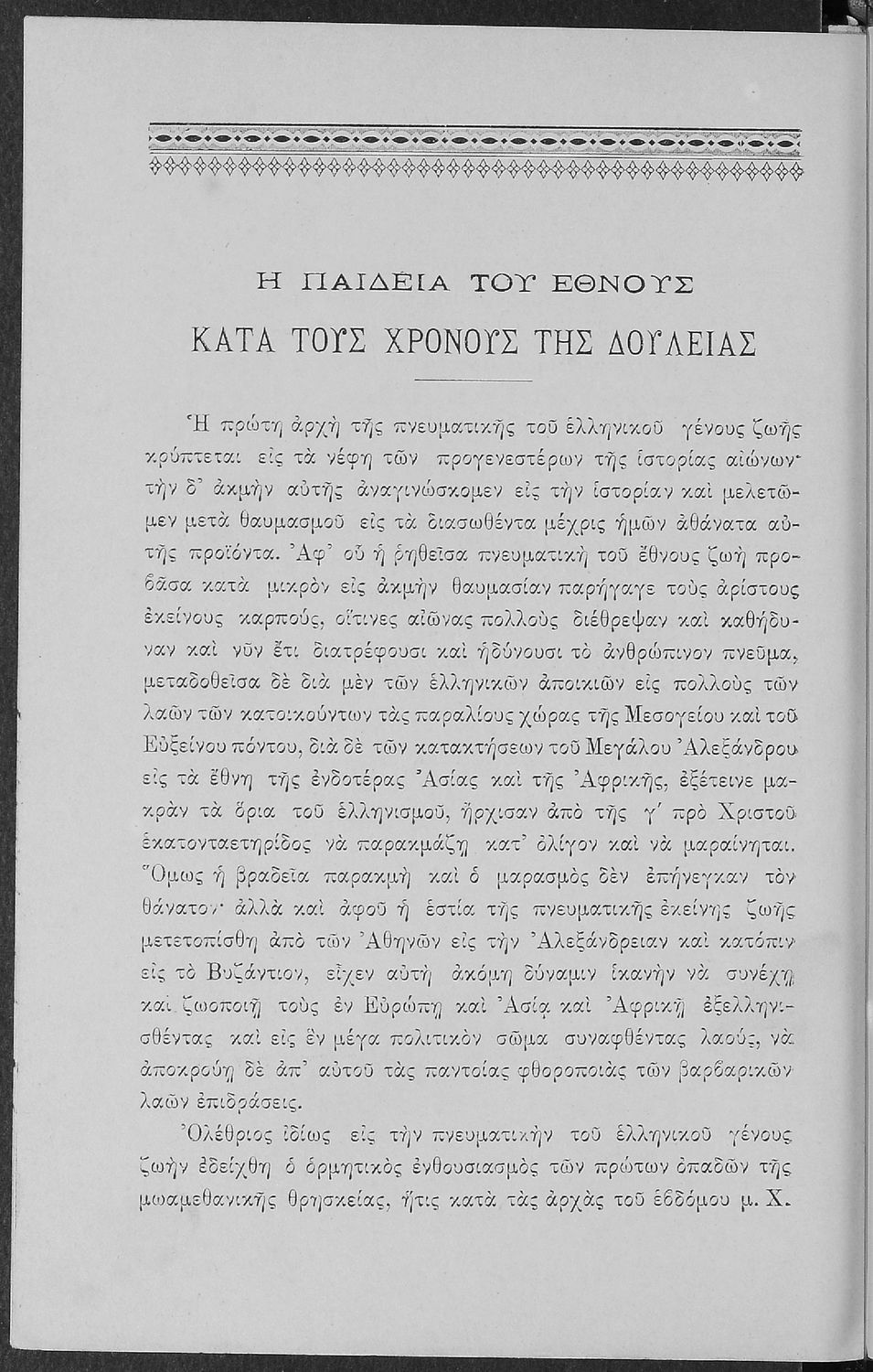 Σχολικό εγχειρίδιο Νέων Ελληνικών του 1889. Περιέχει πεζά και ποιήματα Ελλήνων λογοτεχνών εμπνευσμένα από την καθημερινή και ιστορική ζωή του τόπου. Έχει την έγκριση του Υπουργείου Δημόσιας Εκπαίδευσης.