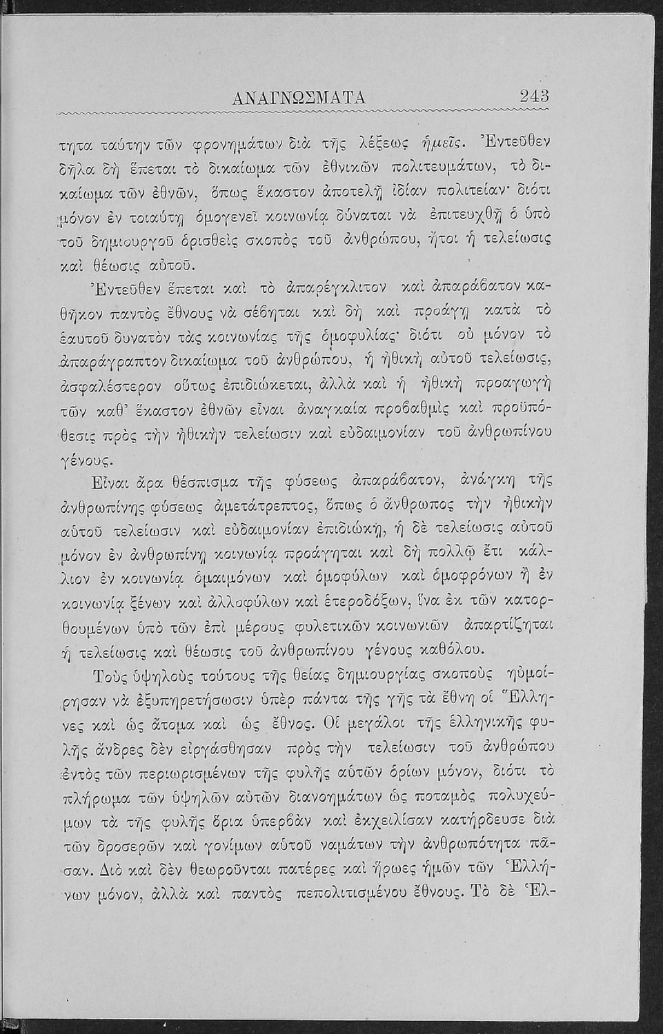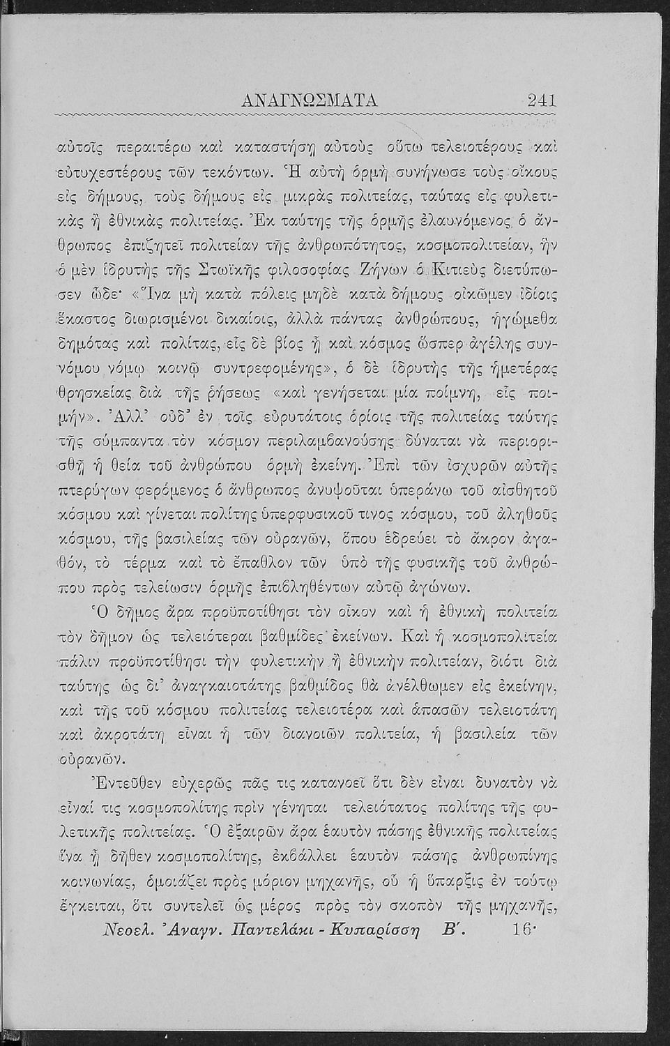 Σχολικό εγχειρίδιο Νέων Ελληνικών για όλες τις τάξεις του Γυμνασίου με πεζά και ποιήματα Ελλήνων λογοτεχνών και ποιητών. Η θεματολογία του από την αρχαιότητα και την ιστορική ζωή του τόπου. Το βιβλίο είχε εγκριθεί για μια τετραετία από το 1909-1913.